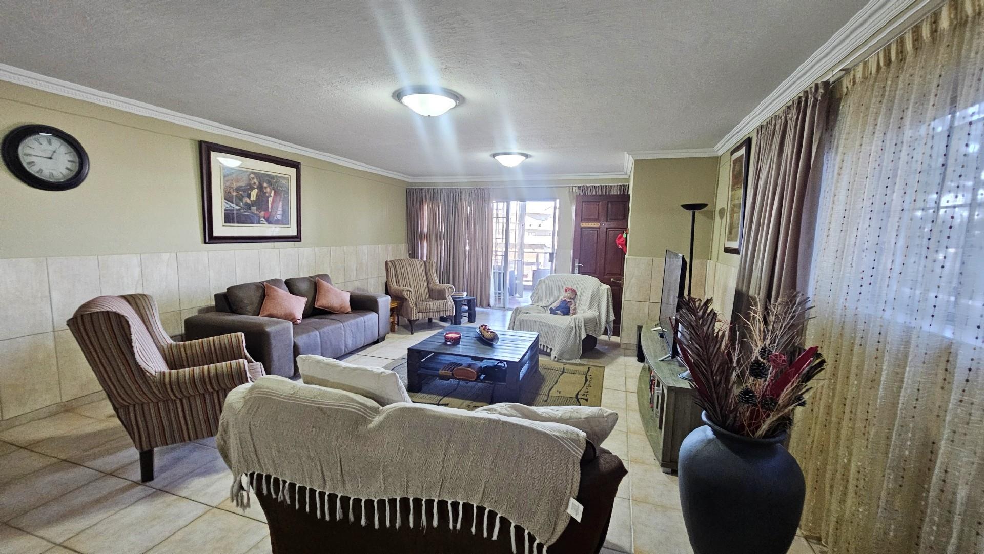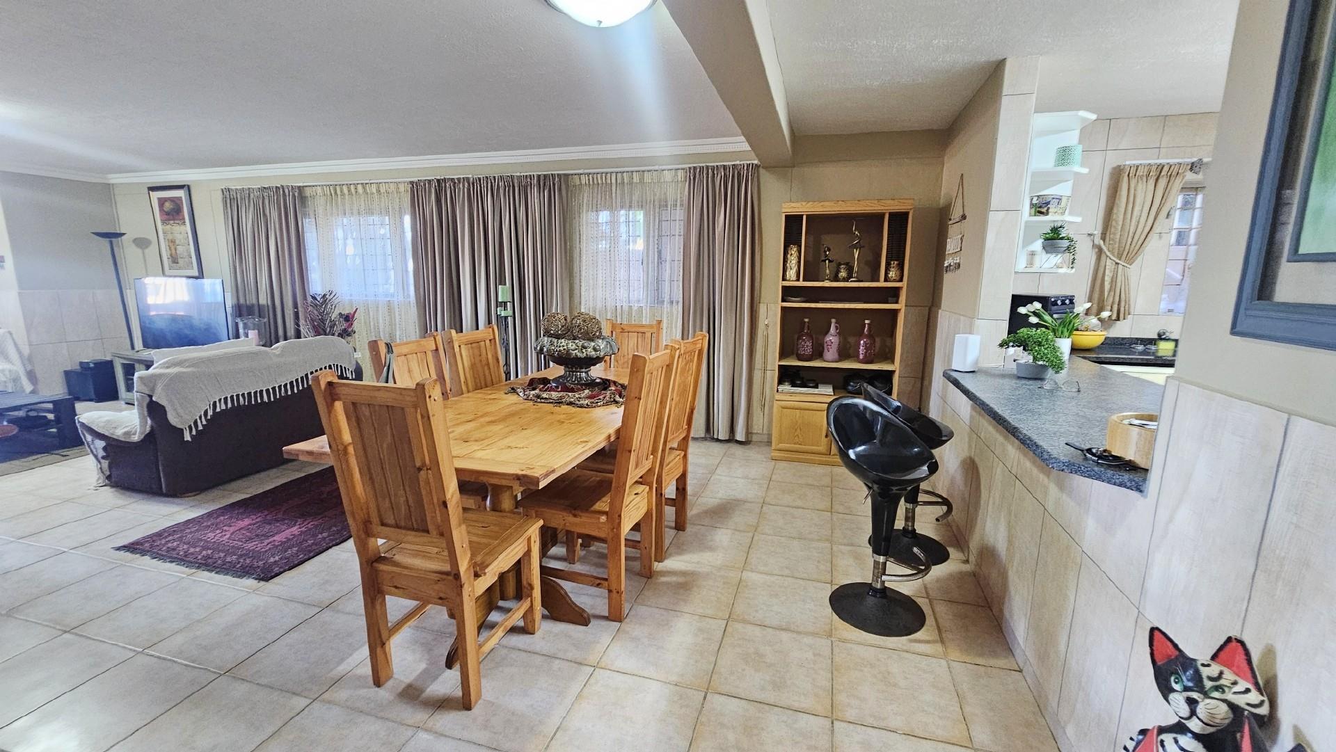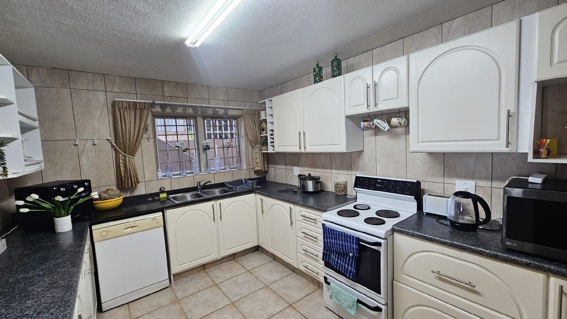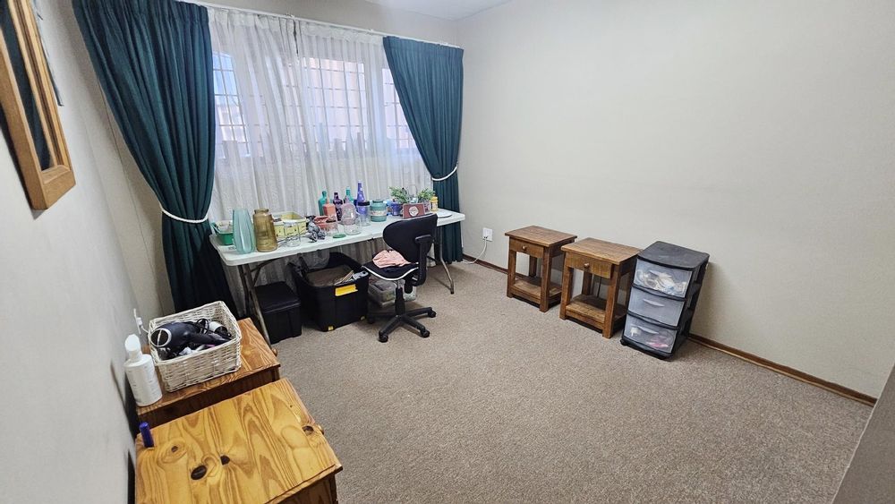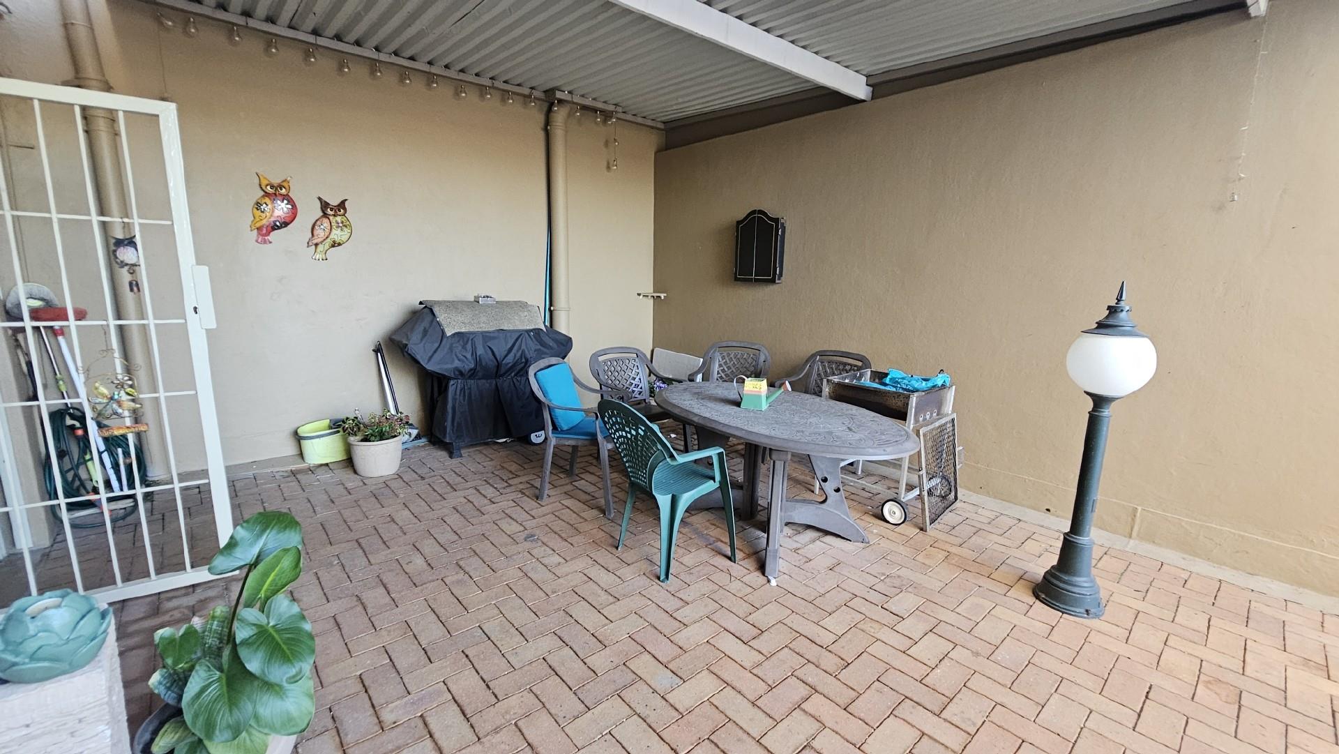 The kitchen is generously proportioned, fitted with ample cabinetry, melamine tops, a freestanding stove, prep basin, and a convenient breakfast nook. Flowing seamlessly from the kitchen, a charming dining area sets the stage for intimate dinners with family and friends. The main bedroom is a serene retreat, boasting abundant wardrobe space, private access to the patio, air‐conditioning, and a luxurious ensuite bathroom with a double basin. The remaining three bedrooms share a second well‐appointed bathroom. Each bedroom is carpeted, with ample cupboard space, natural light, and a fresh, airy feel. At the back of the unit, a spacious laundry area is fitted with multiple washing machines and tumble dryers, ensuring effortless convenience. From here, you step out onto a second undercover patio that leads to your very own private swimming pool, the only unit in the complex to enjoy this exclusive feature.