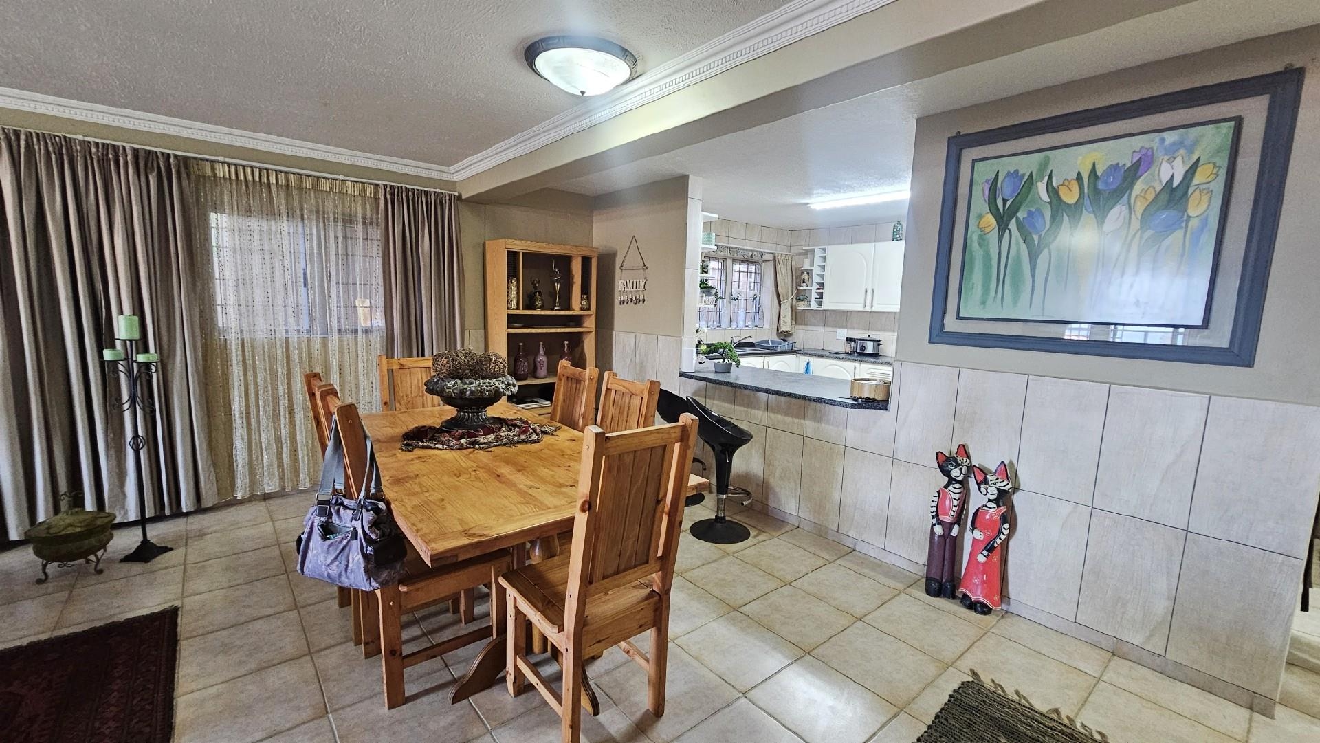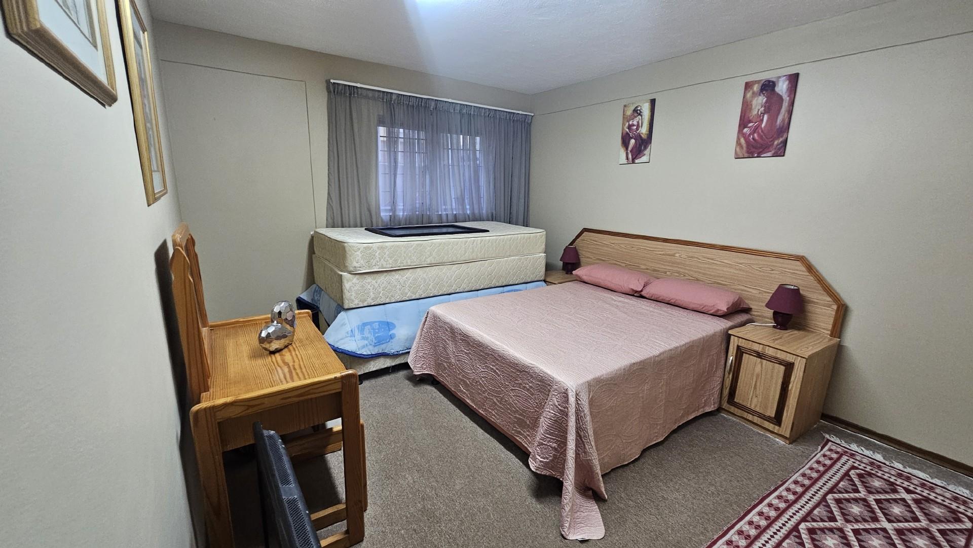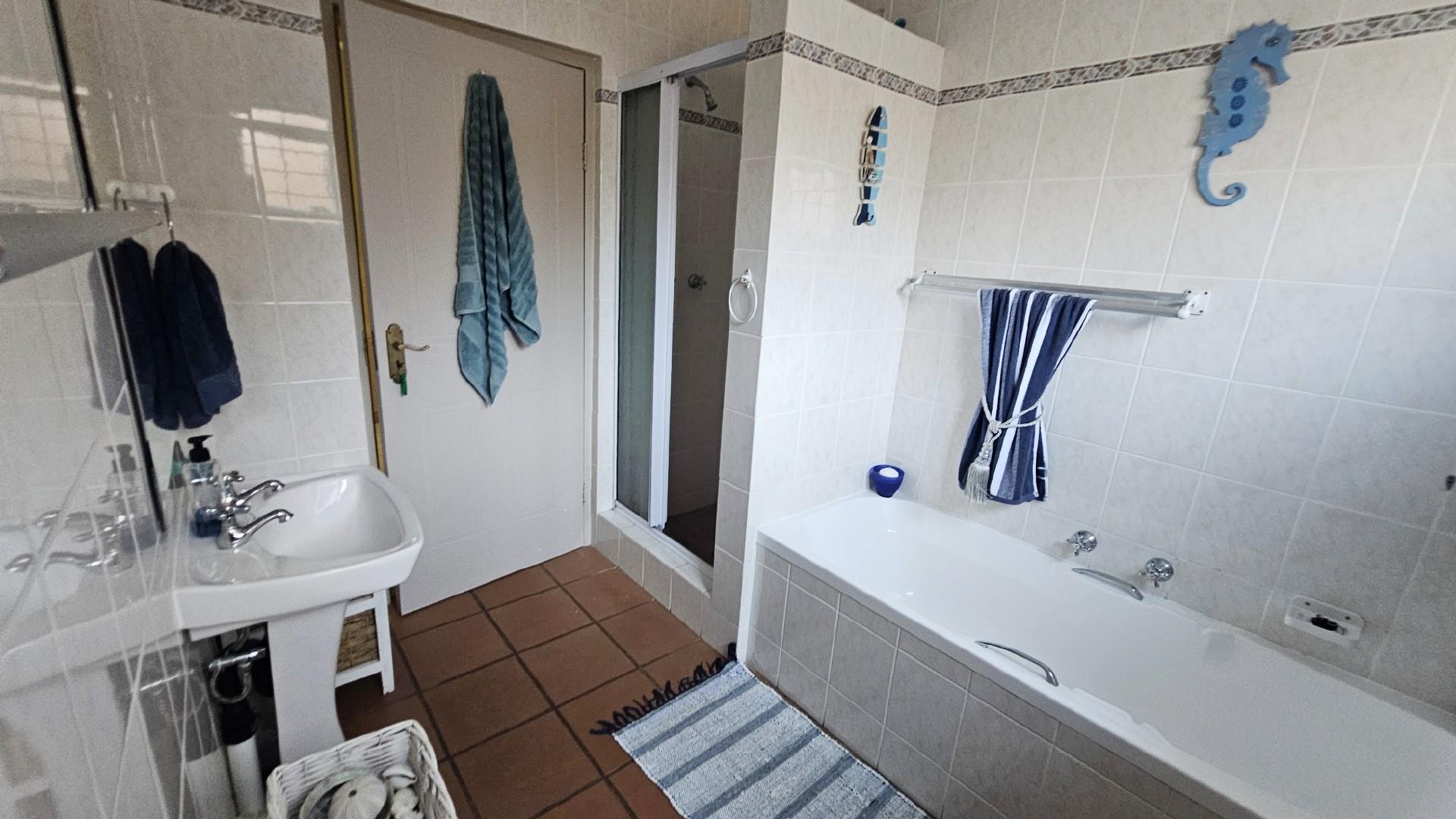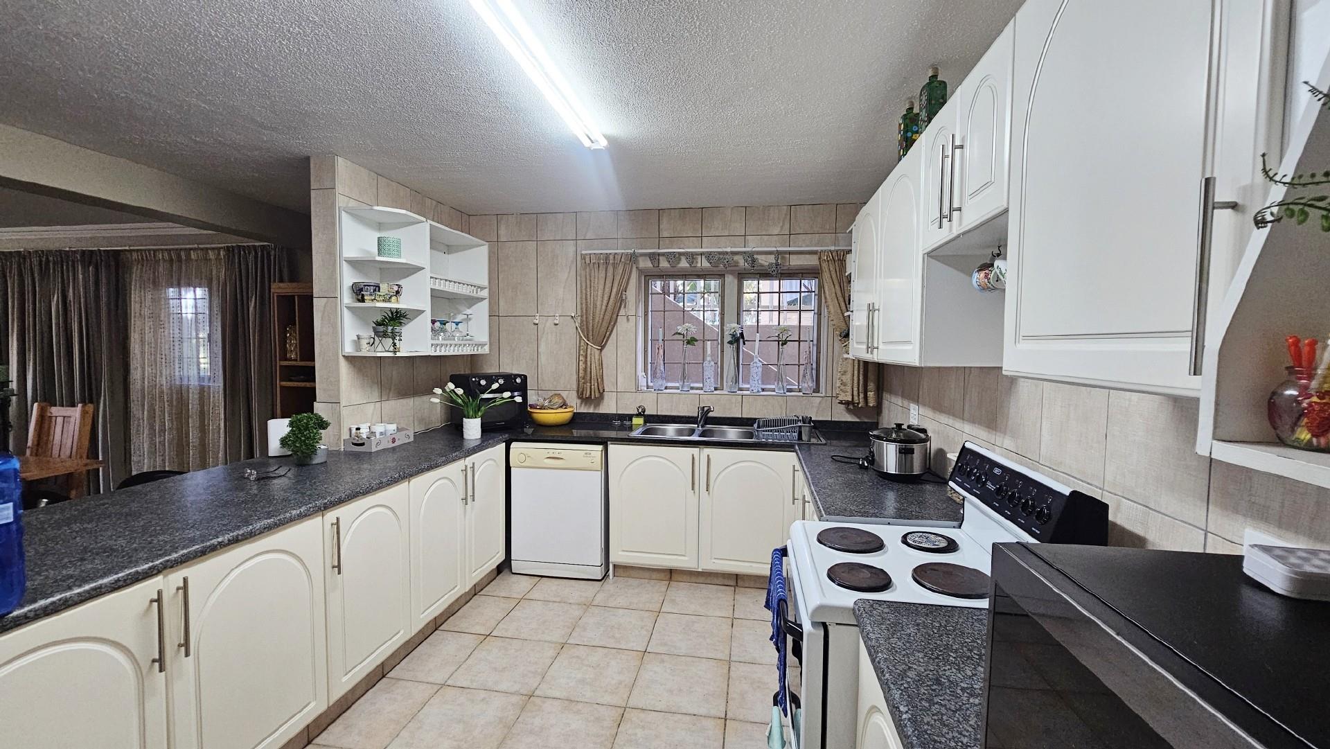 The kitchen is generously proportioned, fitted with ample cabinetry, melamine tops, a freestanding stove, prep basin, and a convenient breakfast nook. Flowing seamlessly from the kitchen, a charming dining area sets the stage for intimate dinners with family and friends. The main bedroom is a serene retreat, boasting abundant wardrobe space, private access to the patio, air‐conditioning, and a luxurious ensuite bathroom with a double basin. The remaining three bedrooms share a second well‐appointed bathroom. Each bedroom is carpeted, with ample cupboard space, natural light, and a fresh, airy feel. At the back of the unit, a spacious laundry area is fitted with multiple washing machines and tumble dryers, ensuring effortless convenience. From here, you step out onto a second undercover patio that leads to your very own private swimming pool, the only unit in the complex to enjoy this exclusive feature.