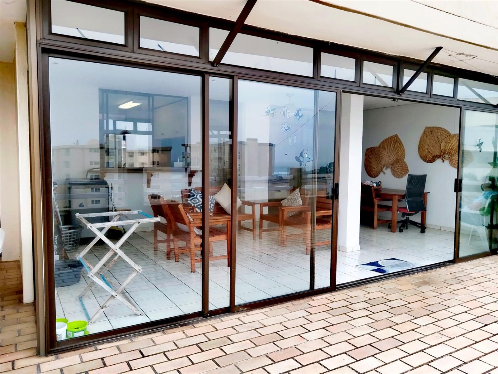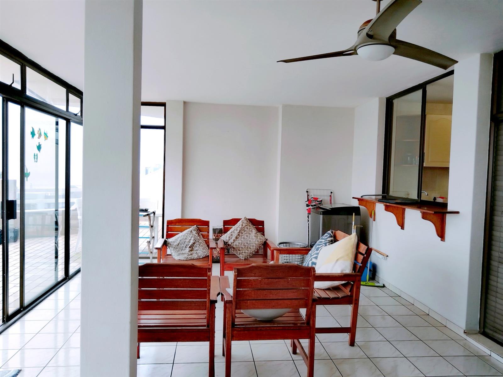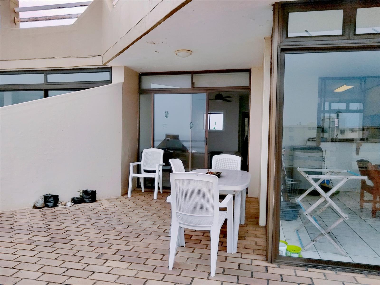 This fully furnished penthouse on the third floor offers space and great sea views overlooking other beachfront properties. The complex is less than 500m to the popular Lucien Beach and less than 1km from the main Margate beach. The two guest bedrooms are spacious with ceiling fans and complex views. The luxury main bedroom is spacious and have a sliding door to a private open balcony area with sea views. The open plan lounge, dining room and kitchen is specious, well laid out and the kitchen has a serving hatch to the entertainment room area that is part of the enclosed balcony. Enough space for a second lounge and dining area or entertainment. The big open balcony is ideal for entertaining and a braai with friends and family while smelling the ocean and hearing the breakers in the background.