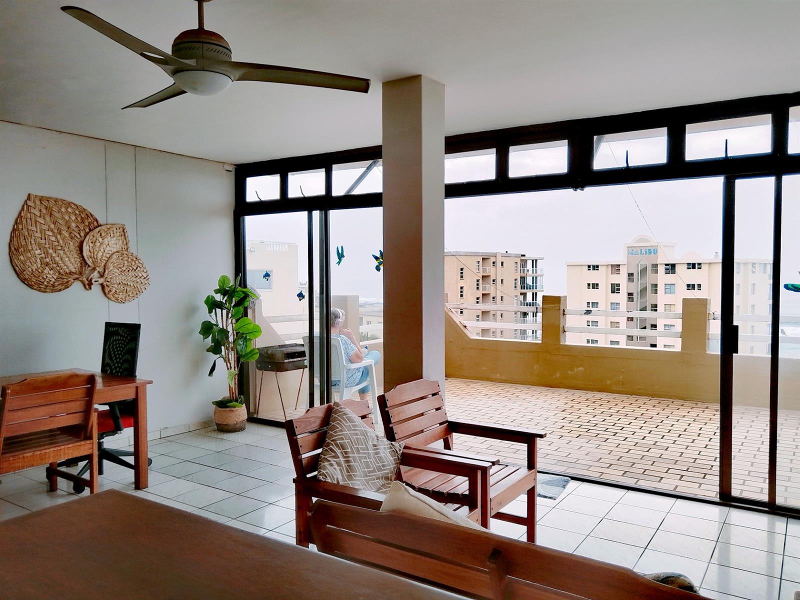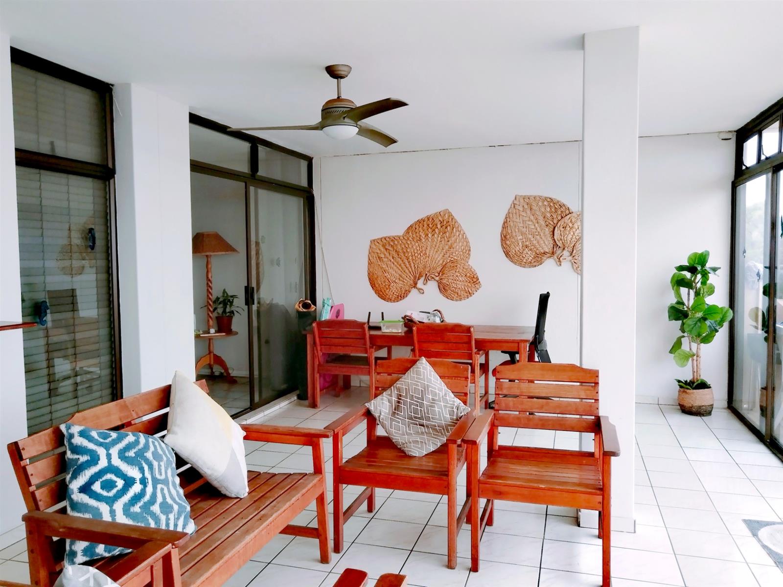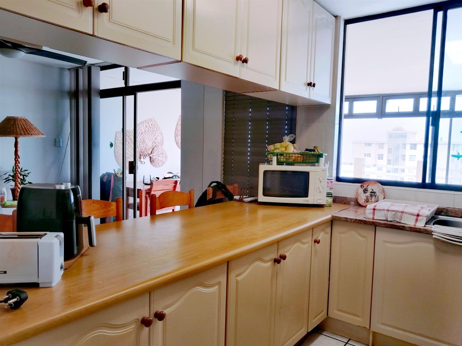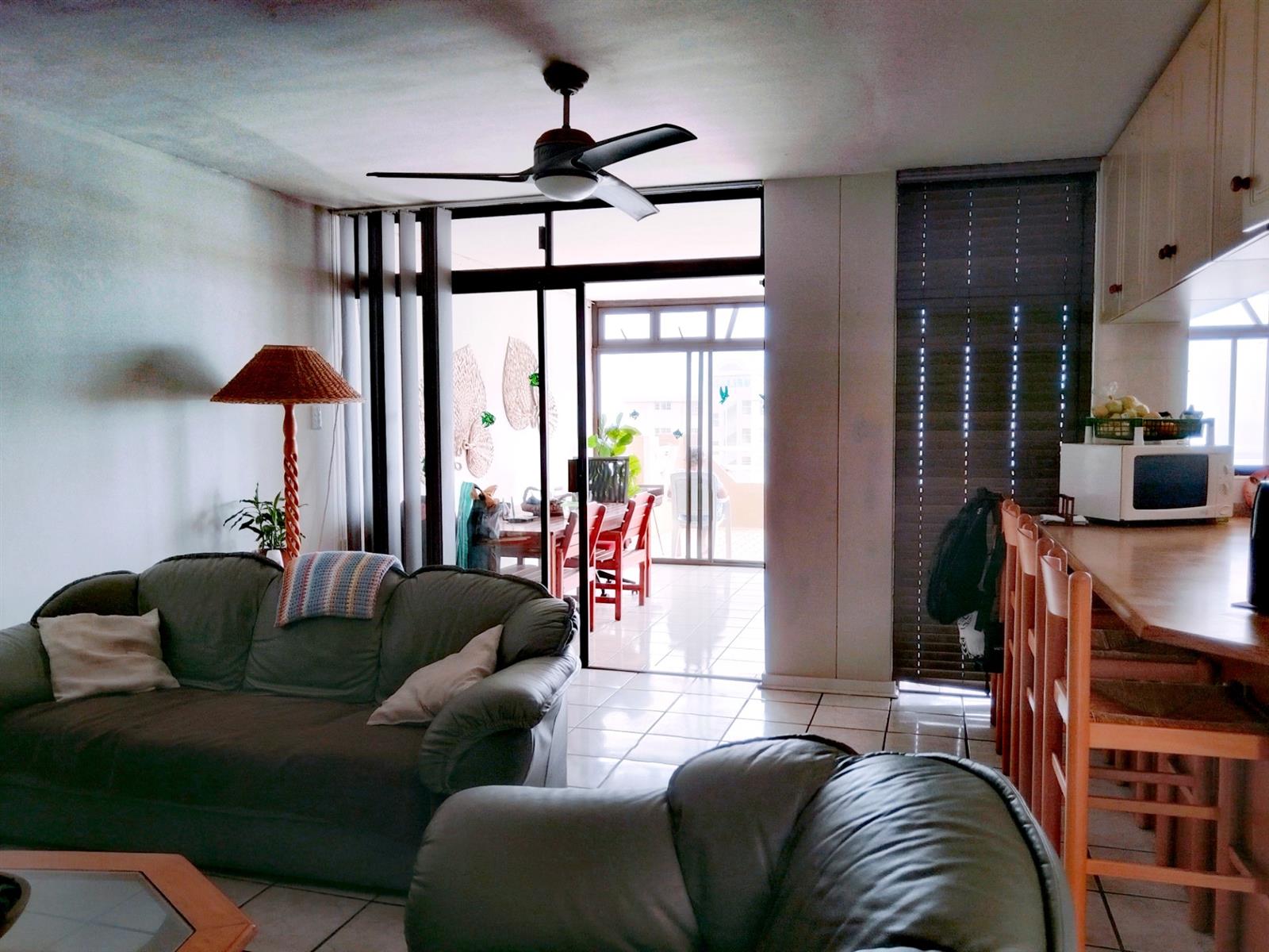 This fully furnished penthouse on the third floor offers space and great sea views overlooking other beachfront properties. The complex is less than 500m to the popular Lucien Beach and less than 1km from the main Margate beach. The two guest bedrooms are spacious with ceiling fans and complex views. The luxury main bedroom is spacious and have a sliding door to a private open balcony area with sea views. The open plan lounge, dining room and kitchen is specious, well laid out and the kitchen has a serving hatch to the entertainment room area that is part of the enclosed balcony. Enough space for a second lounge and dining area or entertainment. The big open balcony is ideal for entertaining and a braai with friends and family while smelling the ocean and hearing the breakers in the background.