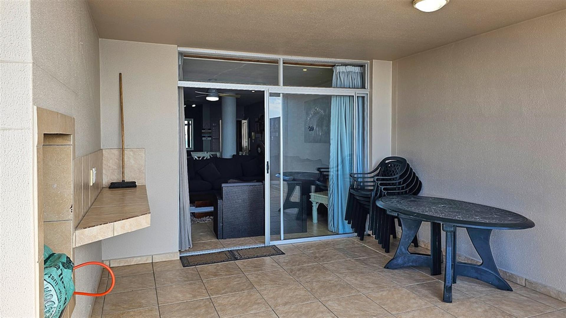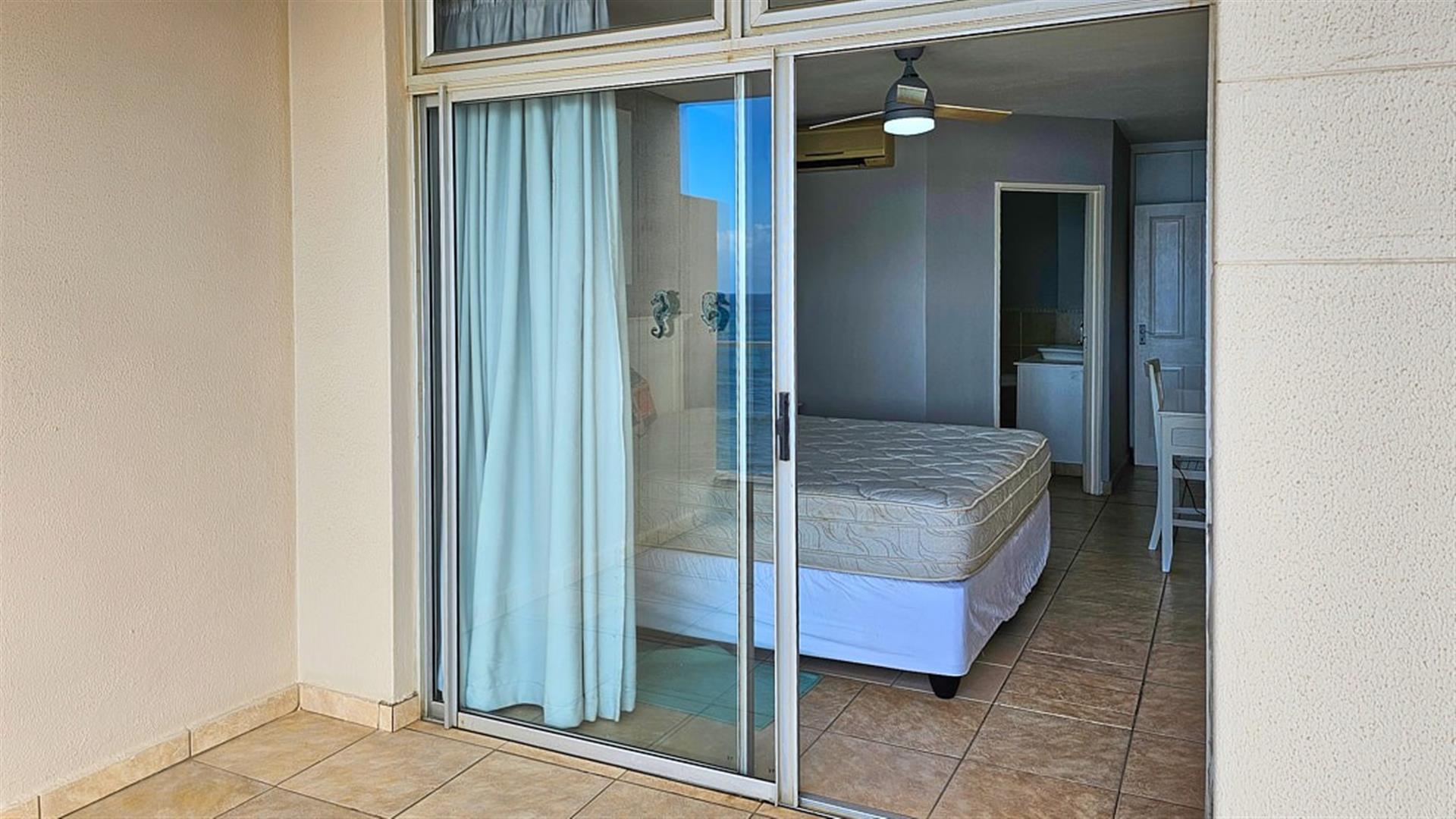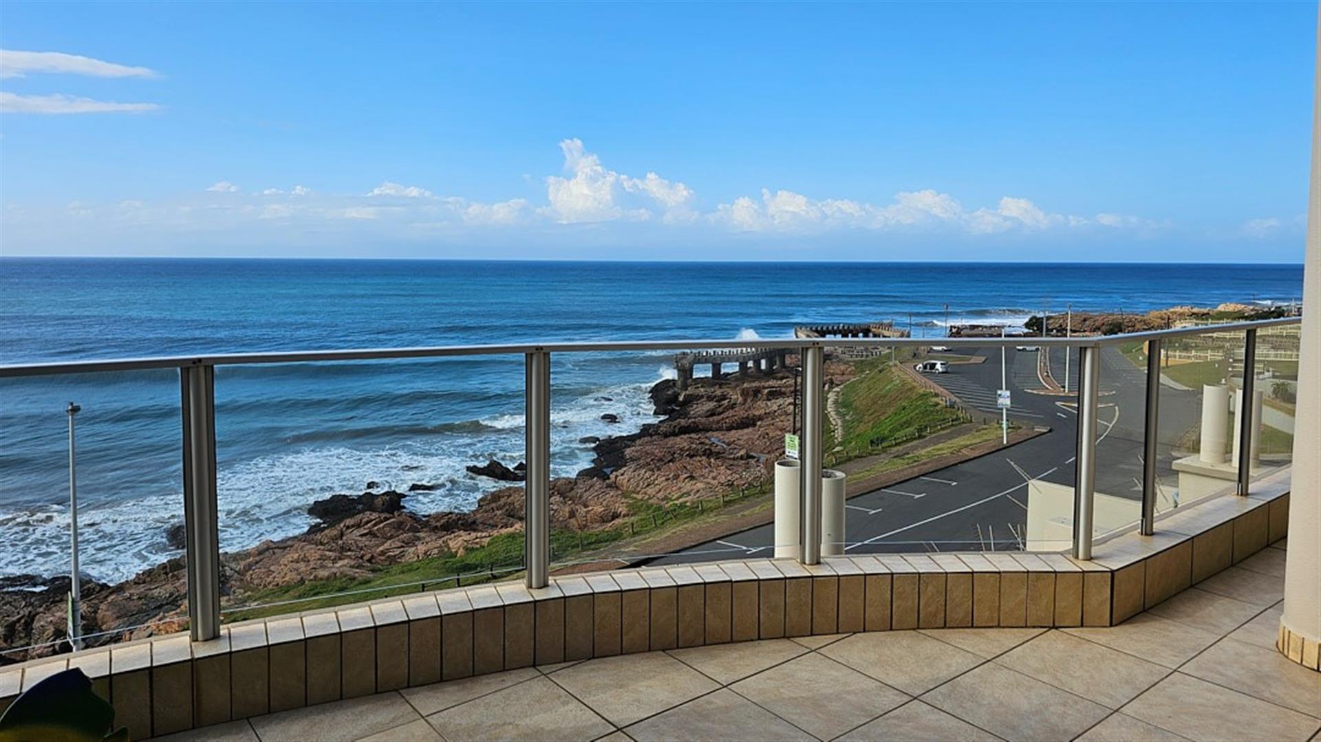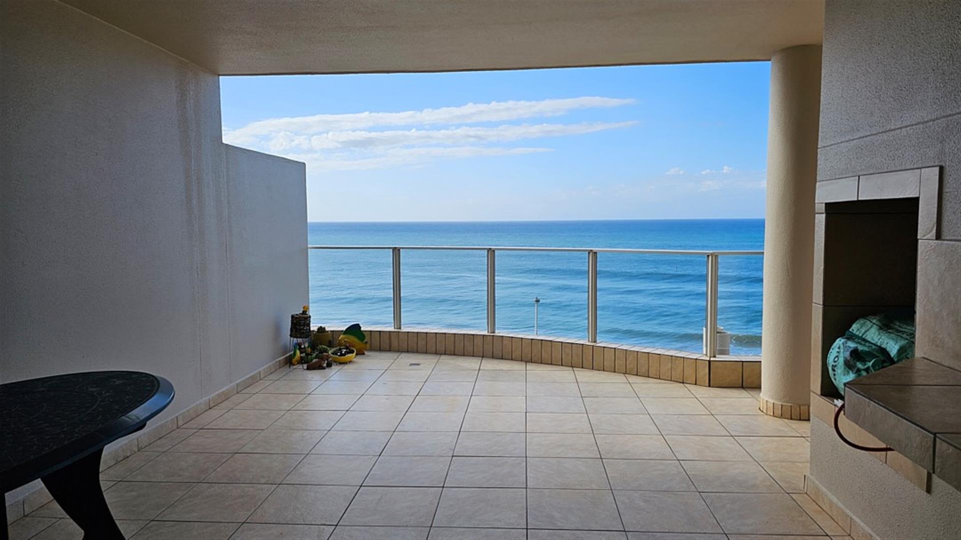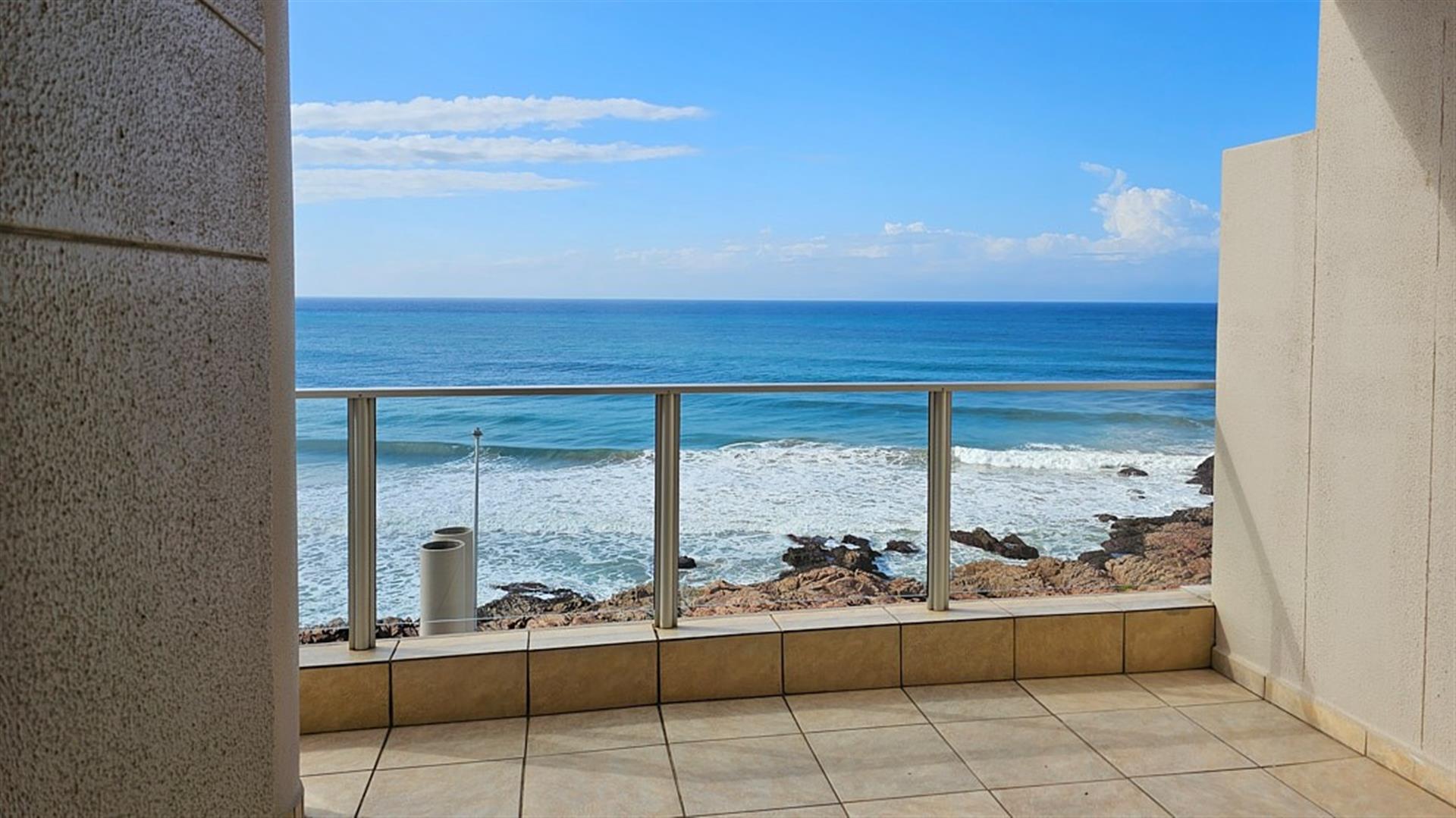 INVESTOR`S DREAM Investment!! Live the OCEAN...TRUST your agent! See the SEA, hear the SEA, smell the SEA...almost TOUCH THE OCEAN!! This apartment is pure beach BLISS! A brilliant buy for any investor: beachfront, wheelchair friendly because of an elevator, close to the beach and all other amenities like shops and restaurants. This complex is always fully booked right through the year as it is a great favorite of holidaymakers. Right ON the ocean! As you enter the apartment, the first thing you become aware of is the immense blue of the ocean. The apartment is infused with ocean vibes, sight, smell and hearing. The open plan dining room/ lounge// kitchen area is spacious and light ( with air-conditioning) with natural light streaming in through the glass sliding doors that opens to a spacious balcony. Here you can enjoy the ocean in all it`s glory to relax or entertain. The balcony is partially covered with stunning 180 degrees sea views... ocean bliss indeed! As you look out to the ocean, the fishing pier is to your left, whilst the main BLUE FLAG BEACH is to your left. Beautiful... The open plan kitchen is modern with glamorous granite counter tops and a dining nook. The whole apartment is in good condition with no sign of damp.