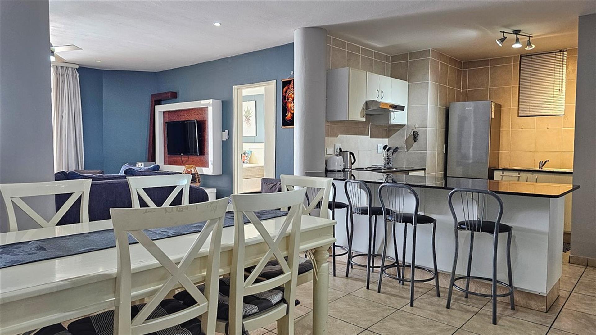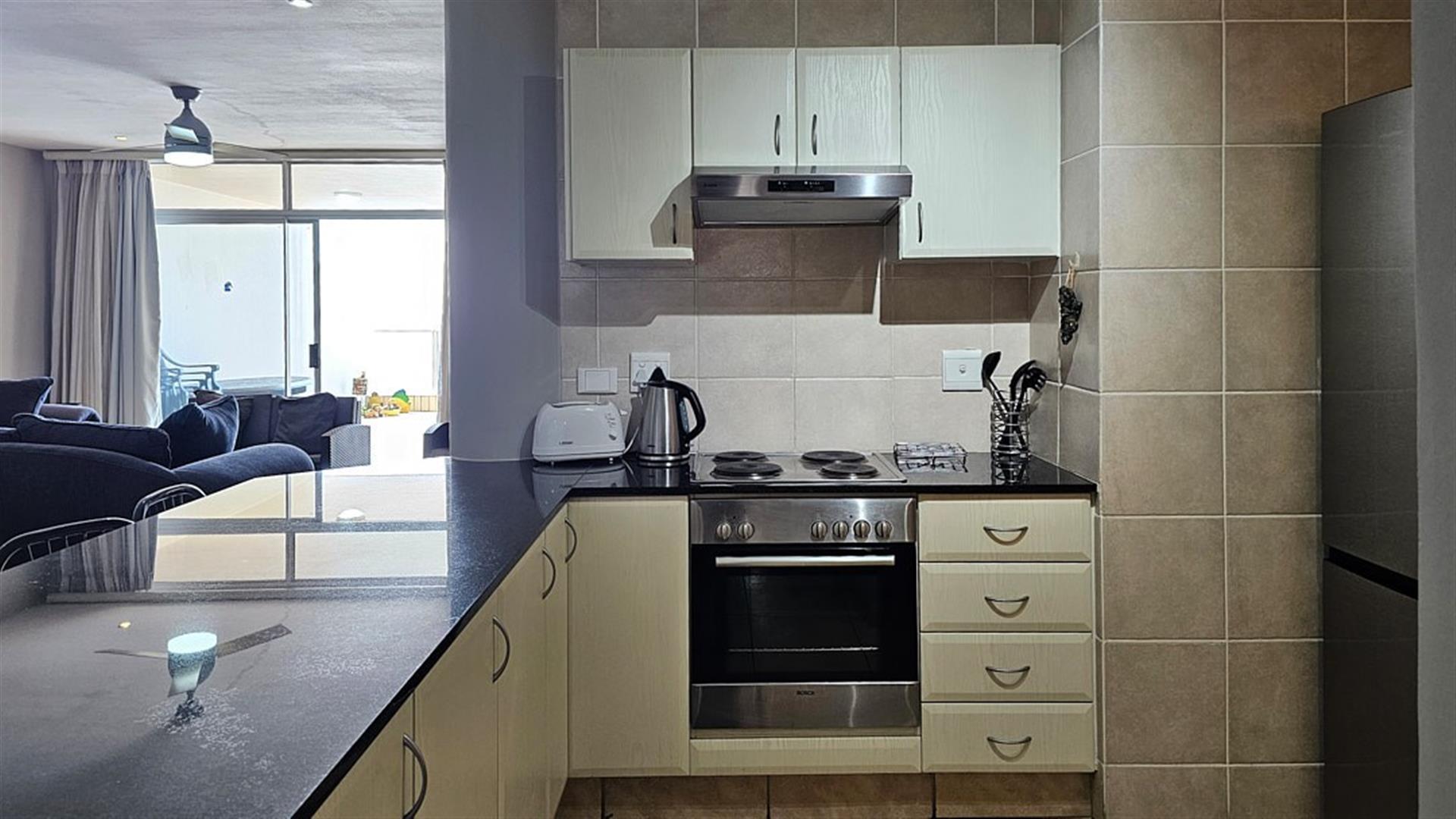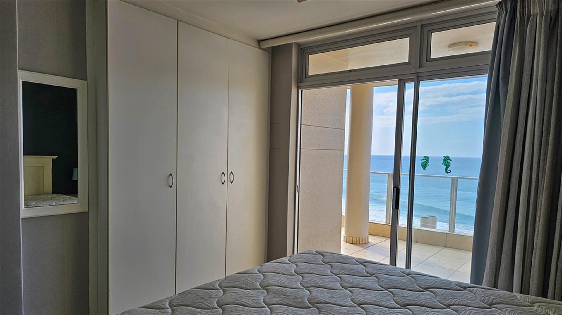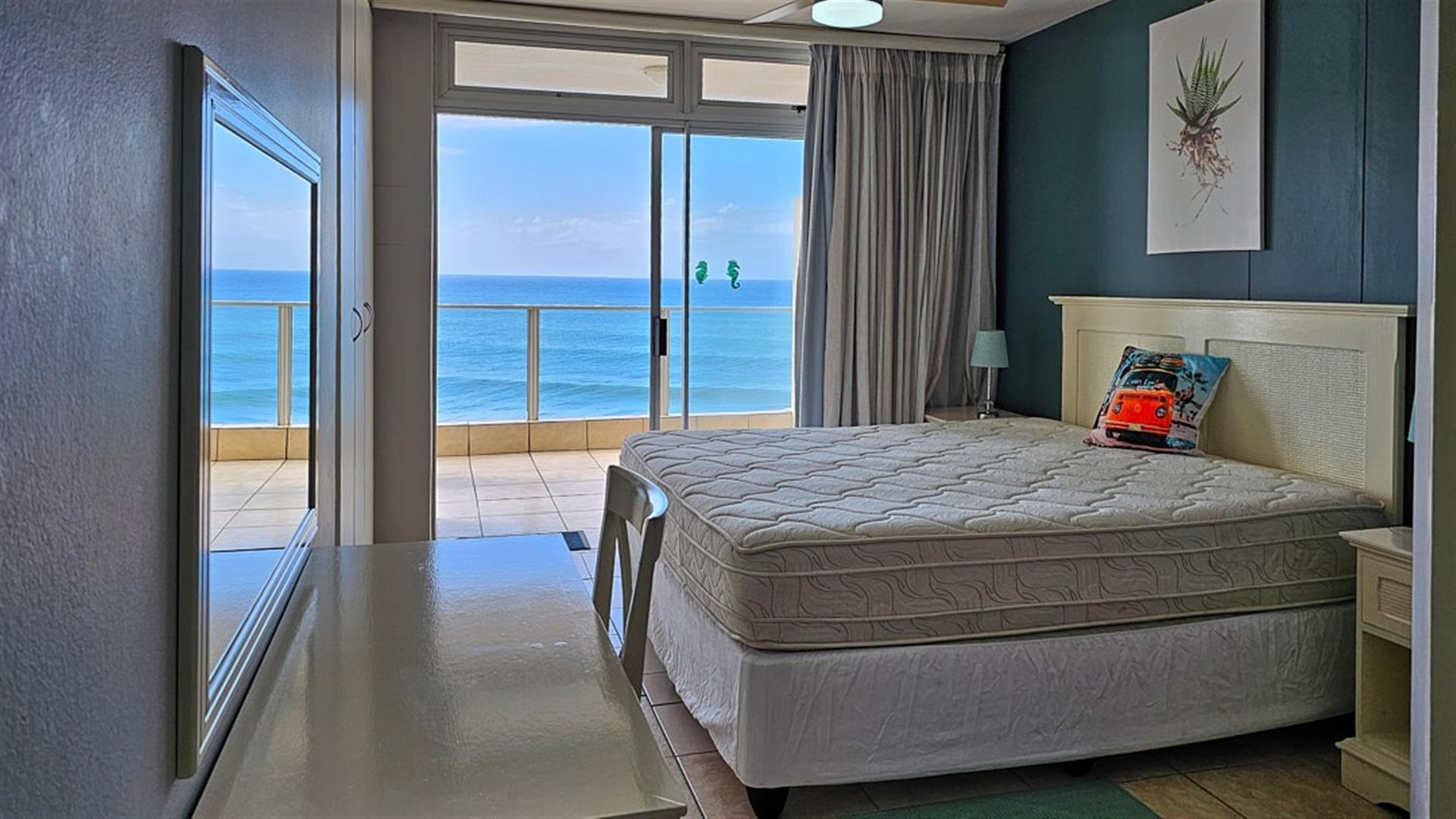INVESTOR`S DREAM Investment!! Live the OCEAN...TRUST your agent! See the SEA, hear the SEA, smell the SEA...almost TOUCH THE OCEAN!! This apartment is pure beach BLISS! A brilliant buy for any investor: beachfront, wheelchair friendly because of an elevator, close to the beach and all other amenities like shops and restaurants. This complex is always fully booked right through the year as it is a great favorite of holidaymakers. Right ON the ocean! As you enter the apartment, the first thing you become aware of is the immense blue of the ocean. The apartment is infused with ocean vibes, sight, smell and hearing. The open plan dining room/ lounge// kitchen area is spacious and light ( with air-conditioning) with natural light streaming in through the glass sliding doors that opens to a spacious balcony. Here you can enjoy the ocean in all it`s glory to relax or entertain. The balcony is partially covered with stunning 180 degrees sea views... ocean bliss indeed! As you look out to the ocean, the fishing pier is to your left, whilst the main BLUE FLAG BEACH is to your left. Beautiful... The open plan kitchen is modern with glamorous granite counter tops and a dining nook. The whole apartment is in good condition with no sign of damp.