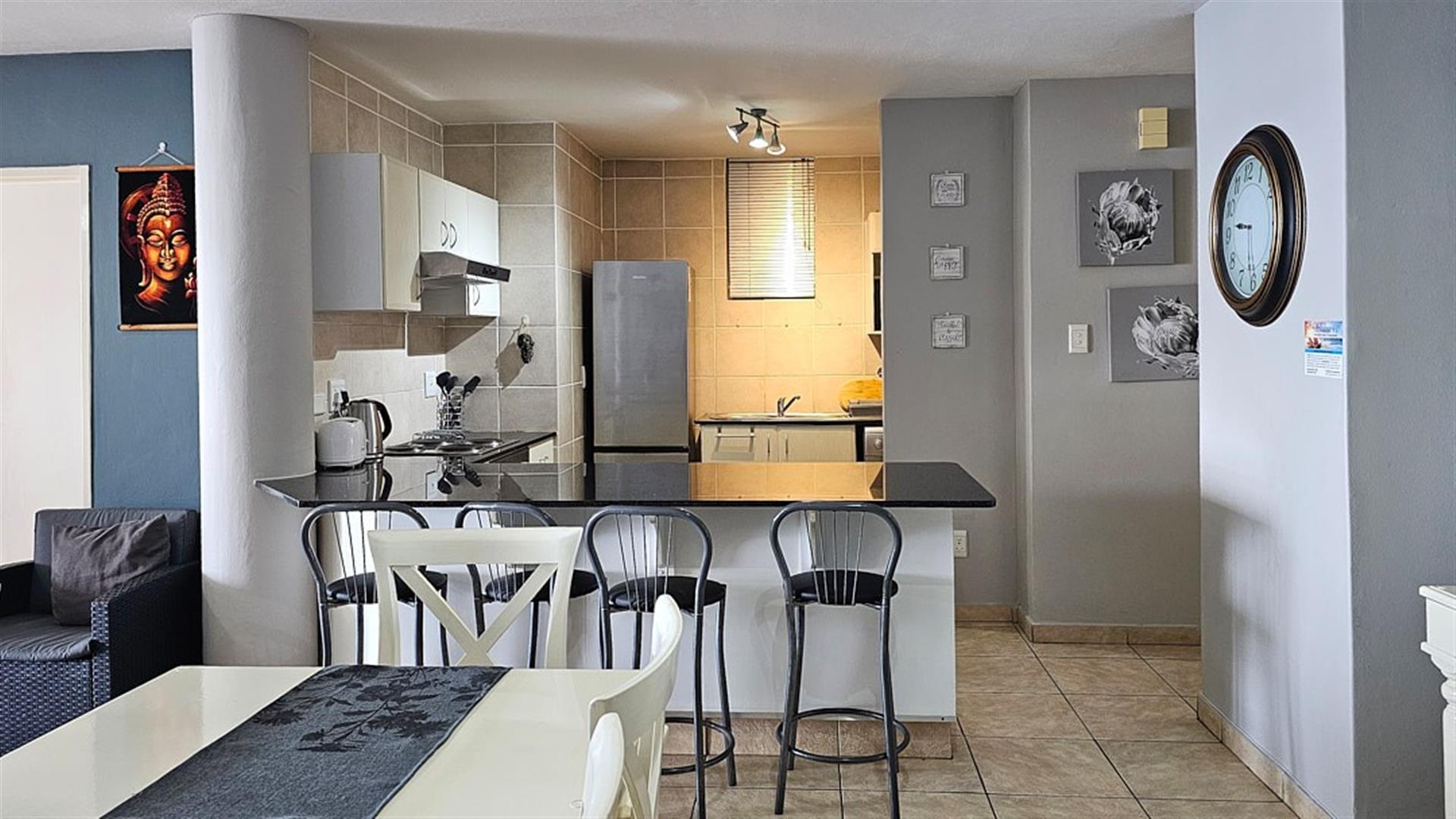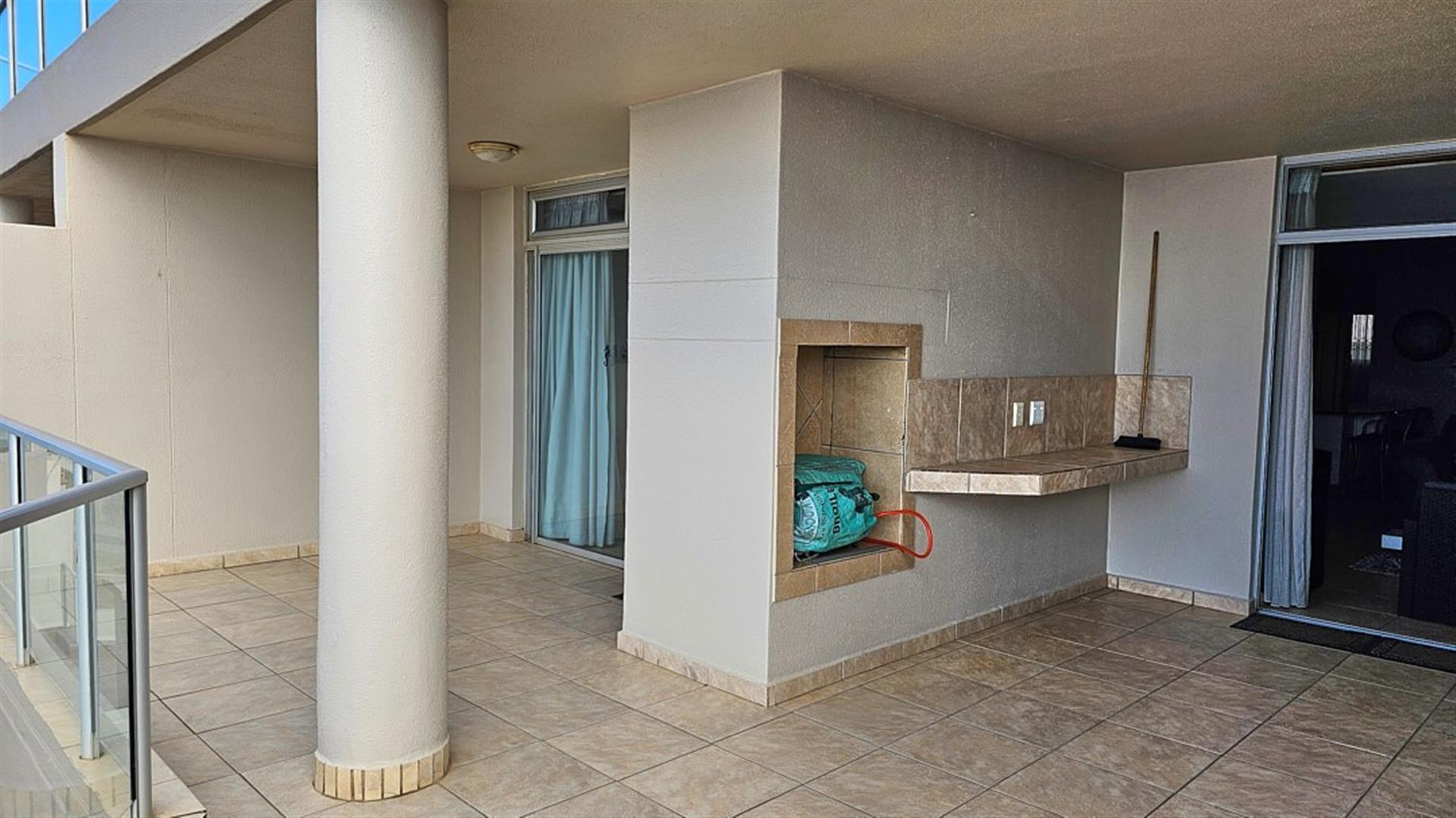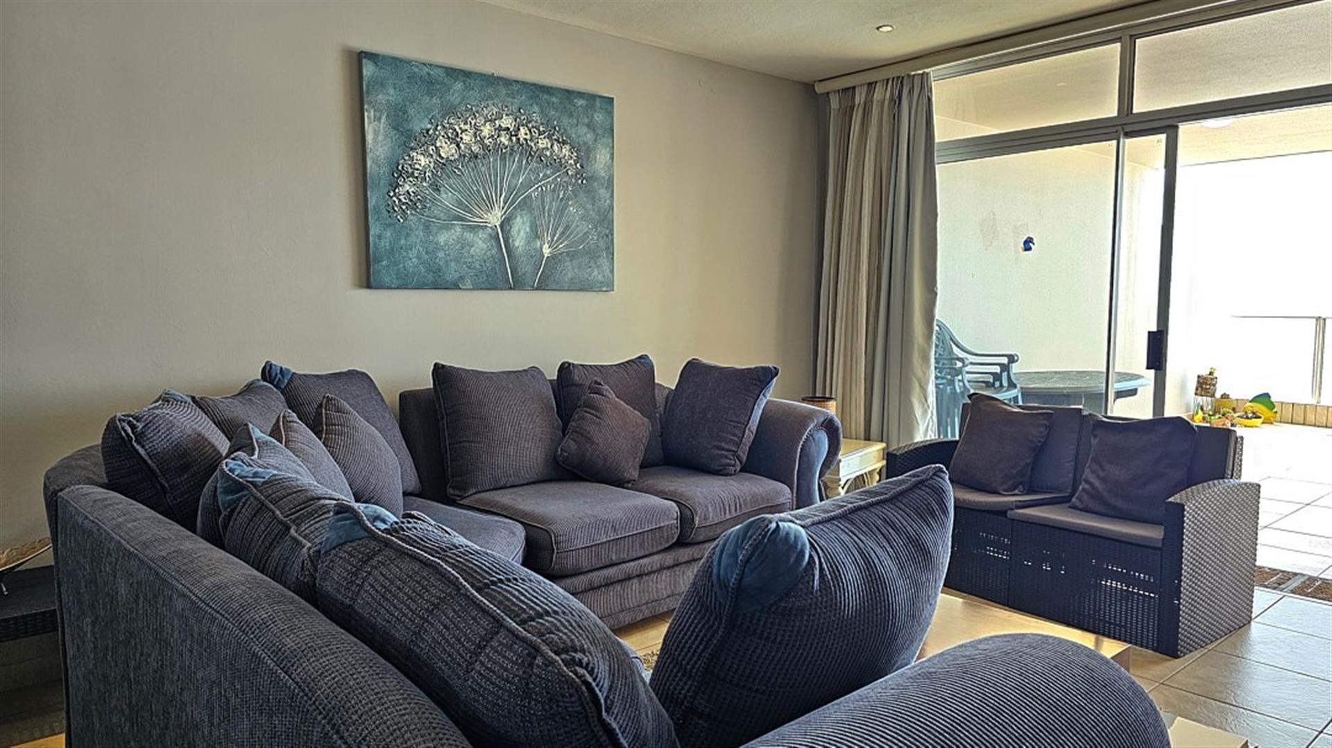 The main bedroom opens with sliding doors to said balcony and you can enjoy the florescent, white waves as the sound of the ocean lulls you to sleep.is. This bedroom is en-suite to a modern full bathroom with a shower and a bath. The 2nd and 3rd bedrooms are of good size and share the second bathroom wit a bath. The apartment comes with a double, tandem, lock-up garage with space for visitors to park. A huge bonus. The complex is beautifully maintained and has a sparkling blue, communal swimming pool with a welcoming braai area. This is a security complex with a 24/7 security guard at the automated gate and electric fencing. The apartment is sold fully furnished with quality furniture and appliances. Perfect as a lock-up and go or a money spinner when let out to holiday makers.... even more perfect if you are lucky enough to make this your permanent home!! Blessed INDEED! Give me a call..
