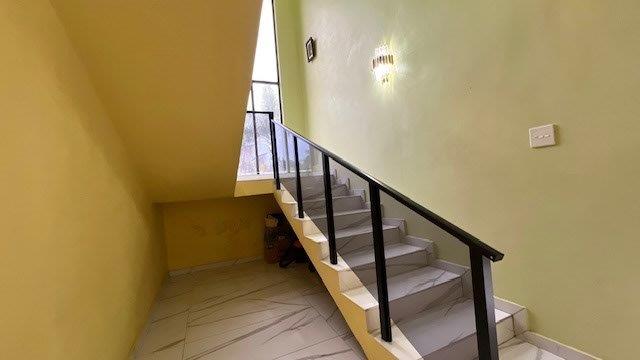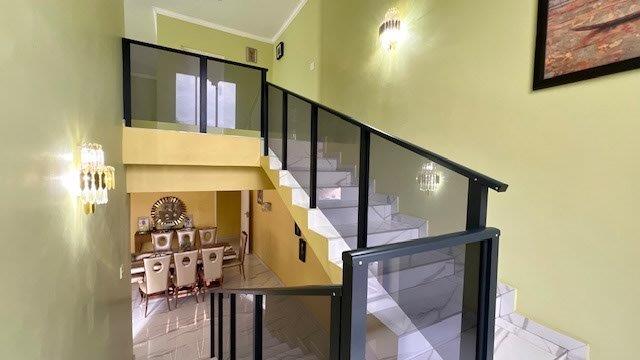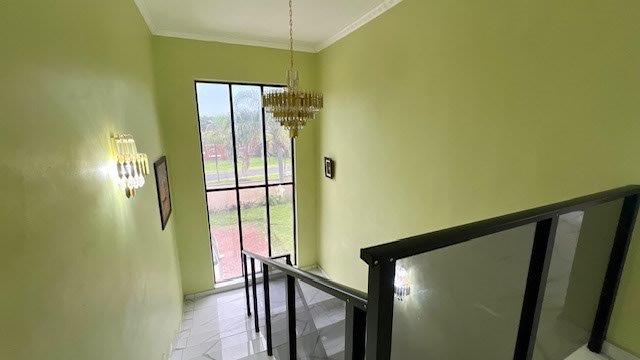 A grand staircase, highlighted by an elegant chandelier, leads to the upper level, where a second lounge opens onto a spacious balcony with breathtaking views. The master suite, complete with a private en-suite, offers a peaceful retreat.