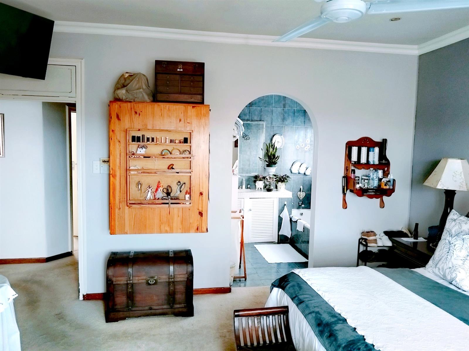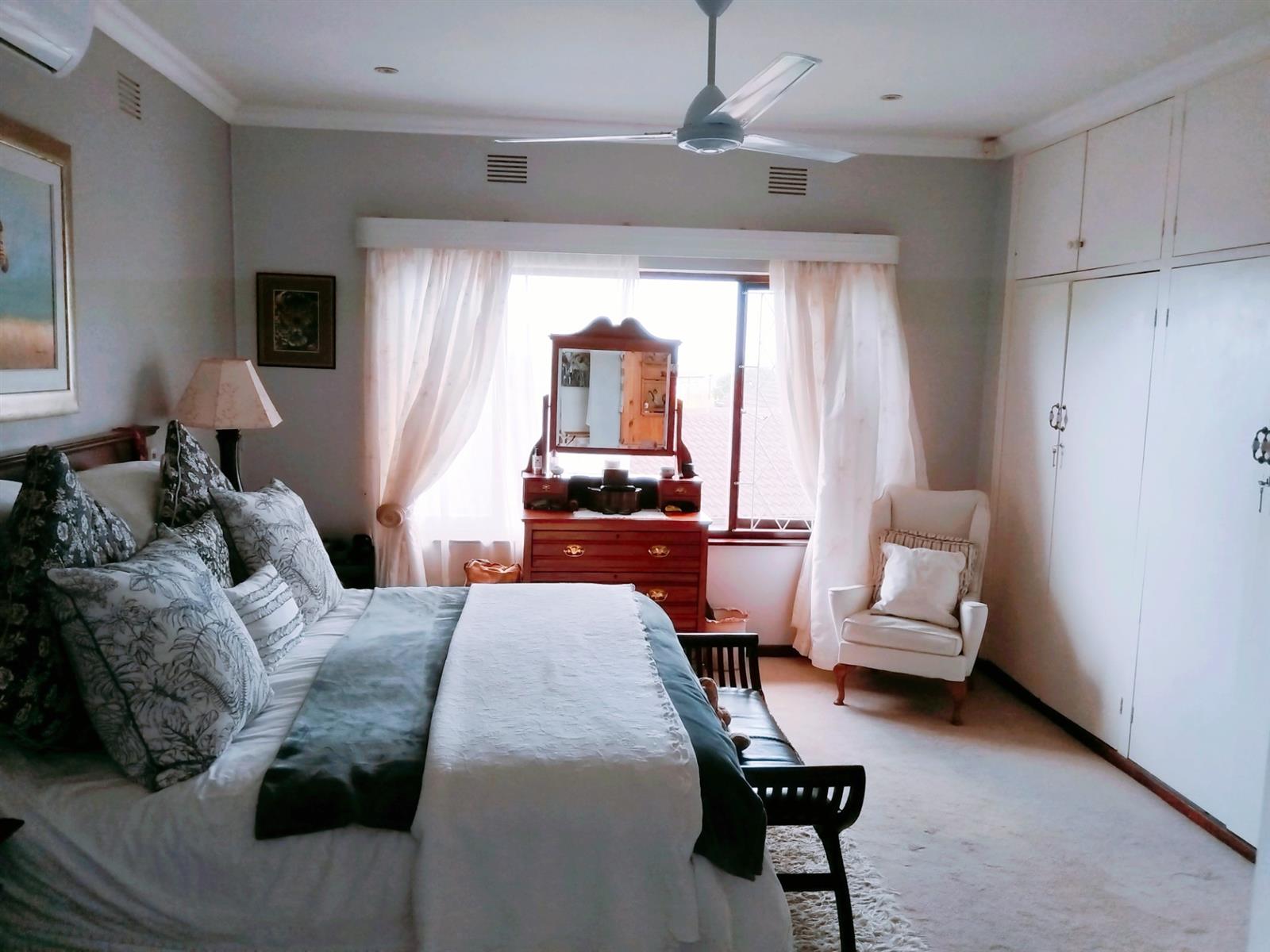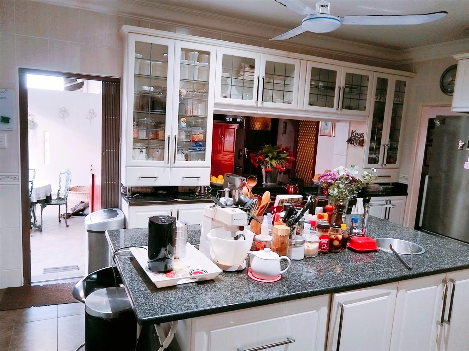Although it’s a golden oldy you would never know with modern features and upmarket finishes like granite in the kitchen, screened ceilings with down lights and the landscaped garden. A huge family lounge with separate TV Lounge and dining room. The gourmet kitchen is spacious with a separate scullery and doors to the entertainment braai area. From the kitchen towards the lounge, you go through a fair size dining room with the Open Arch TV room to your left. 4 Spacious bedrooms with build in cupboards and ceiling fans, and two bathrooms. Additional features like 5000L back up water tanks, solar geyser and an 5kw inverter just add to the comfortable lifestyle this property offers. A magnificent garden with paved driveways leads you to a double lock up garage and a two-room flat or storage rooms with a bathroom.