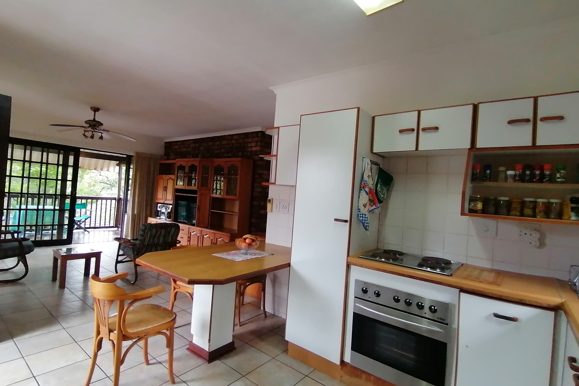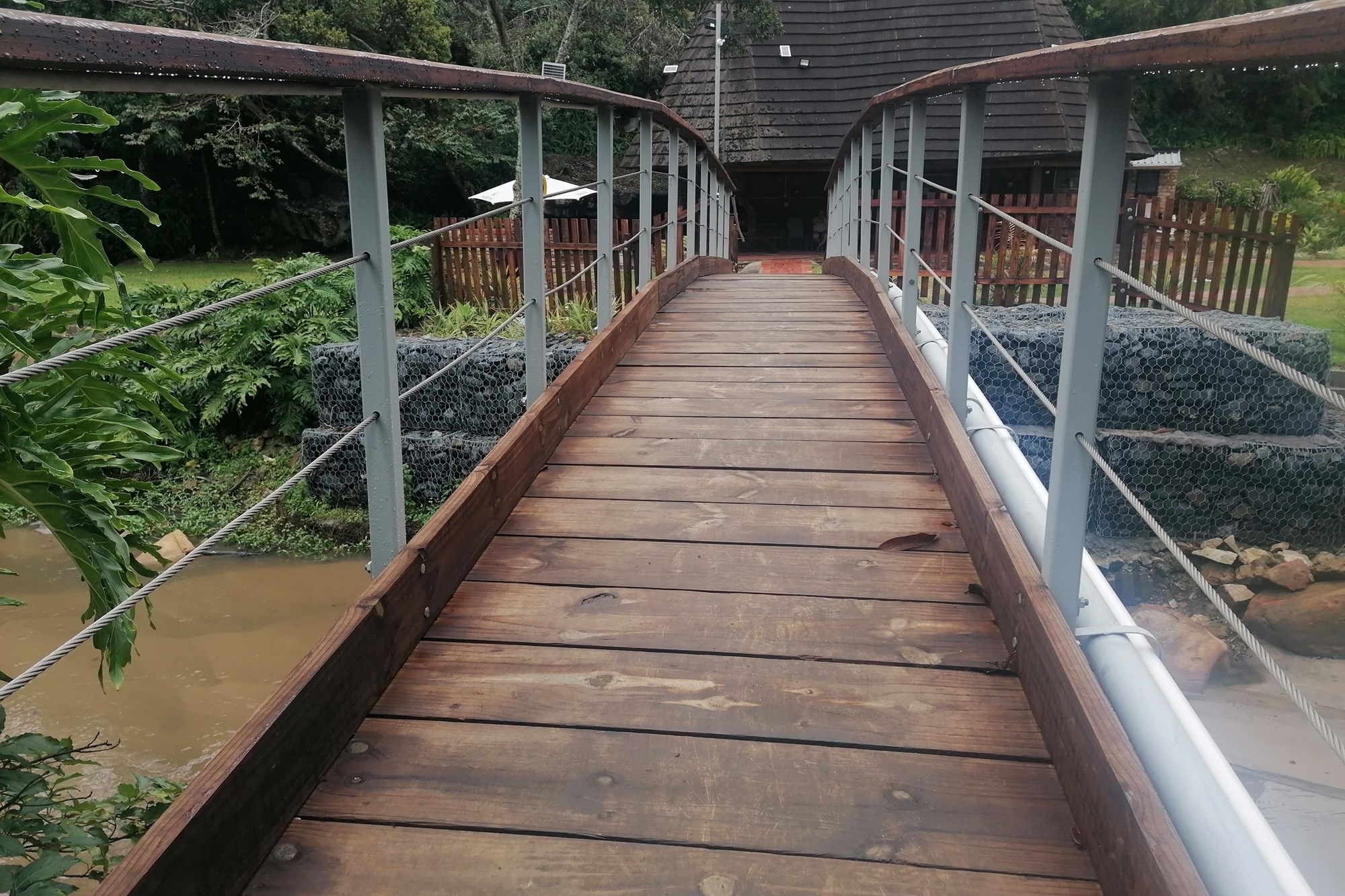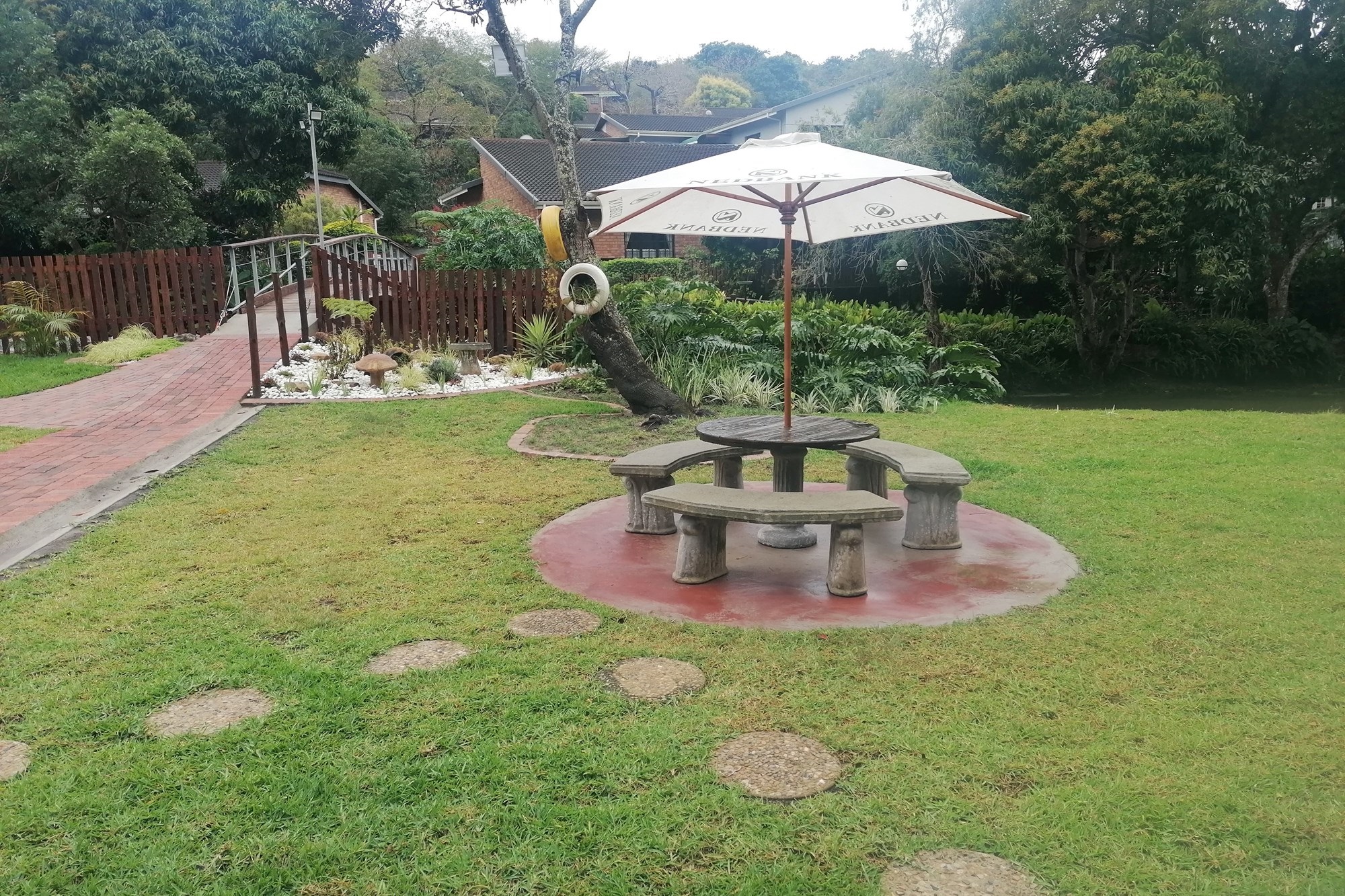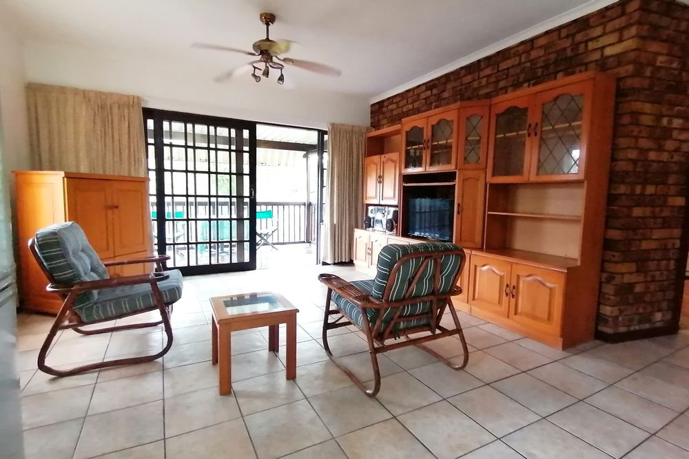 It has two parking spaces - a garage and an undercover parking - two patios, two bedrooms and two bathrooms. The open plan living space opens to both patios meaning great entertainment for a family of different generations. Spend your days in the safe entertainment area with braai facilities, a swimming pool and tennis court. Or you can just spend your me time by the waterfall on the river that flows through the back next to the entertainment area.