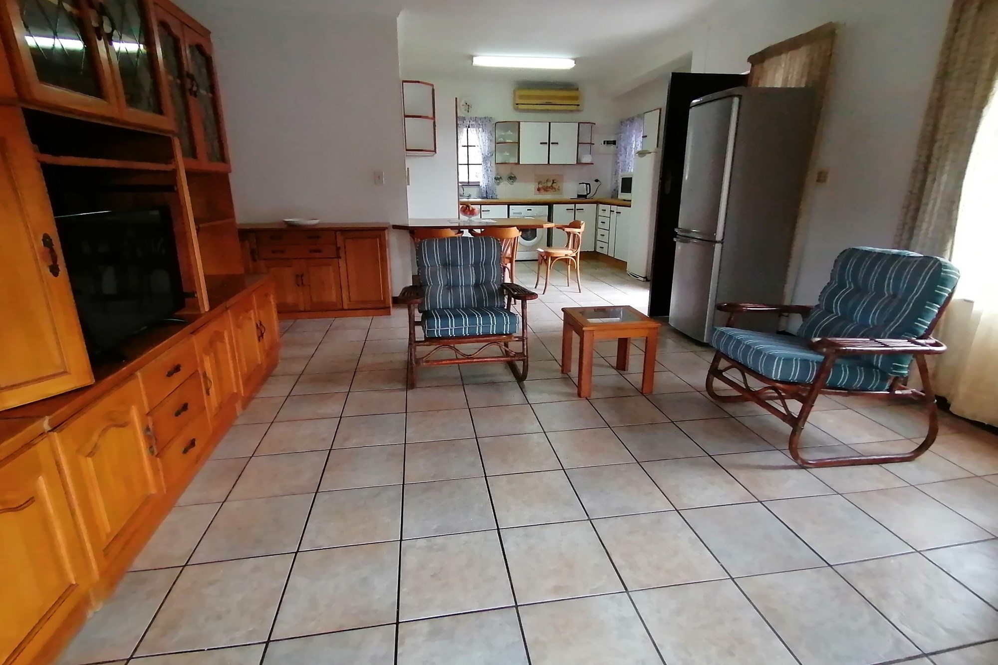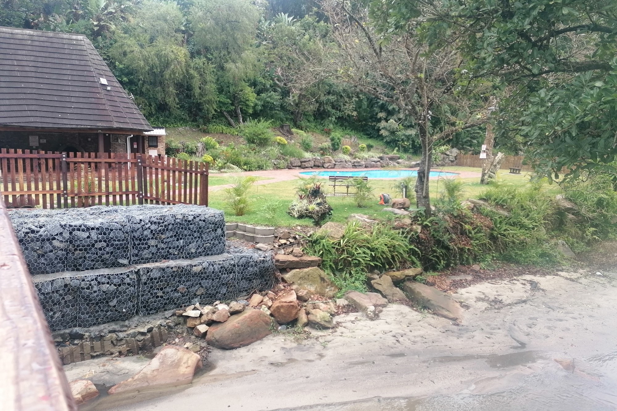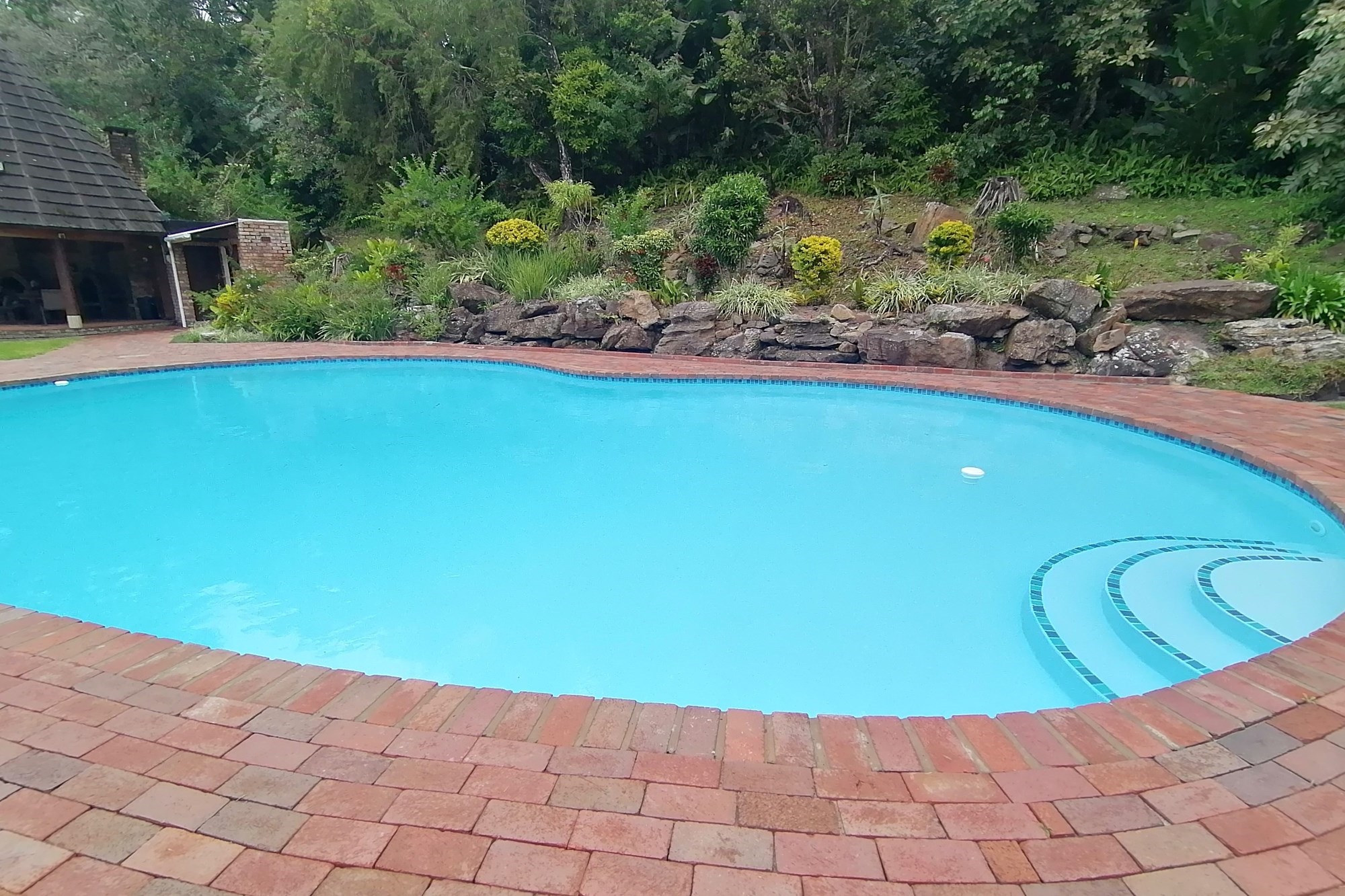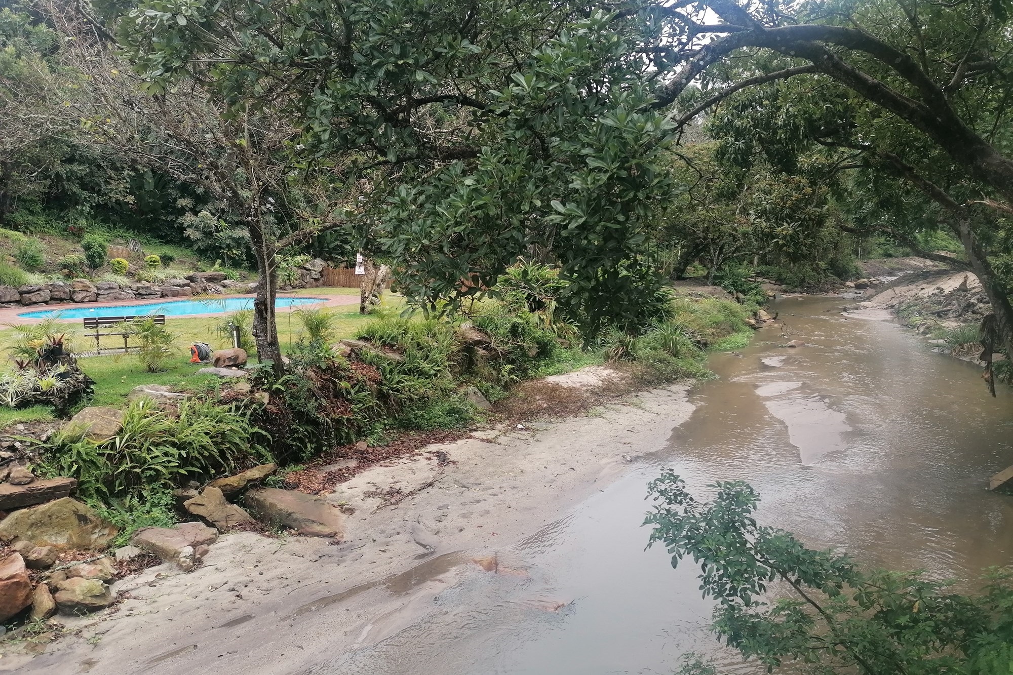 It has two parking spaces - a garage and an undercover parking - two patios, two bedrooms and two bathrooms. The open plan living space opens to both patios meaning great entertainment for a family of different generations. Spend your days in the safe entertainment area with braai facilities, a swimming pool and tennis court. Or you can just spend your me time by the waterfall on the river that flows through the back next to the entertainment area.
