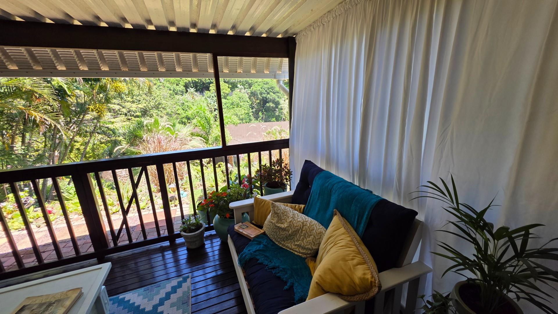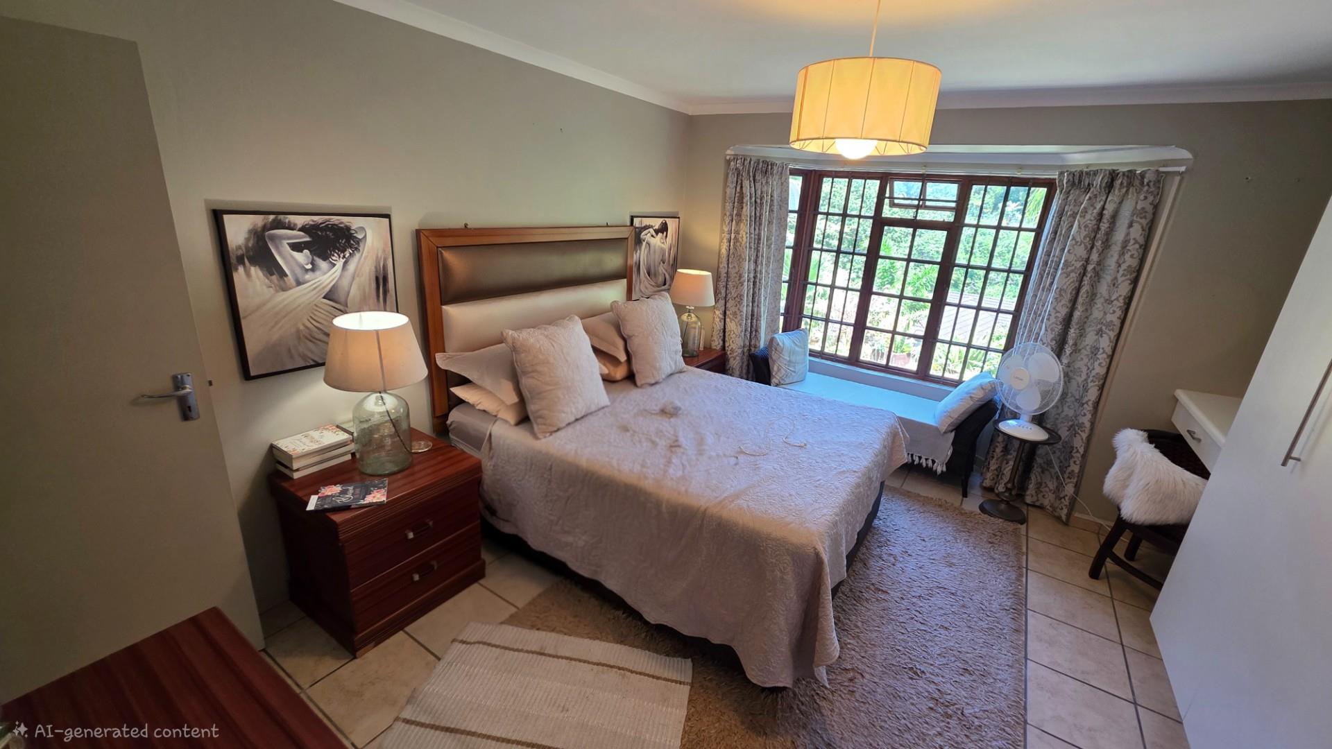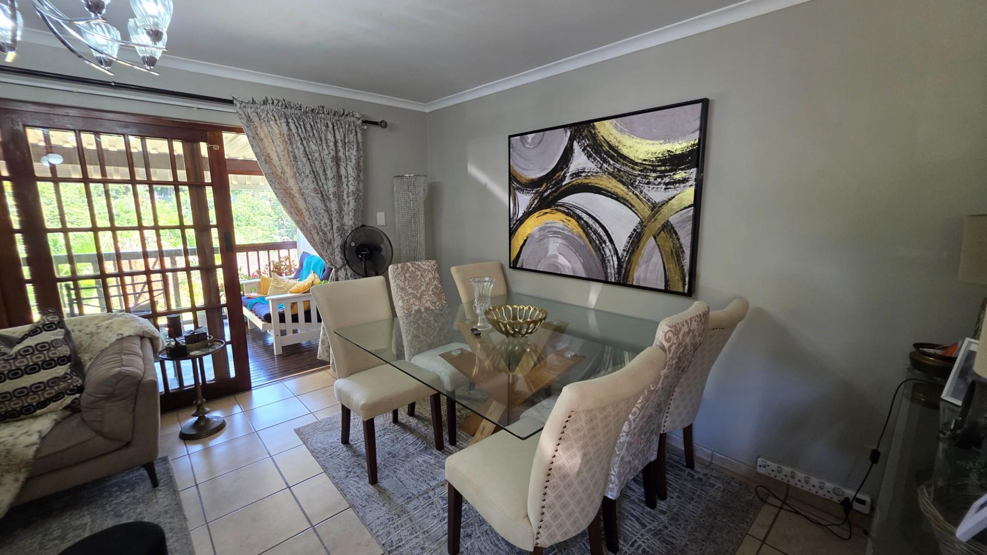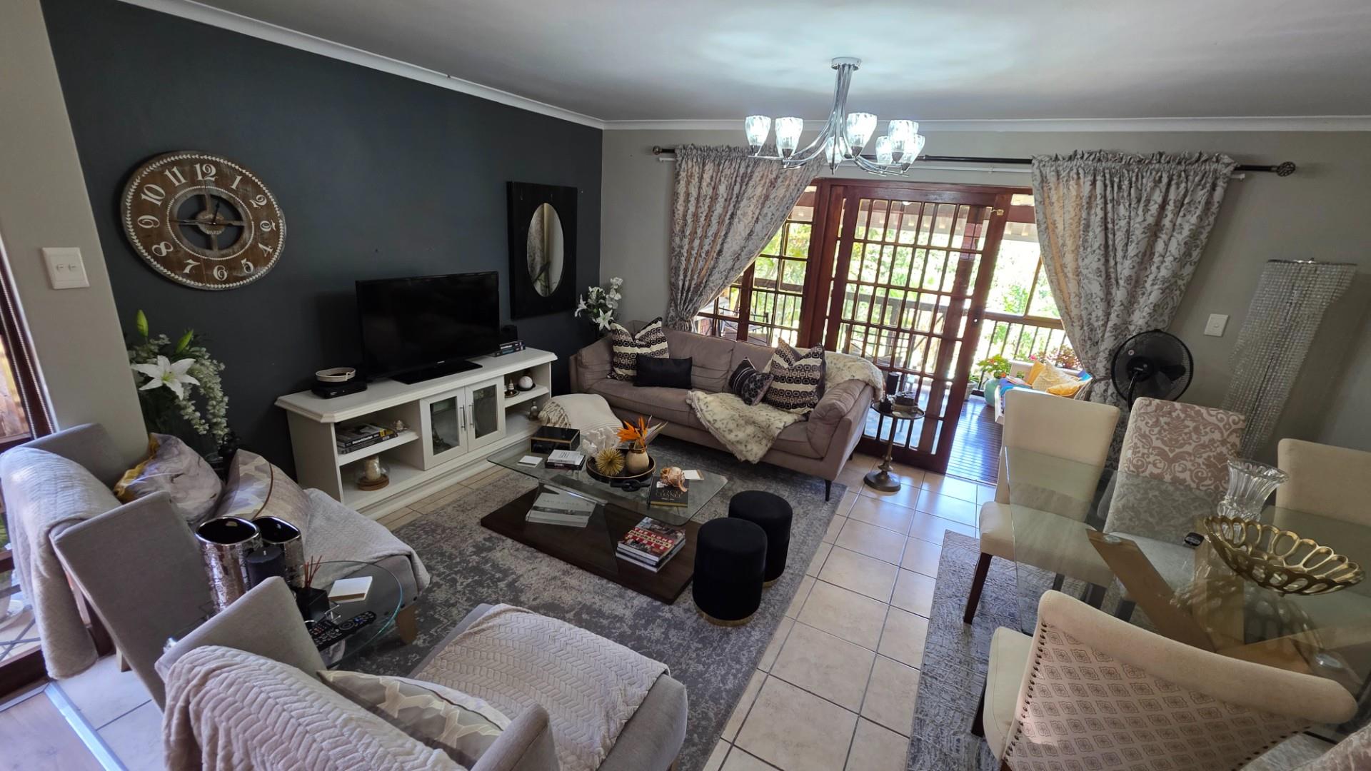 The lounge is immaculately furnished and the soft light cascading through the space from the chandelier creates a homely ambience and offers both a cosy lounge area and a classy dining room area, for entertaining guests and loved ones. A large wooden sliding door leads out onto a patio with the most beautiful views over the Eco Estate. This unit is so private and tranquil. The patio area has been enclosed with glass panelling and drapes allowing for total privacy and submersion with your favourite book and a cup of coffee.