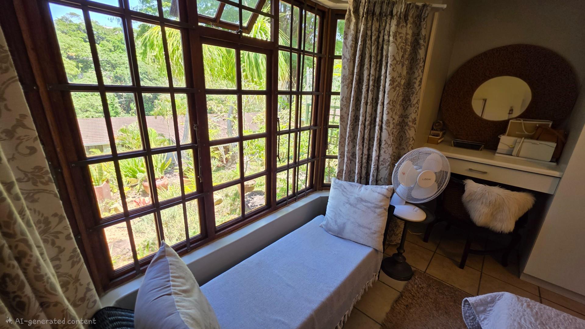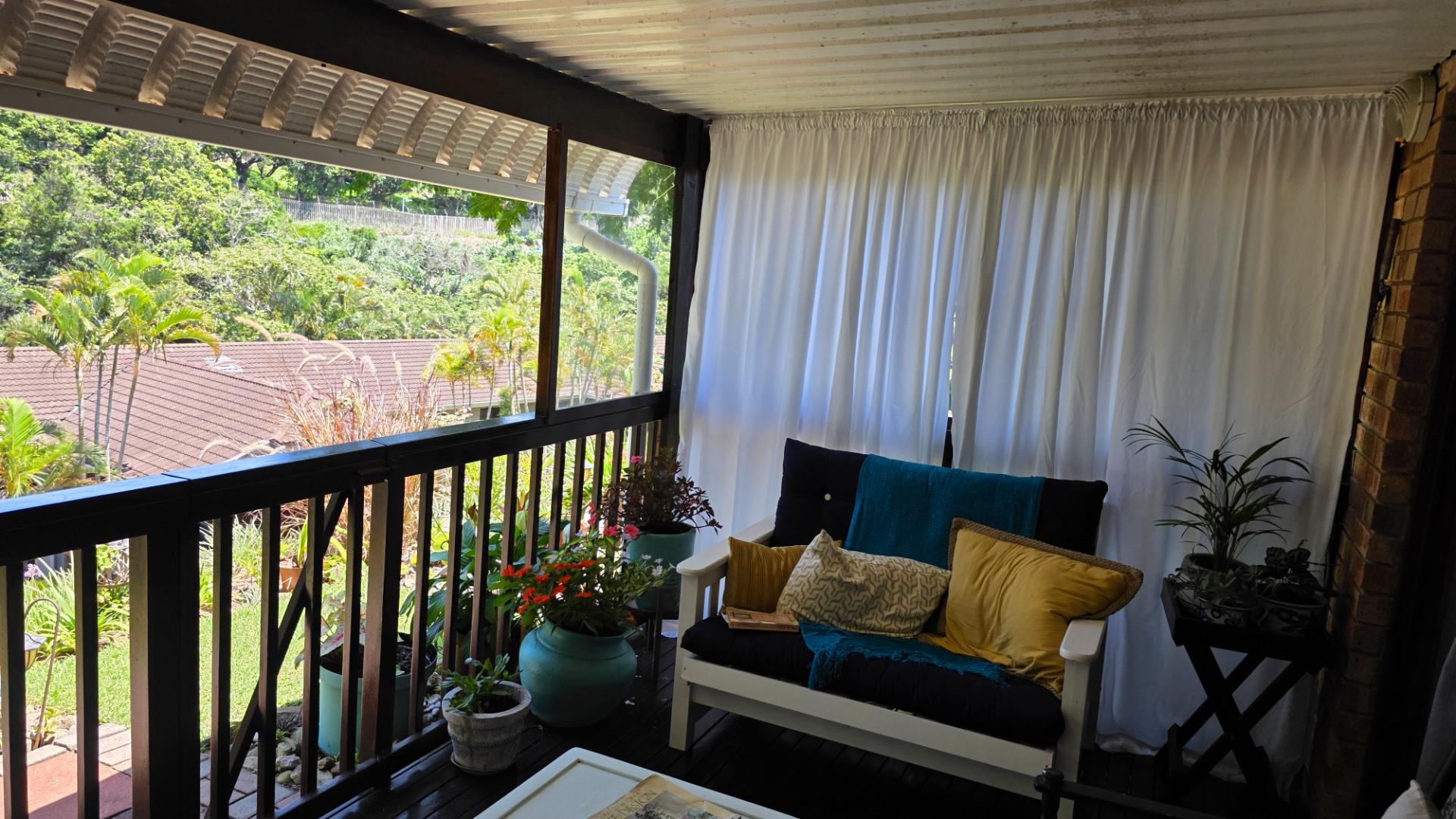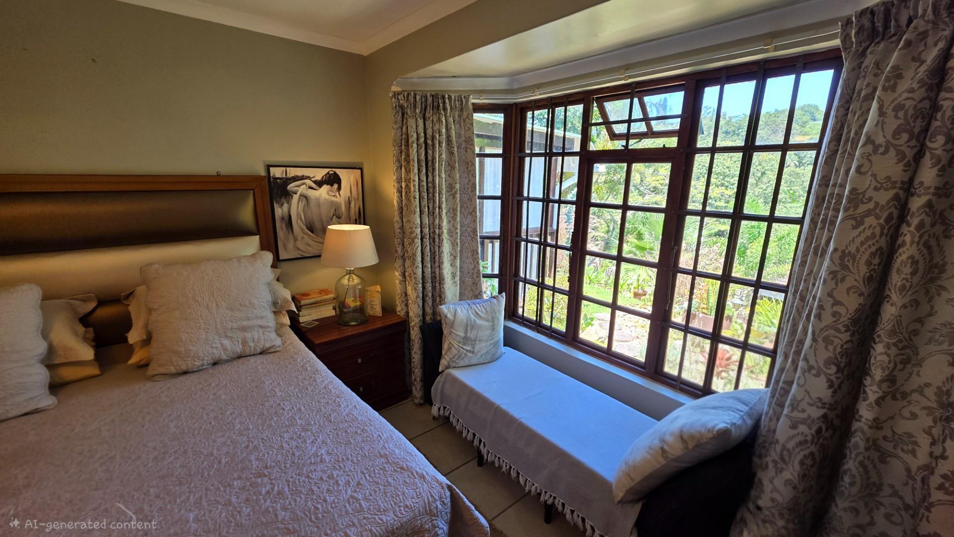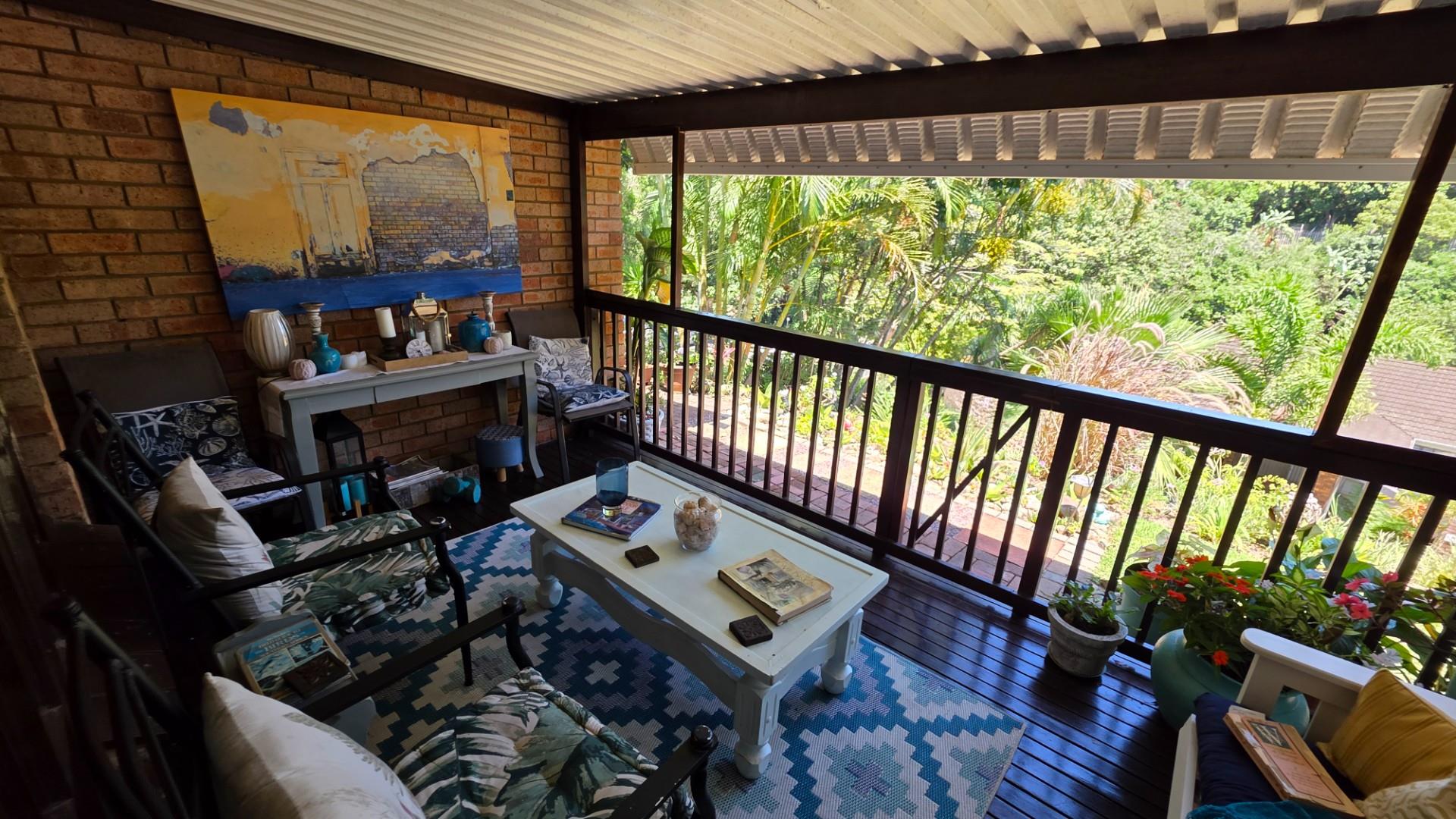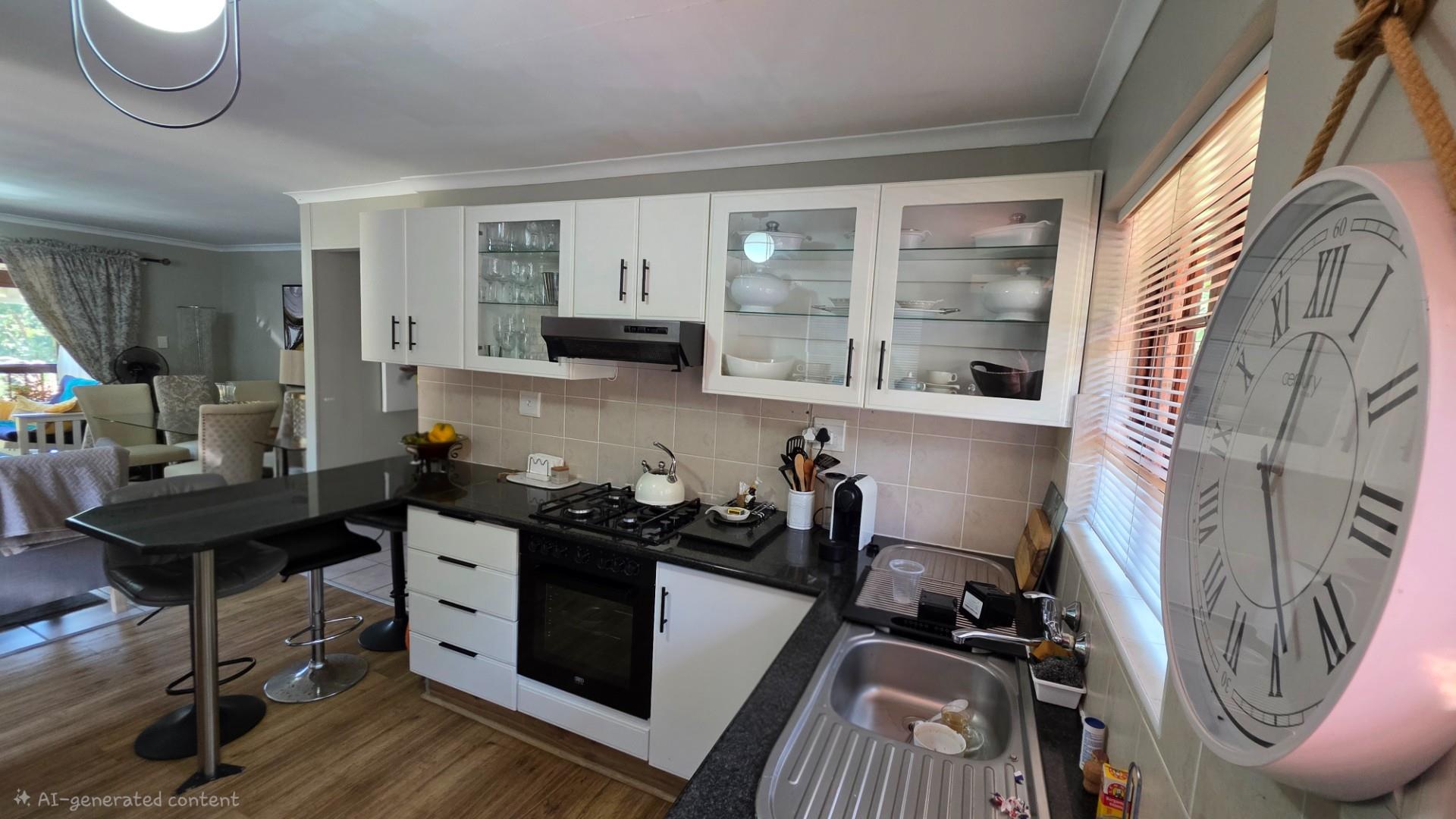 The lounge is immaculately furnished and the soft light cascading through the space from the chandelier creates a homely ambience and offers both a cosy lounge area and a classy dining room area, for entertaining guests and loved ones. A large wooden sliding door leads out onto a patio with the most beautiful views over the Eco Estate. This unit is so private and tranquil. The patio area has been enclosed with glass panelling and drapes allowing for total privacy and submersion with your favourite book and a cup of coffee.