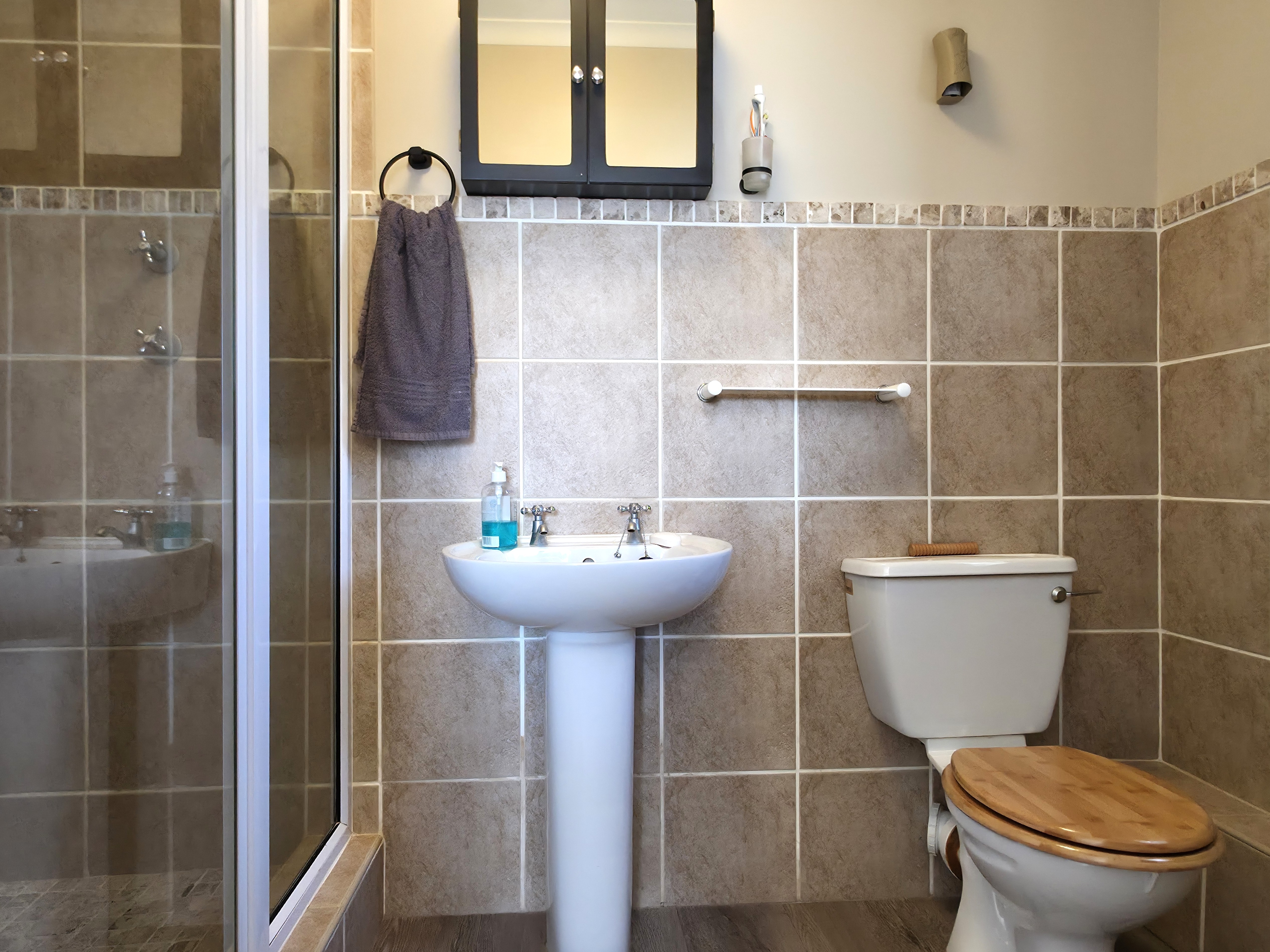 The master bedroom includes an en-suite bathroom and overlooks the canal, adding to the calm, waterside atmosphere. A second bedroom and a separate guest bathroom are located on the same level, while a staircase leads to a third bedroom upstairs.