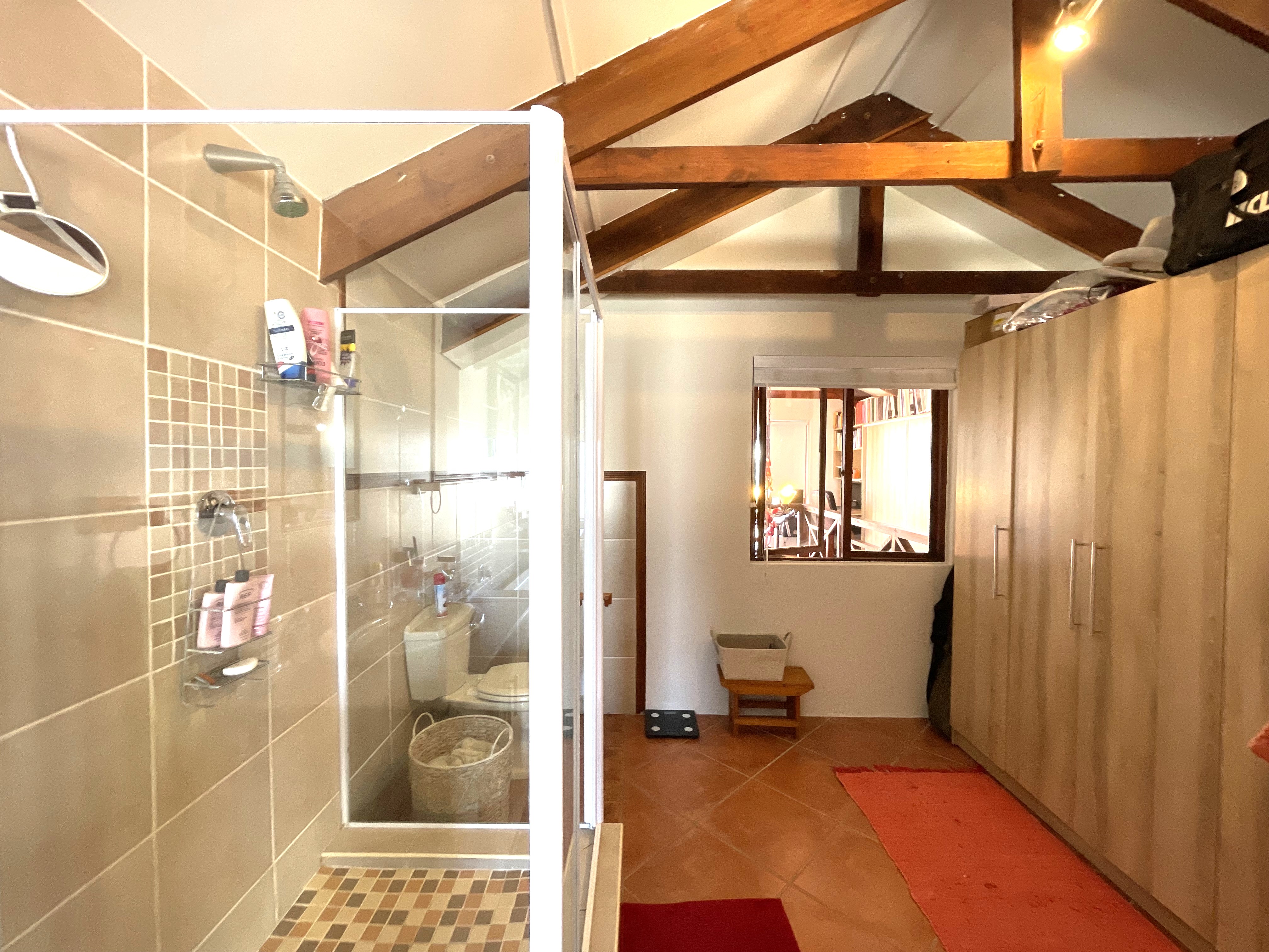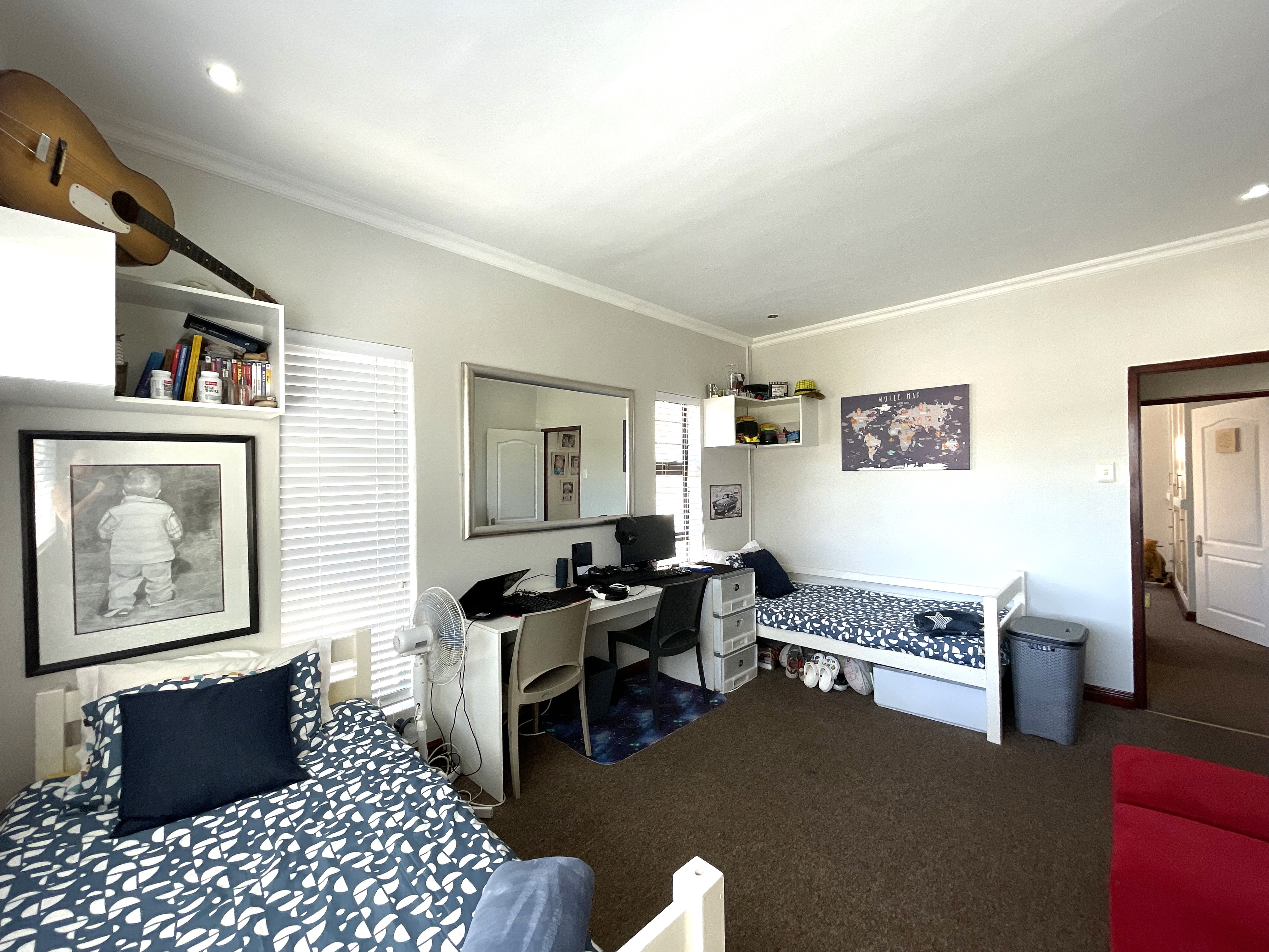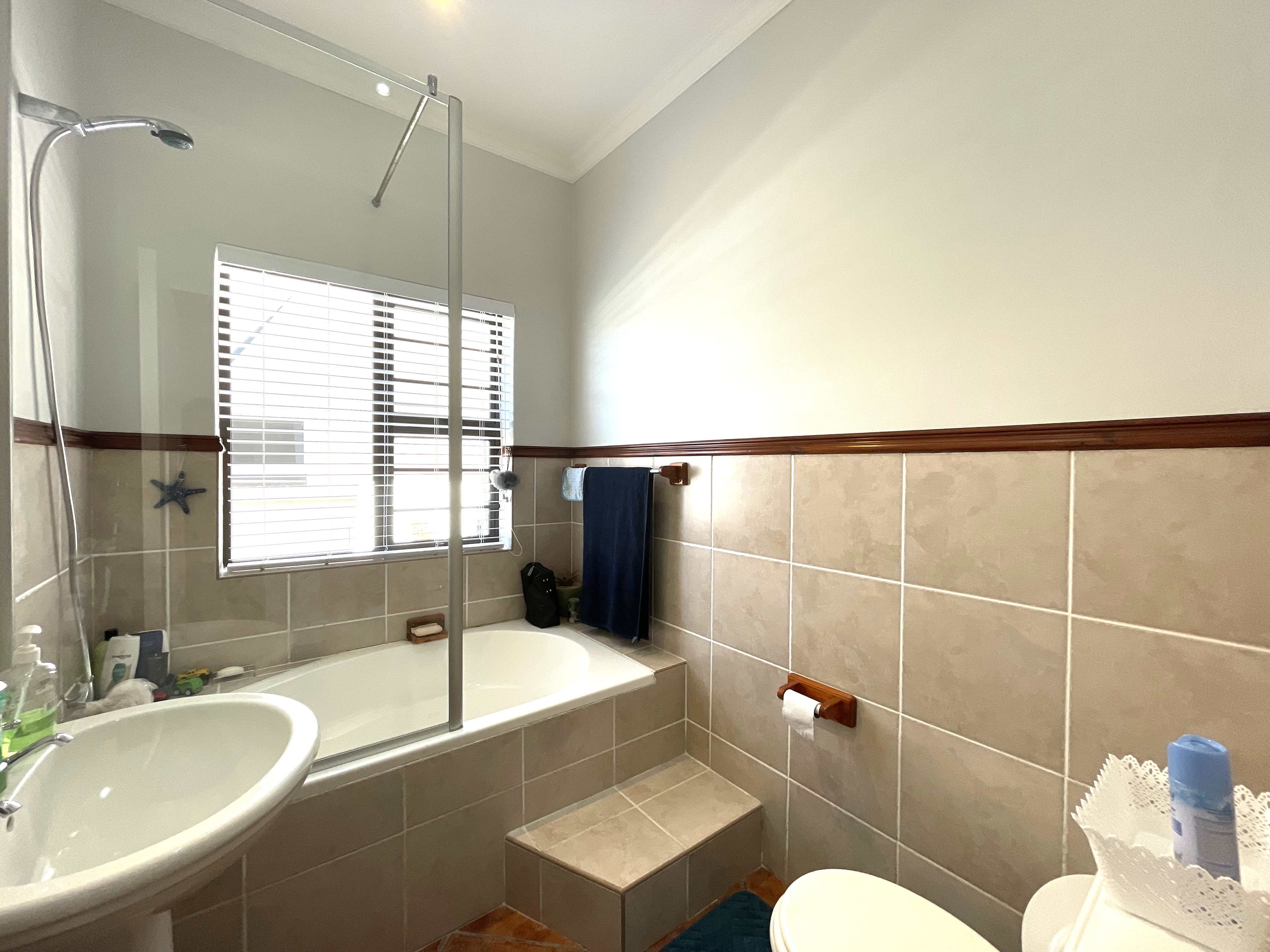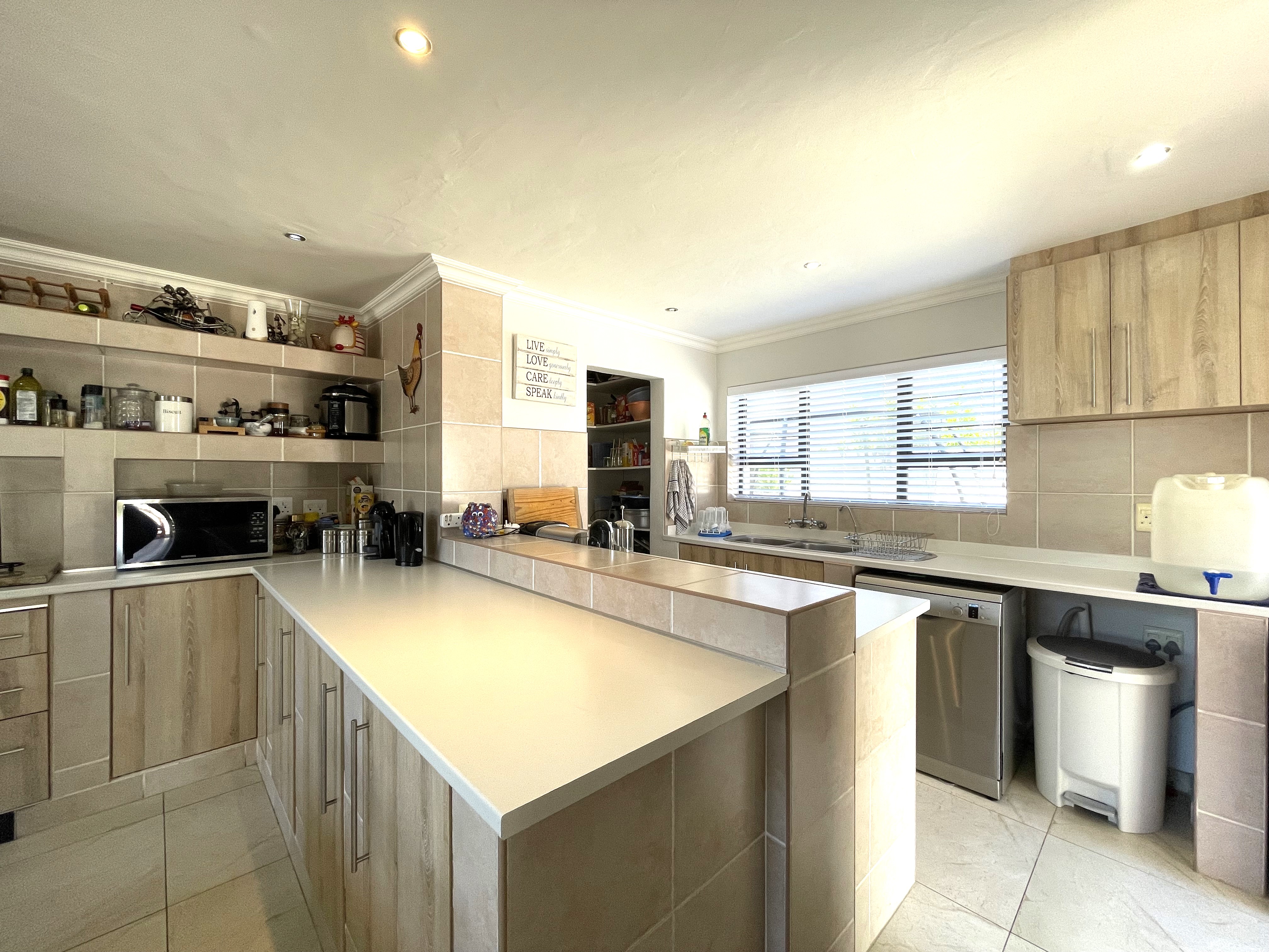 The main floor features three generously sized bedrooms, each equipped with built-in cupboards, and two well-appointed bathrooms. One of the bedrooms enjoys the luxury of a full en-suite with a shower, bath, basin, and toilet, while the second bathroom offers a combination of a bath, shower rose, basin, and toilet. Downstairs also accommodates a well-sized pantry, a separate scullery, and a laundry space, adding to the practicality of the home.