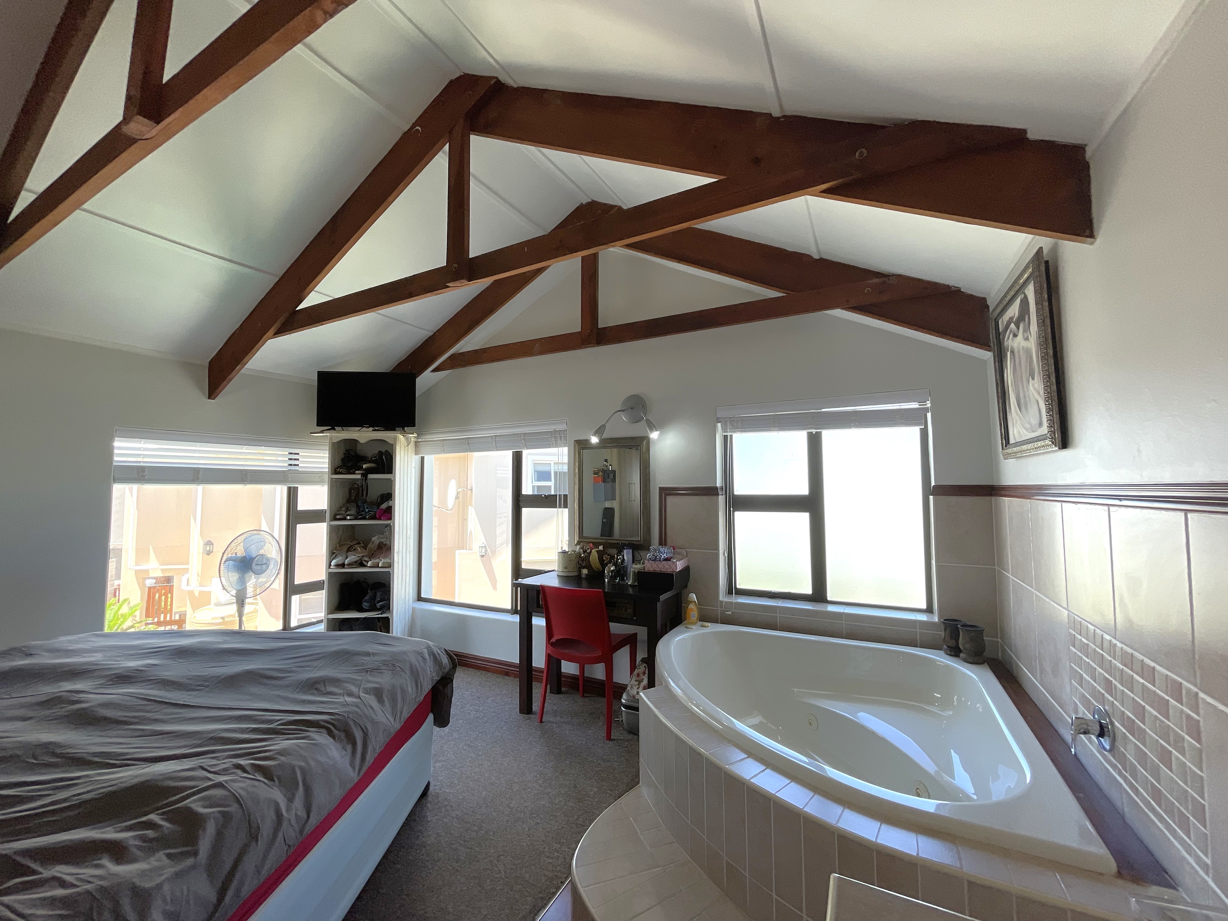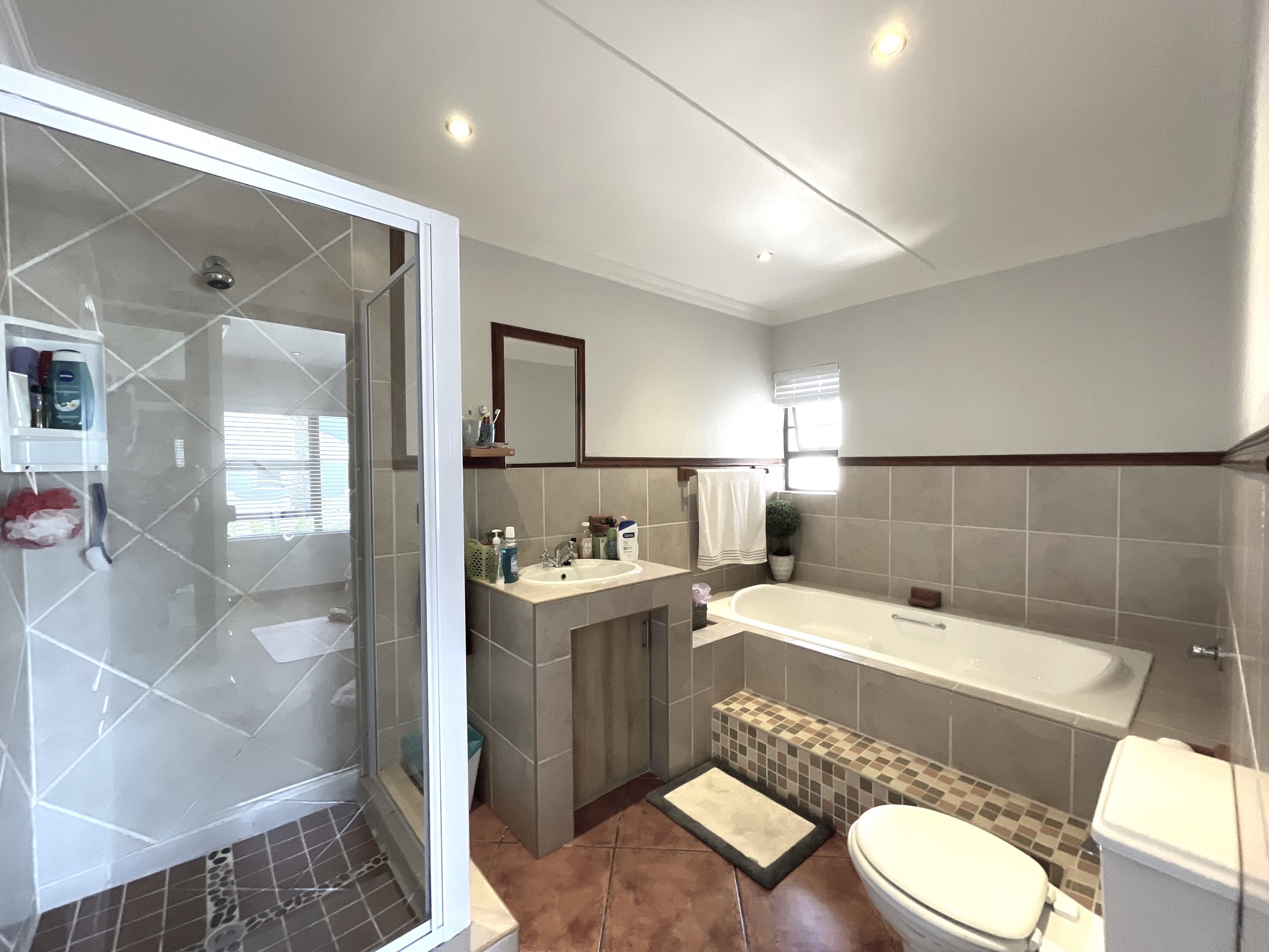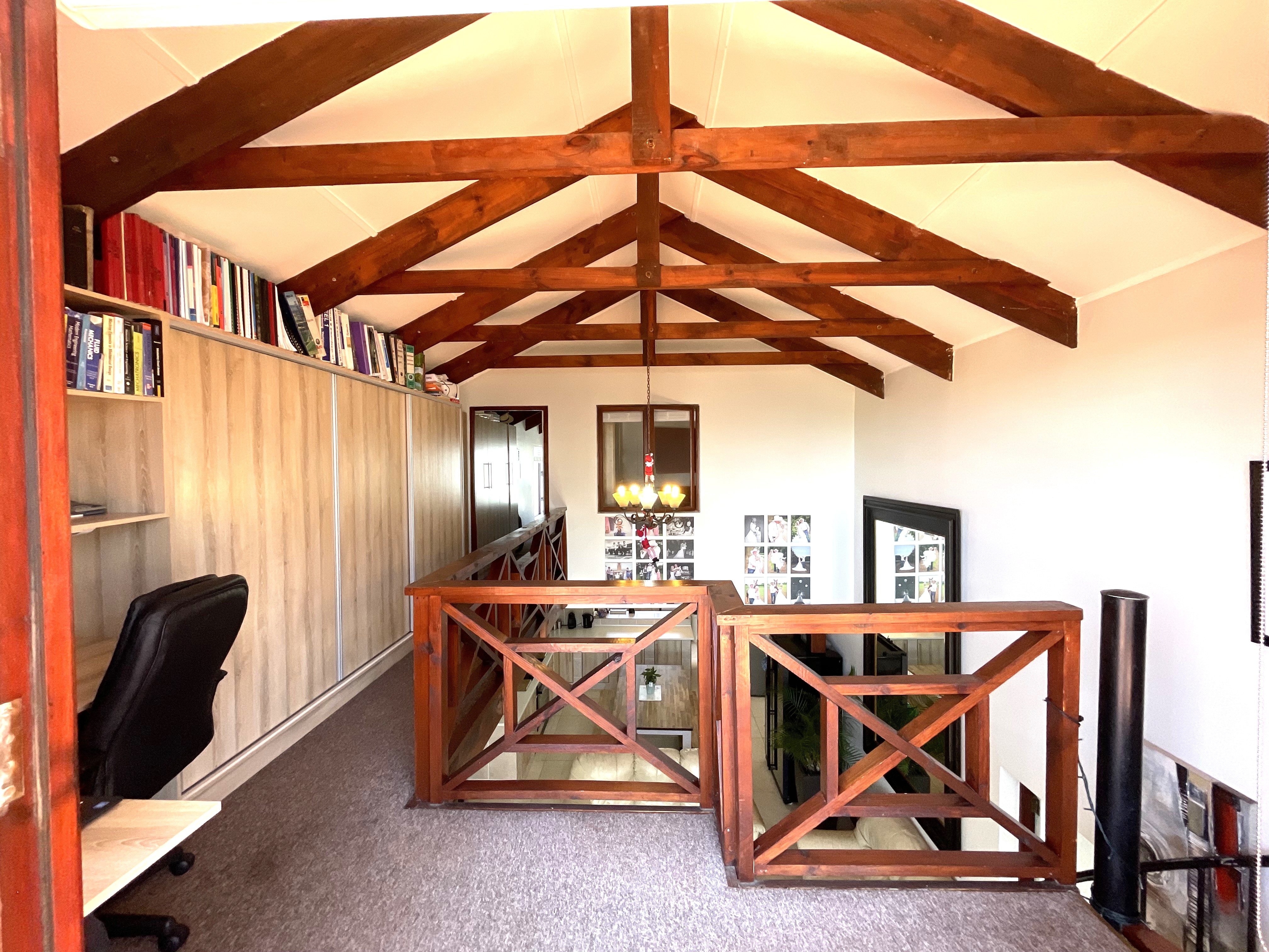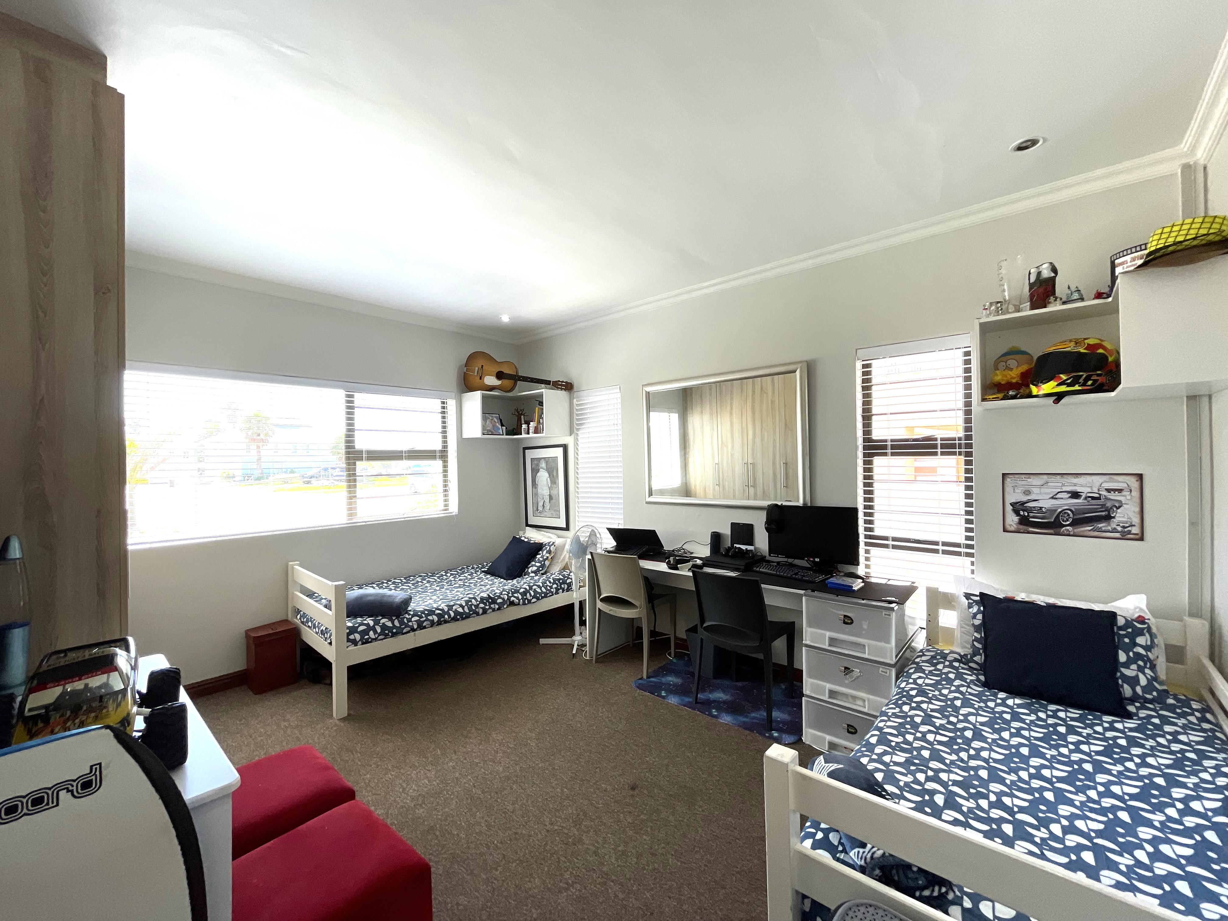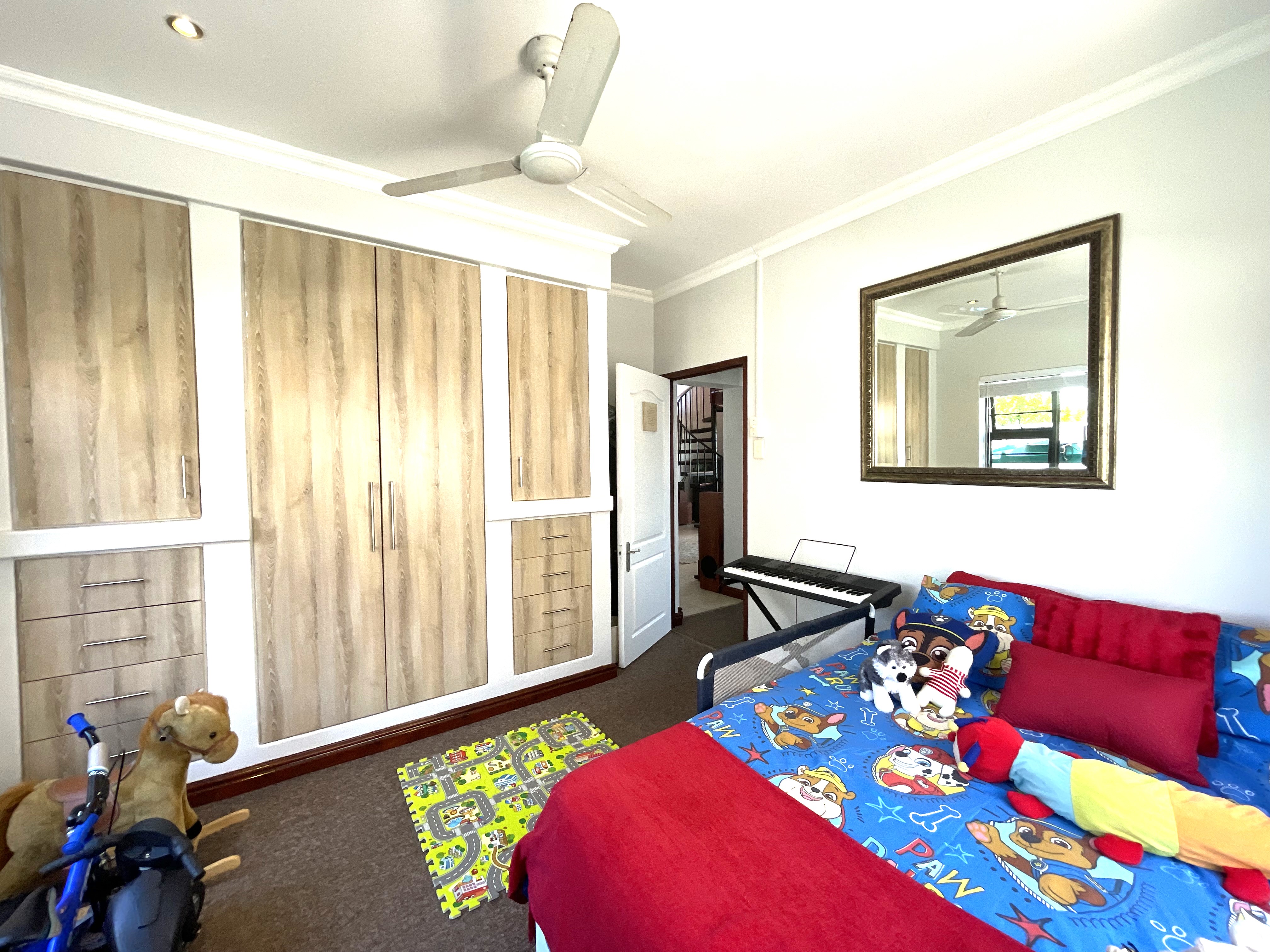 The main floor features three generously sized bedrooms, each equipped with built-in cupboards, and two well-appointed bathrooms. One of the bedrooms enjoys the luxury of a full en-suite with a shower, bath, basin, and toilet, while the second bathroom offers a combination of a bath, shower rose, basin, and toilet. Downstairs also accommodates a well-sized pantry, a separate scullery, and a laundry space, adding to the practicality of the home.