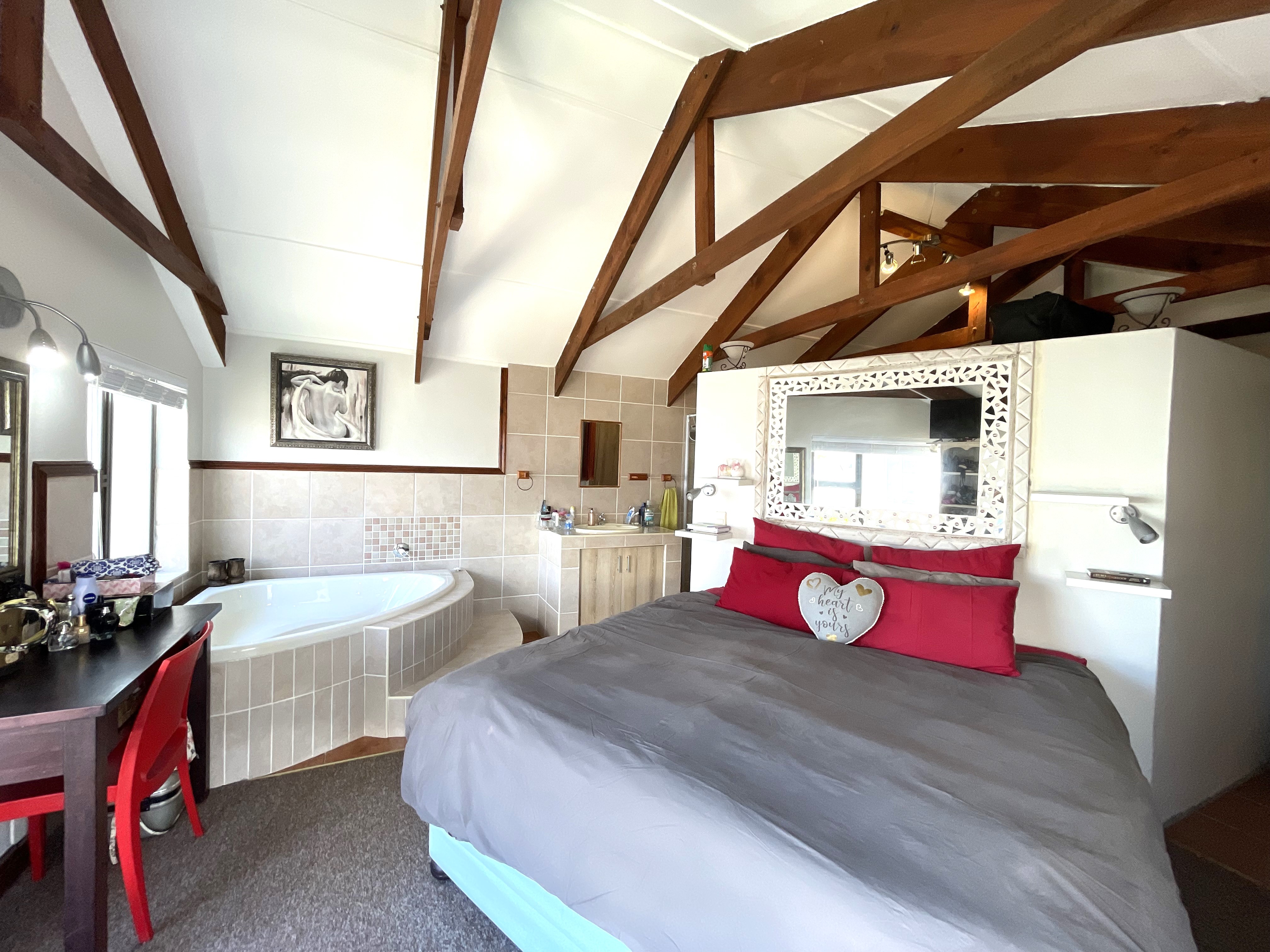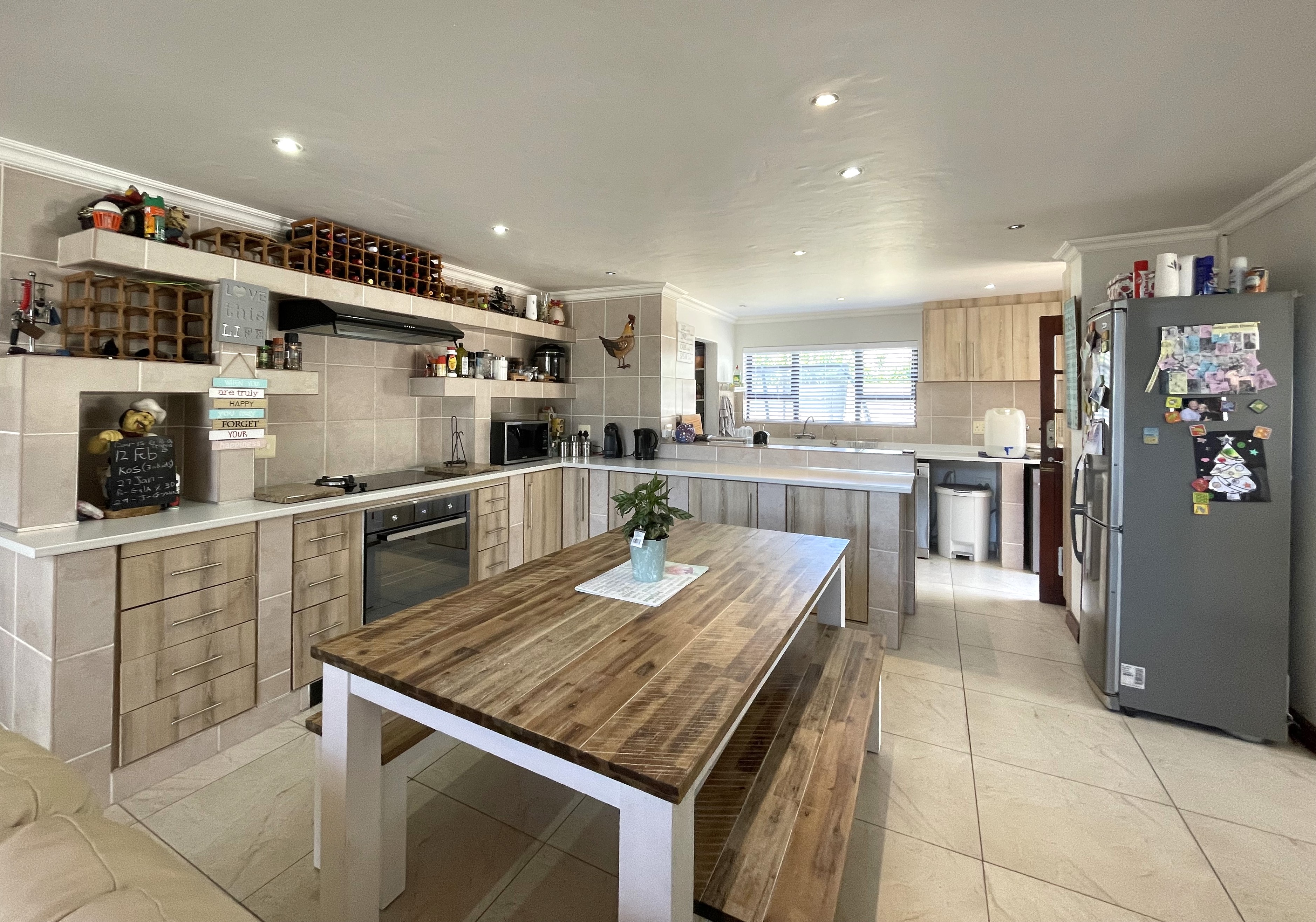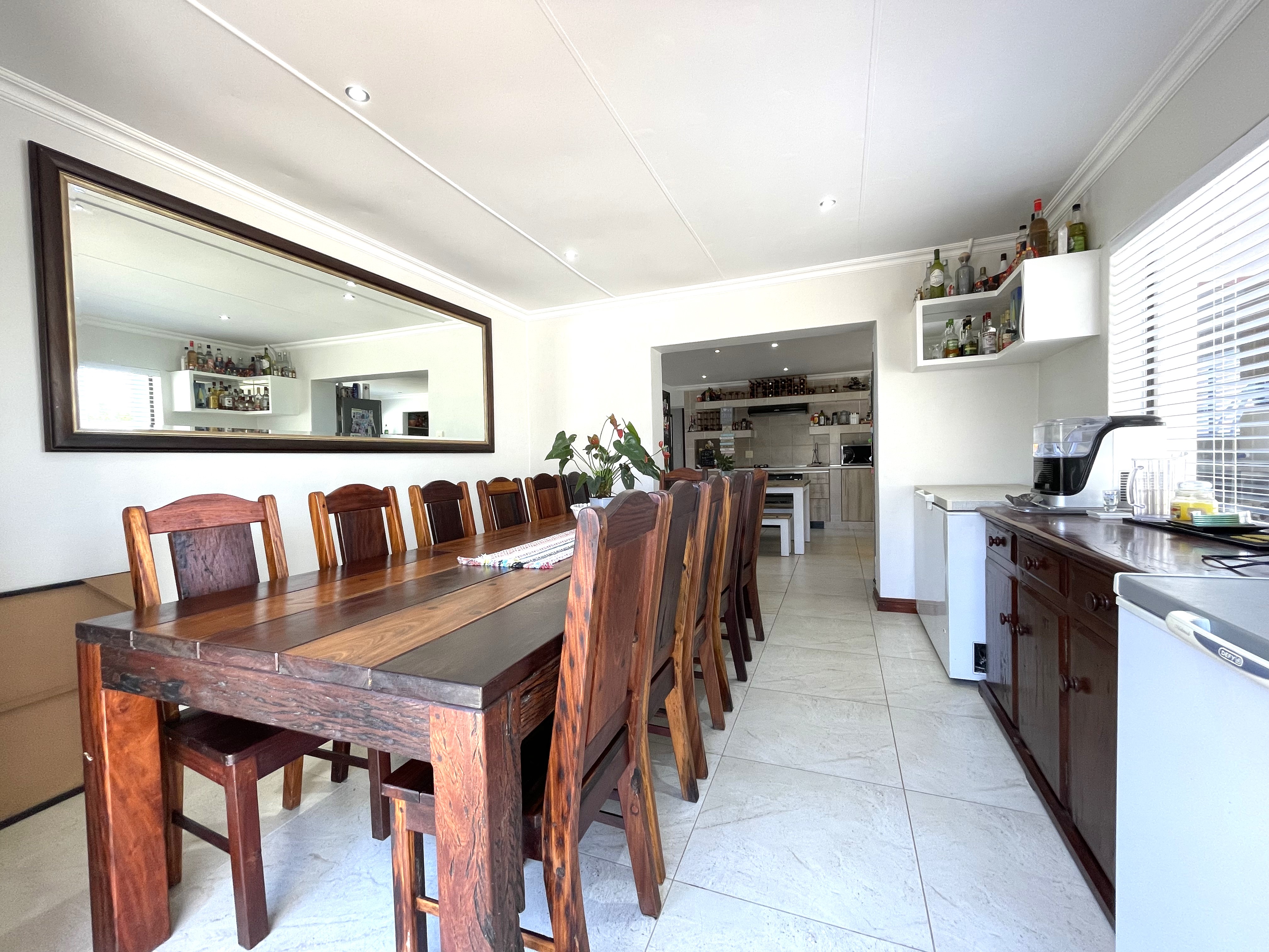 As you step onto this expansive 261 sqm property, a warm and inviting stoep welcomes you, creating the perfect space for relaxation and socializing with family and friends. Upon opening the double wooden doors, you are embraced by an open-plan design that seamlessly integrates a TV lounge, dining area, and a beautifully renovated farmhouse kitchen. The kitchen, a highlight of the home, boasts ample cupboard space, a double fridge, and modern amenities, catering to the needs of any chef.