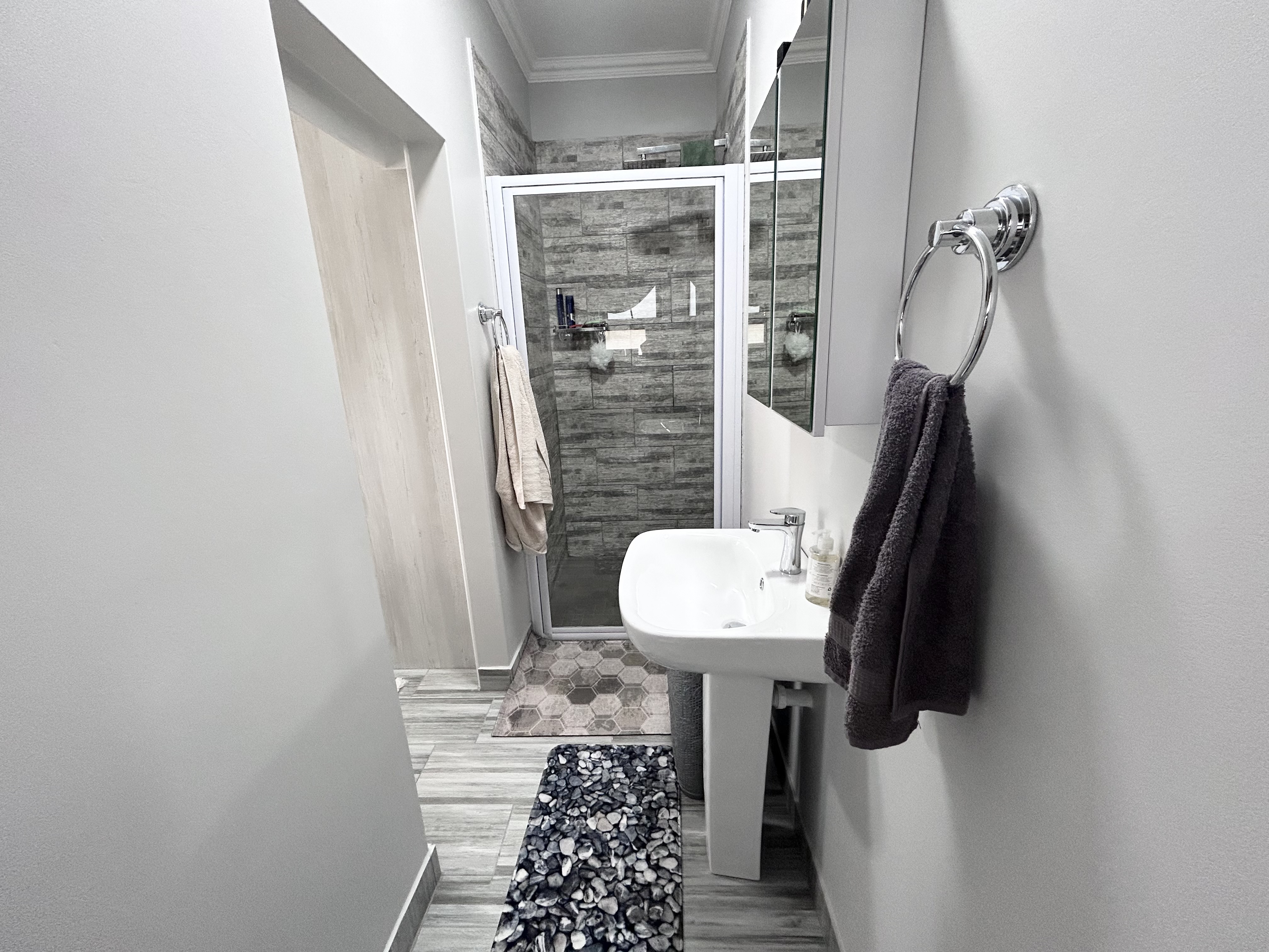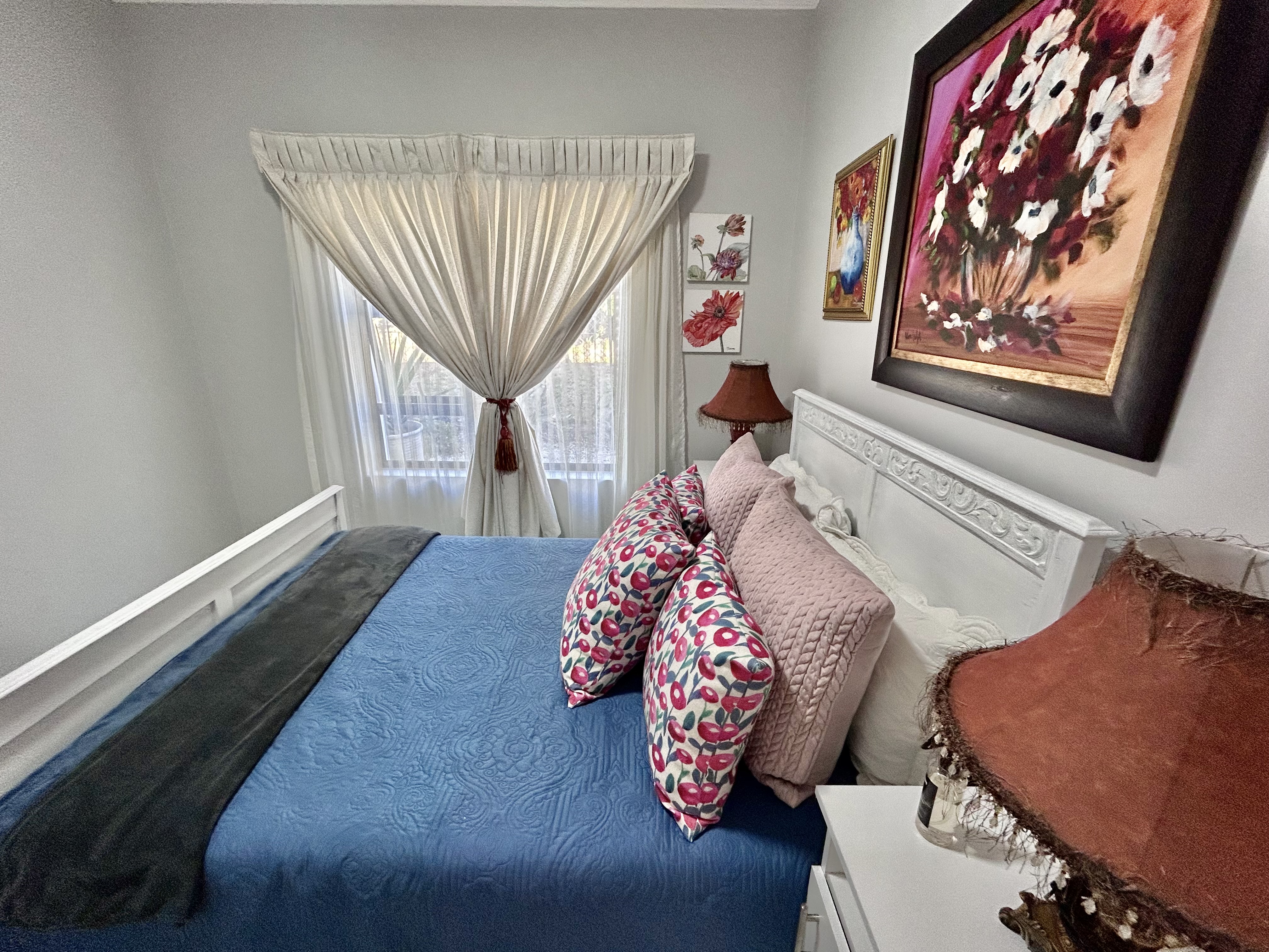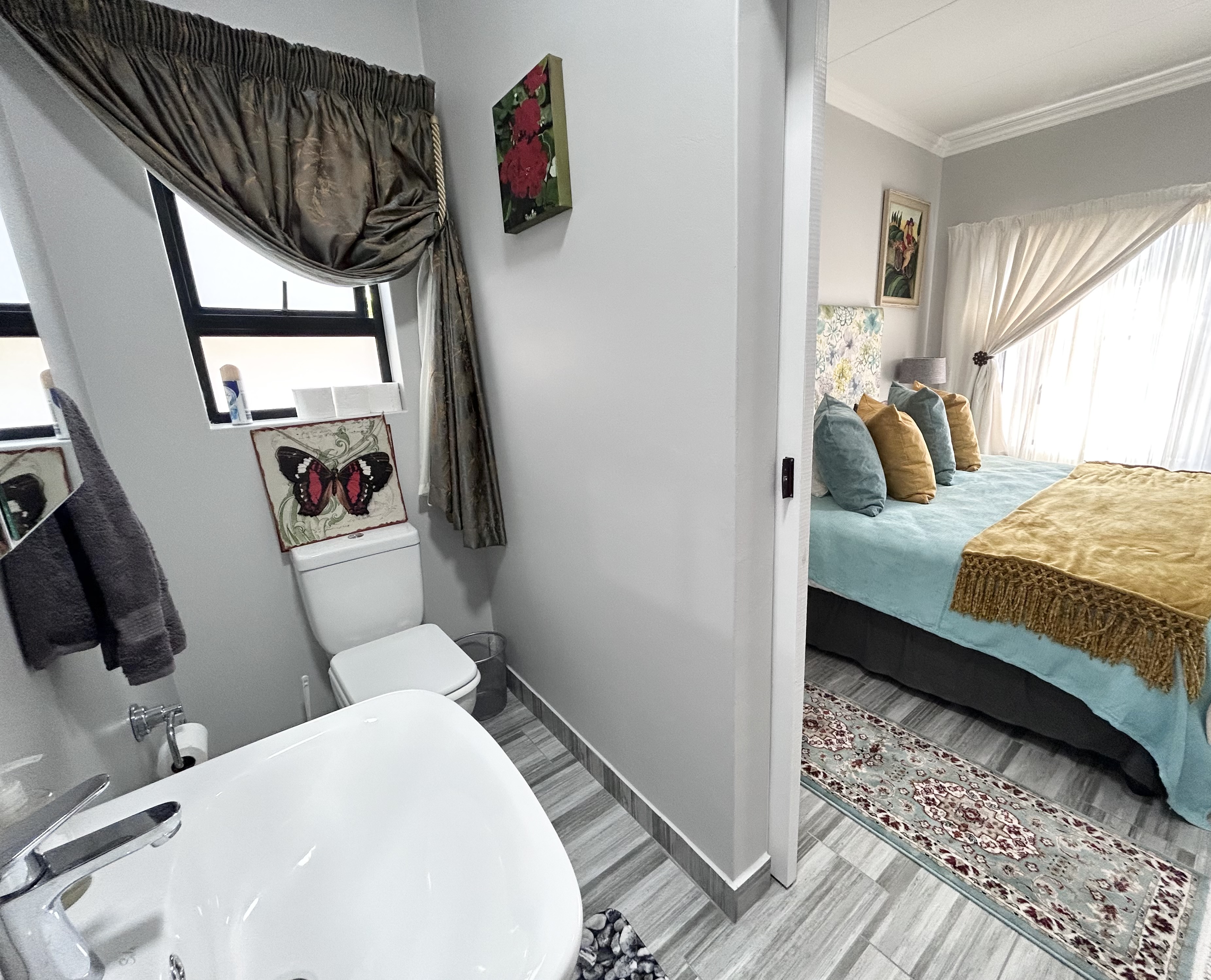 The living area is enhanced by a built-in stainless-steel braai and prep bowl, ideal for entertaining throughout the year. Sliding doors open onto a tiled patio and private garden, creating a seamless indoor-outdoor flow — perfect for relaxed gatherings or quiet enjoyment.