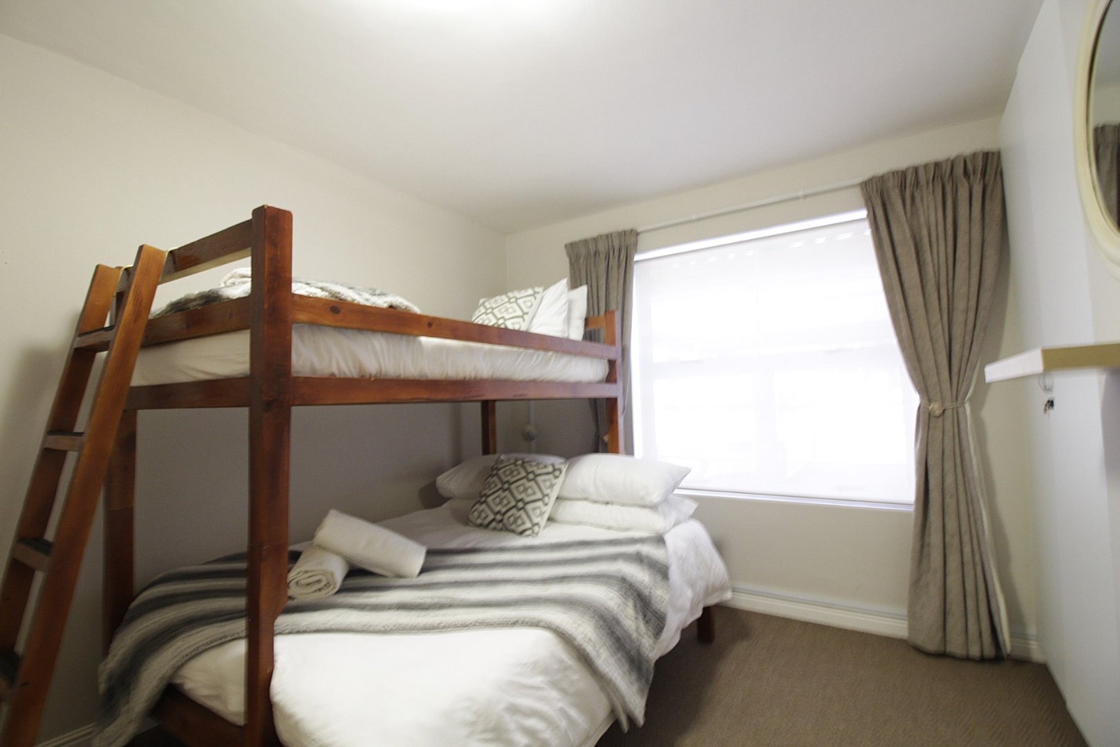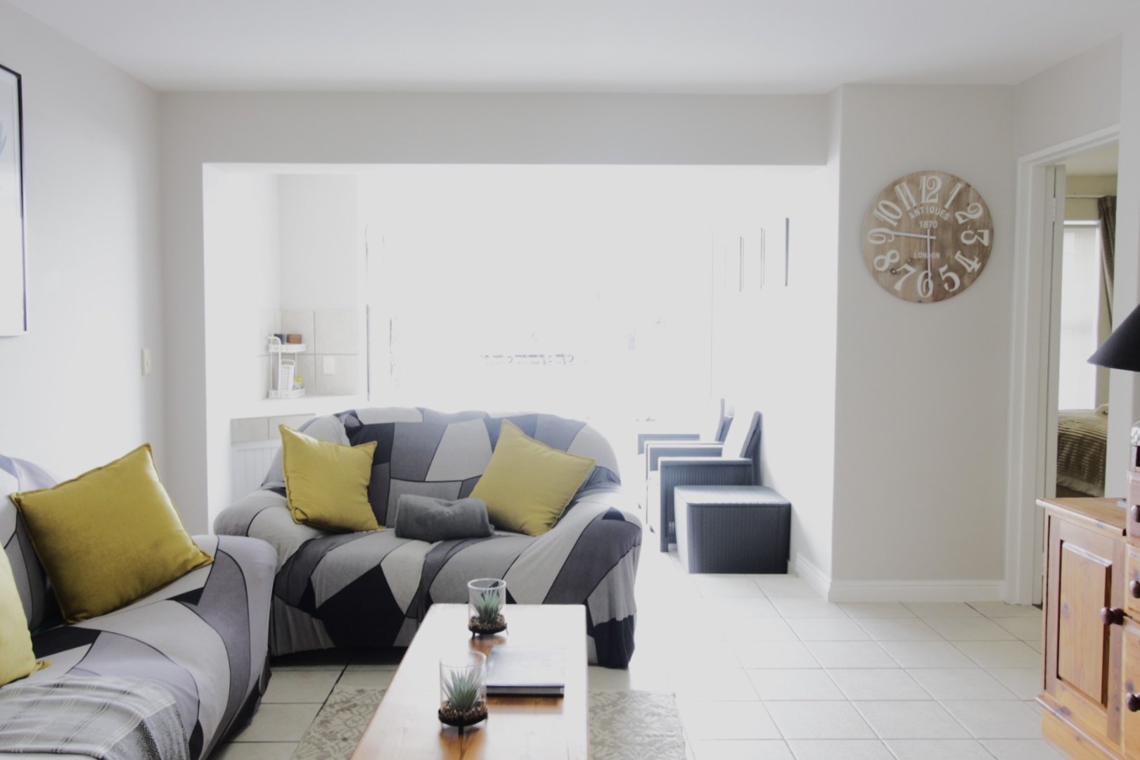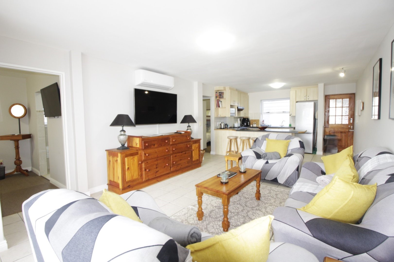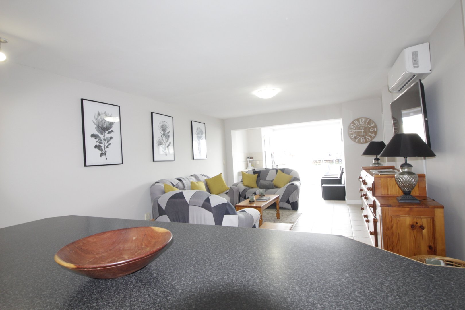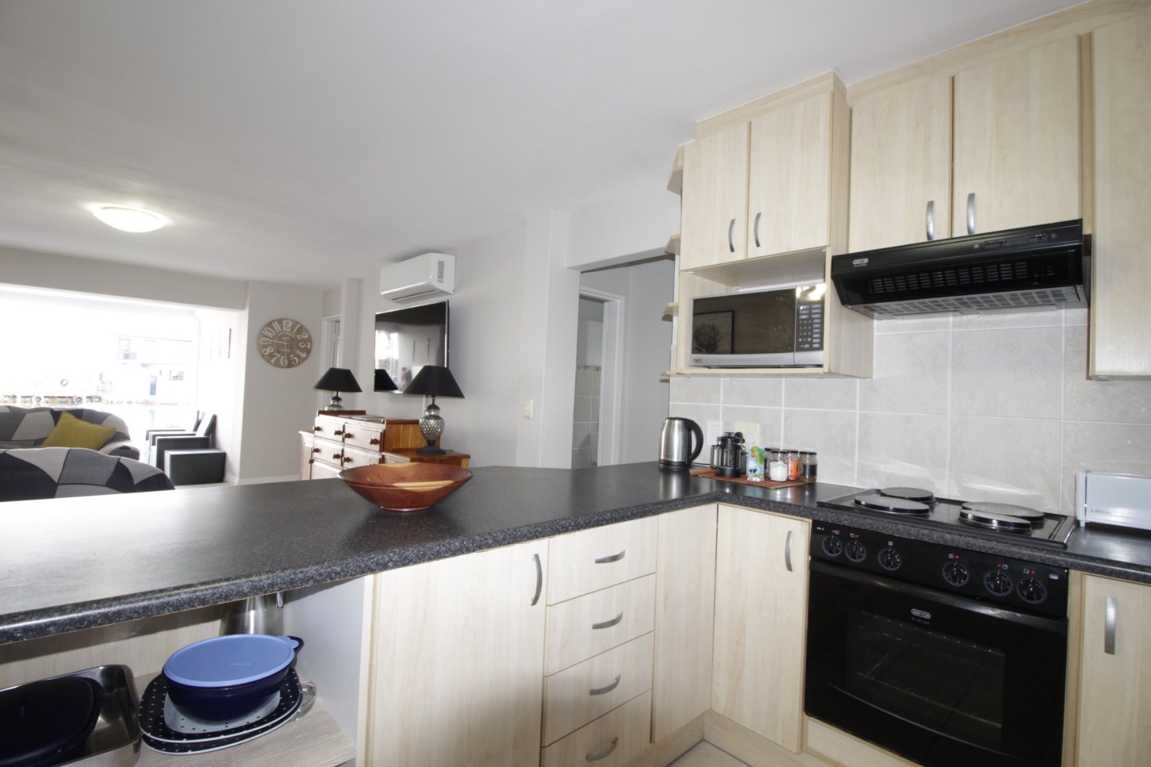 Inside, the open-plan layout blends a well-equipped kitchen with abundant cupboard space and a comfortable lounge, cooled by an air conditioner.