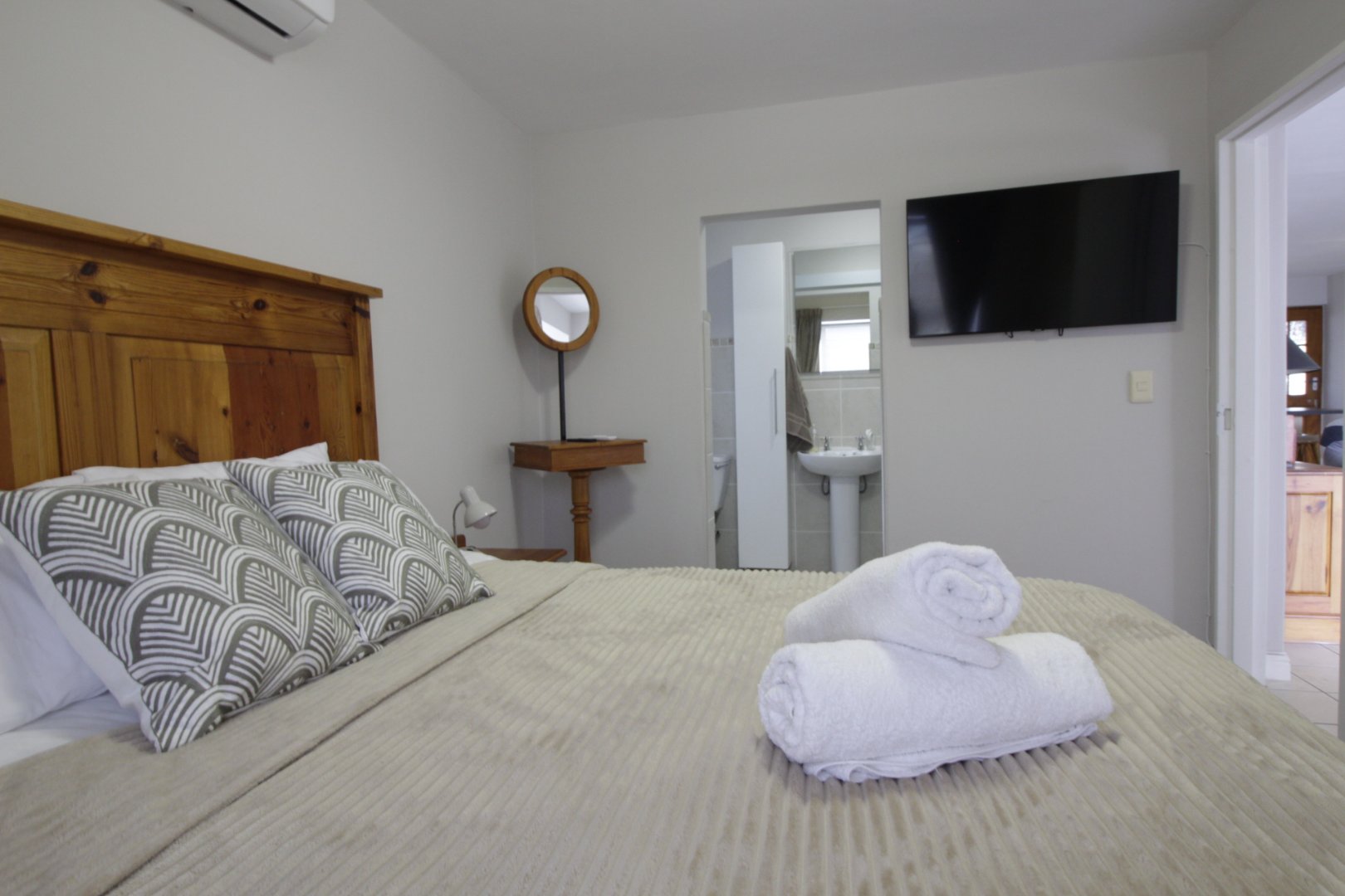 The main bedroom offers a serene water view and an en-suite bathroom. There is one additional guest bedroom and a spacious guest bathroom.