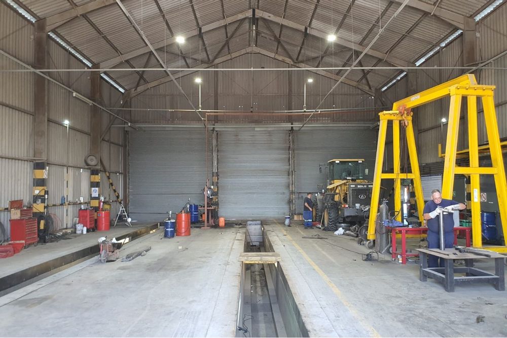 Maintenance pits, wash bay, and multiple outbuildings/workshops