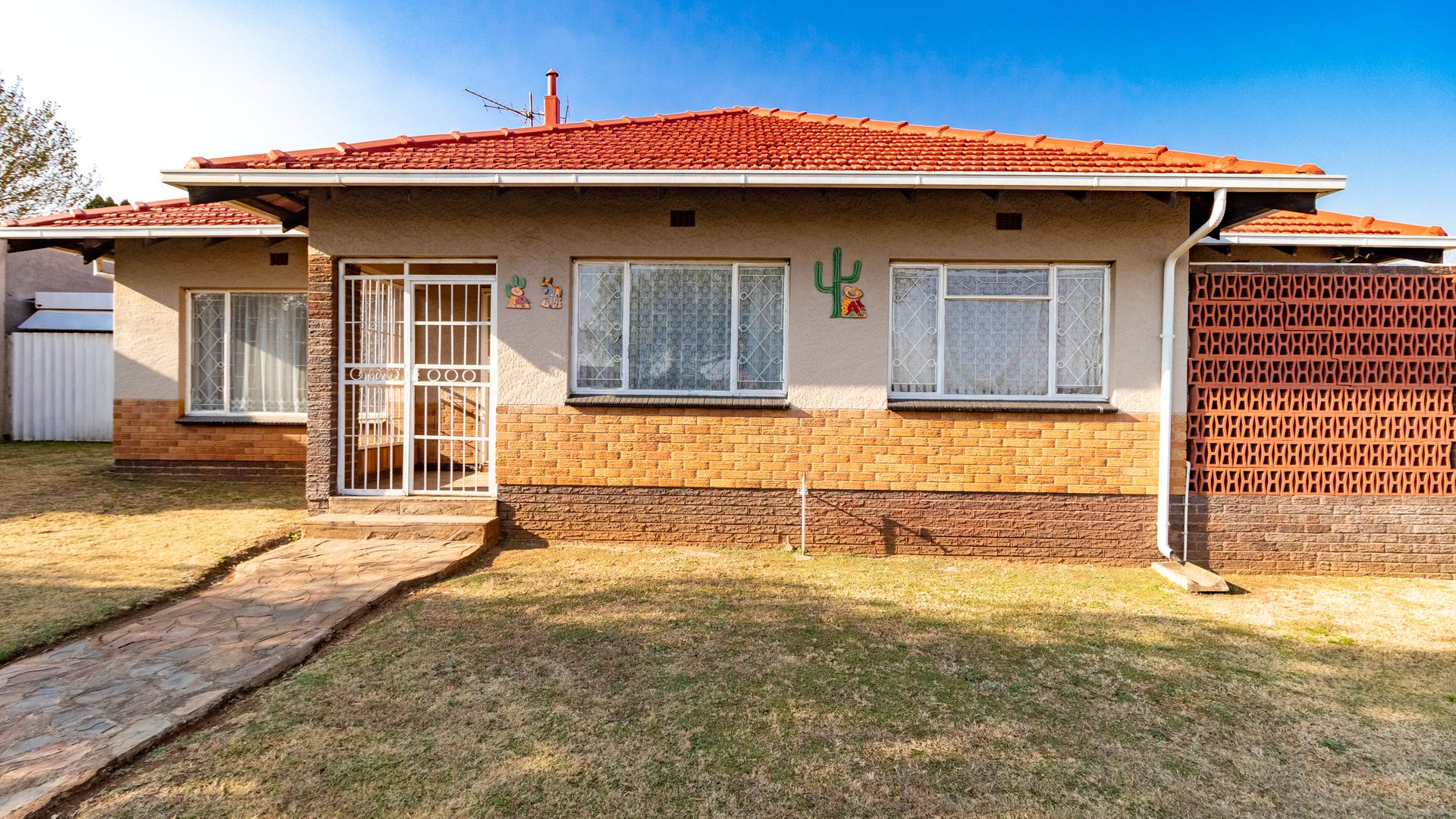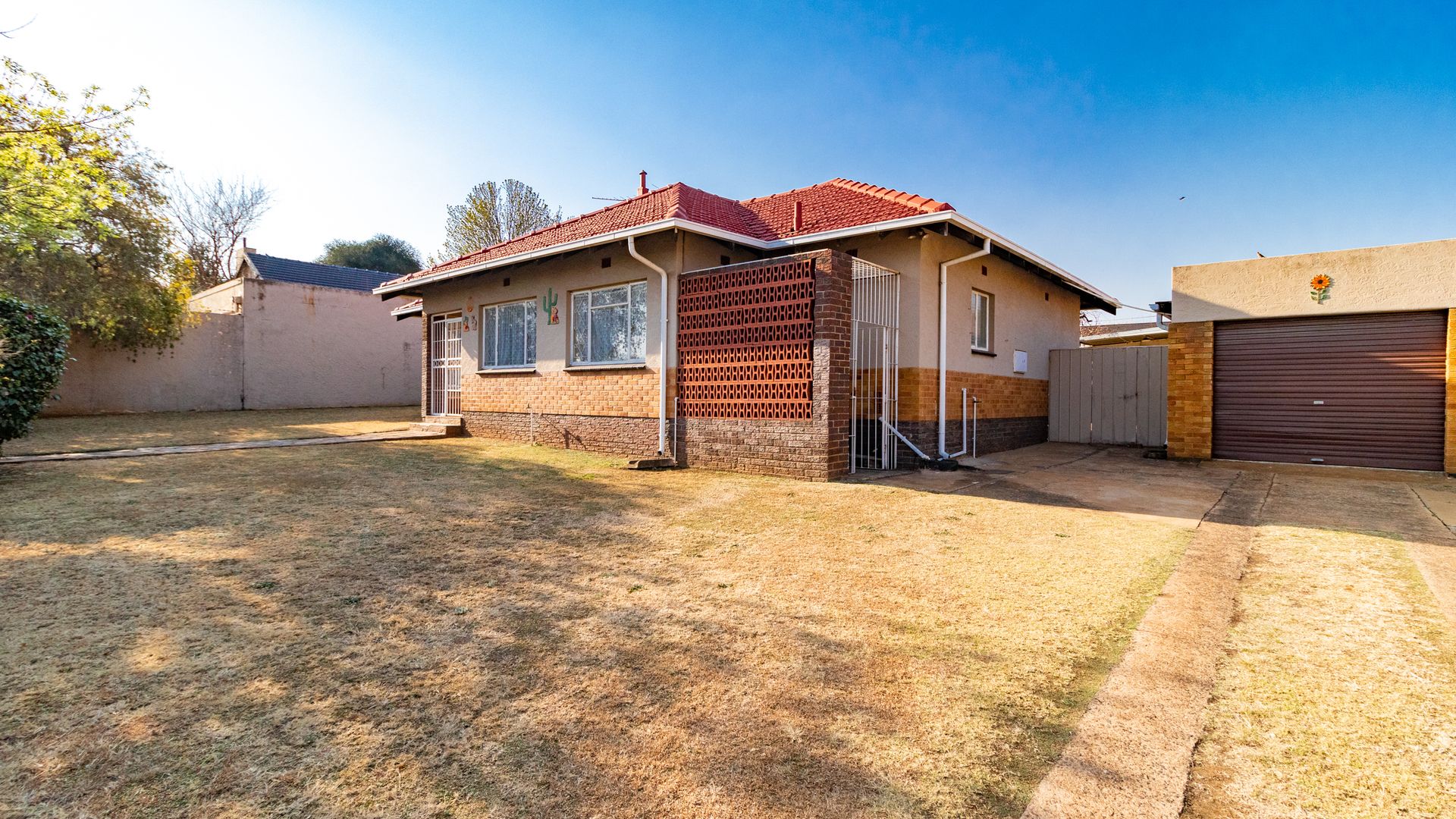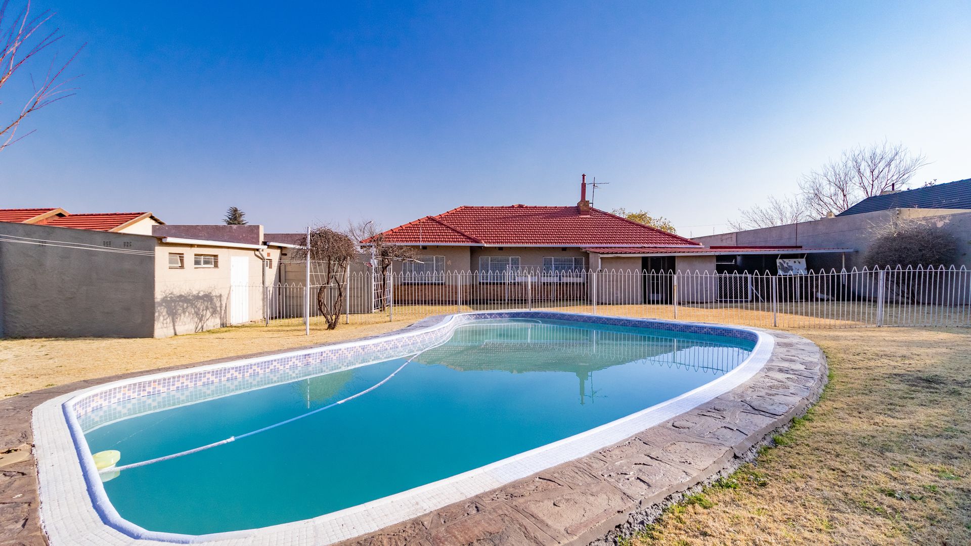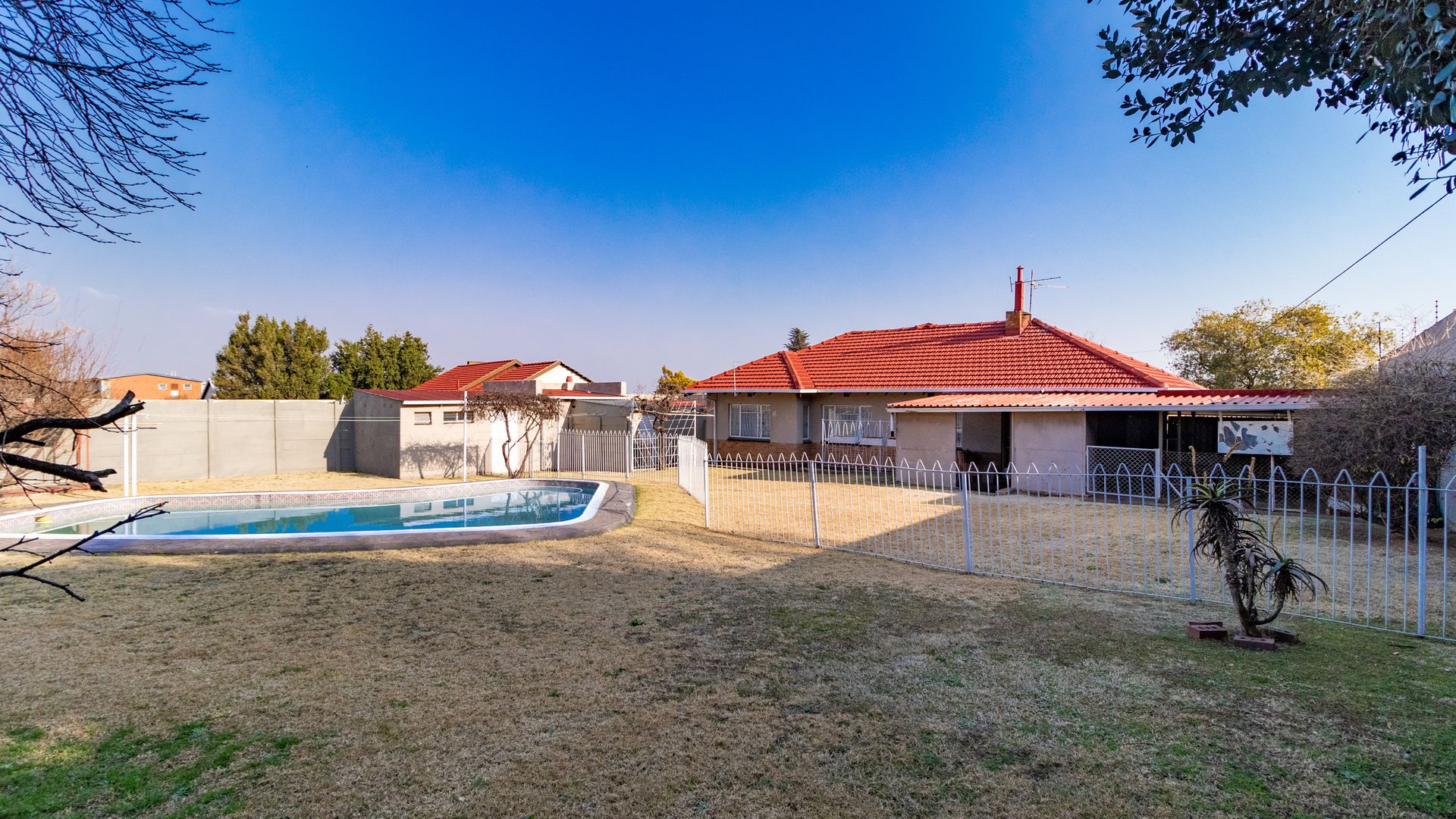 Charming north-facing family home offering 3 generously sized bedrooms and 1 bathroom, set on a spacious stand with a sparkling swimming pool. The separate dining room may be converted into a study or 4th bedroom.
