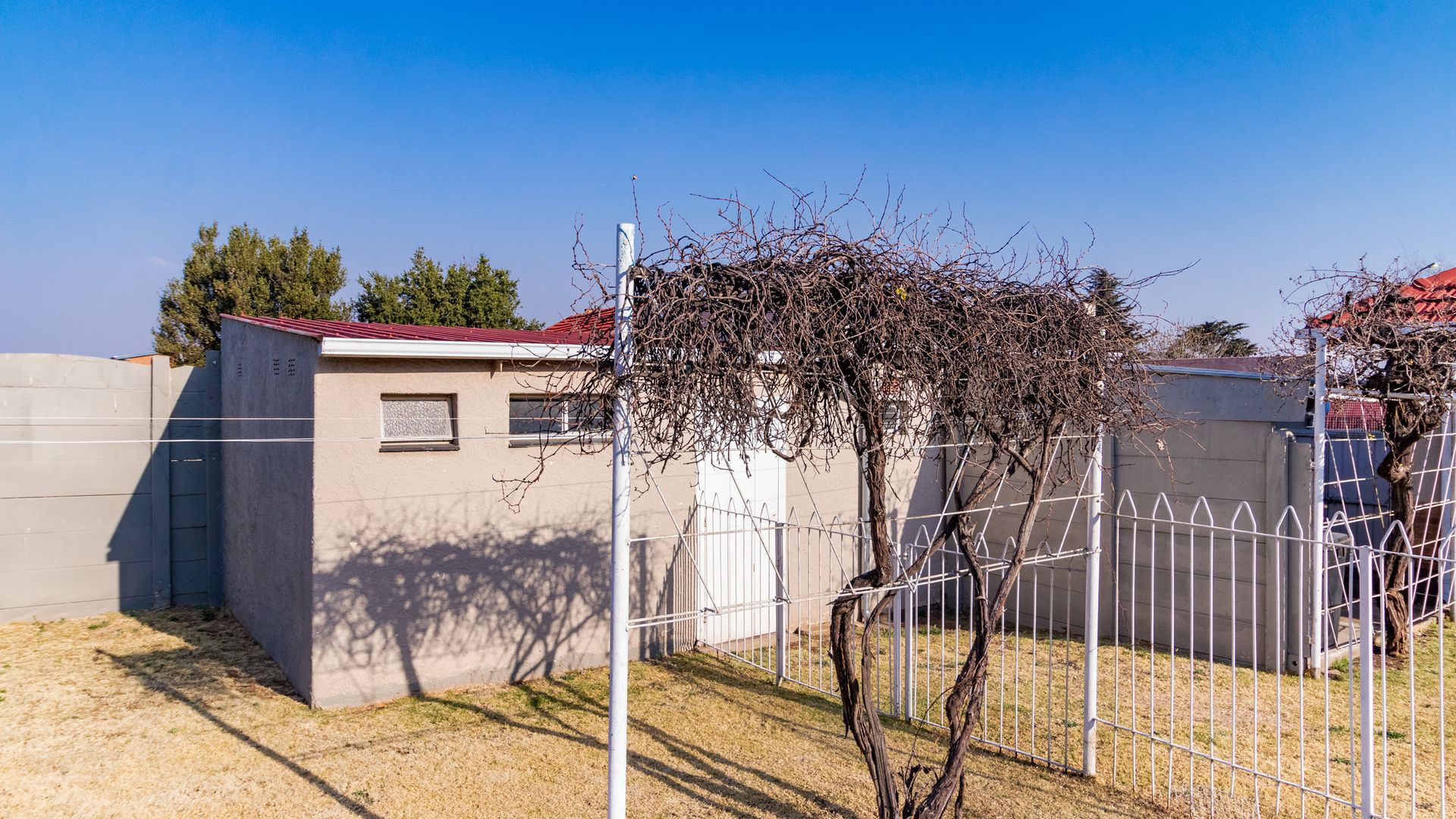 Security features include a newly upgraded alarm system linked to armed response plus an electric front gate. All windows and doors are secure with bars. Very private due to the 9 foot walls on the sides and back of the property.
