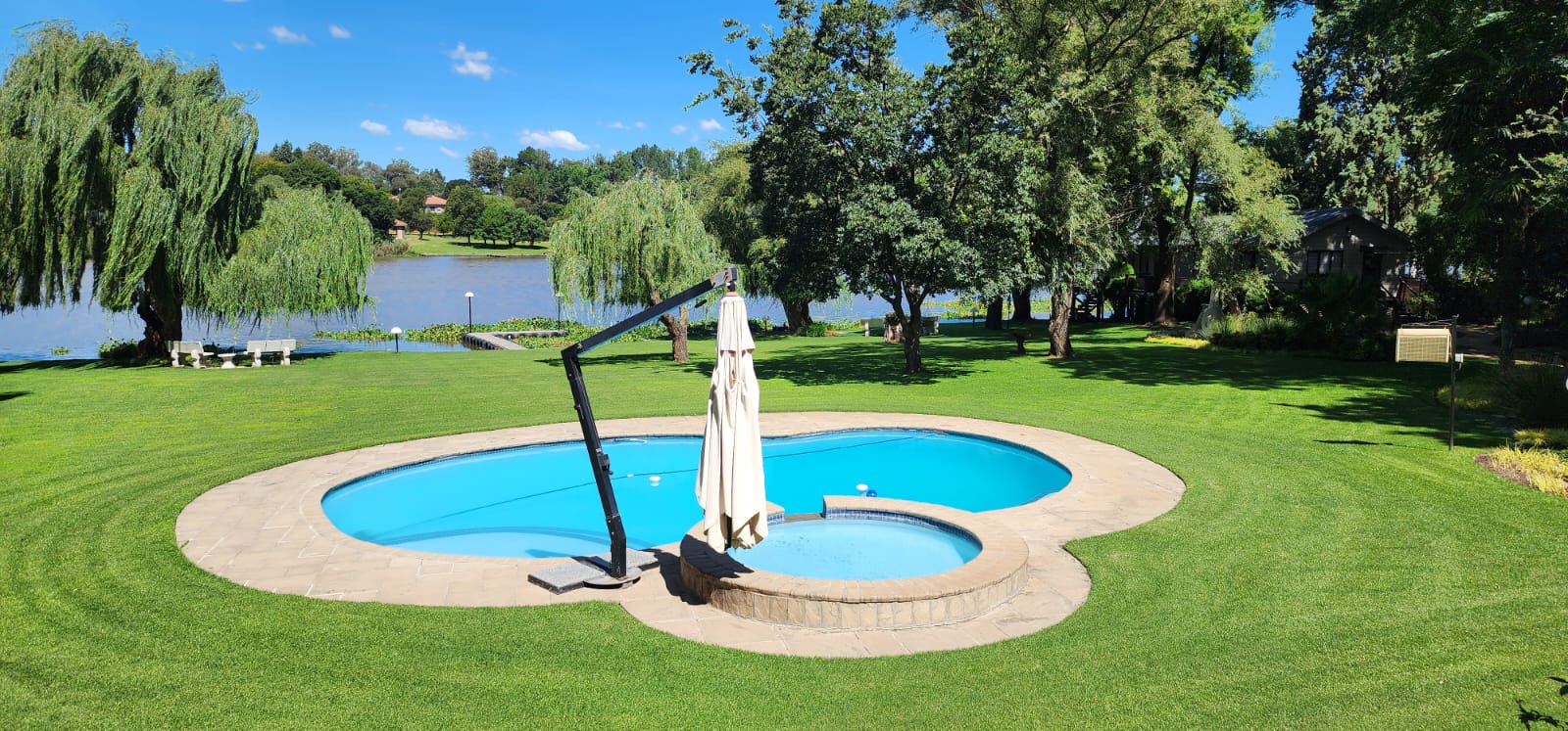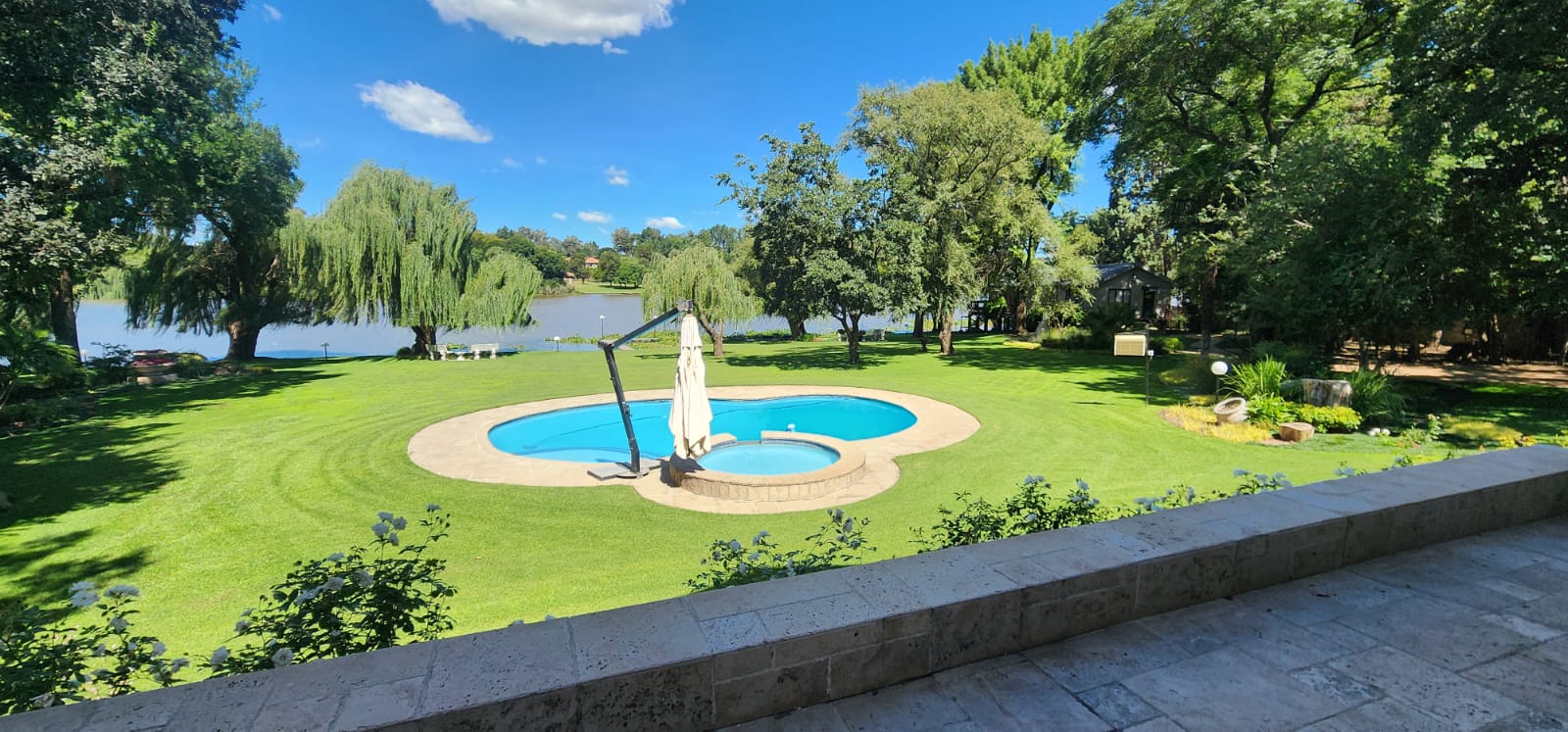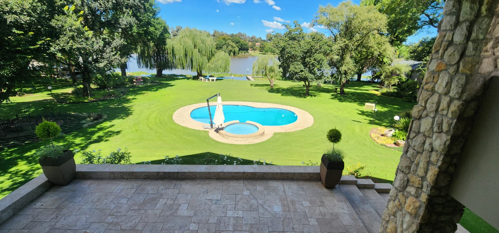 There is also a beautiful swimming pool between the river and the main house.