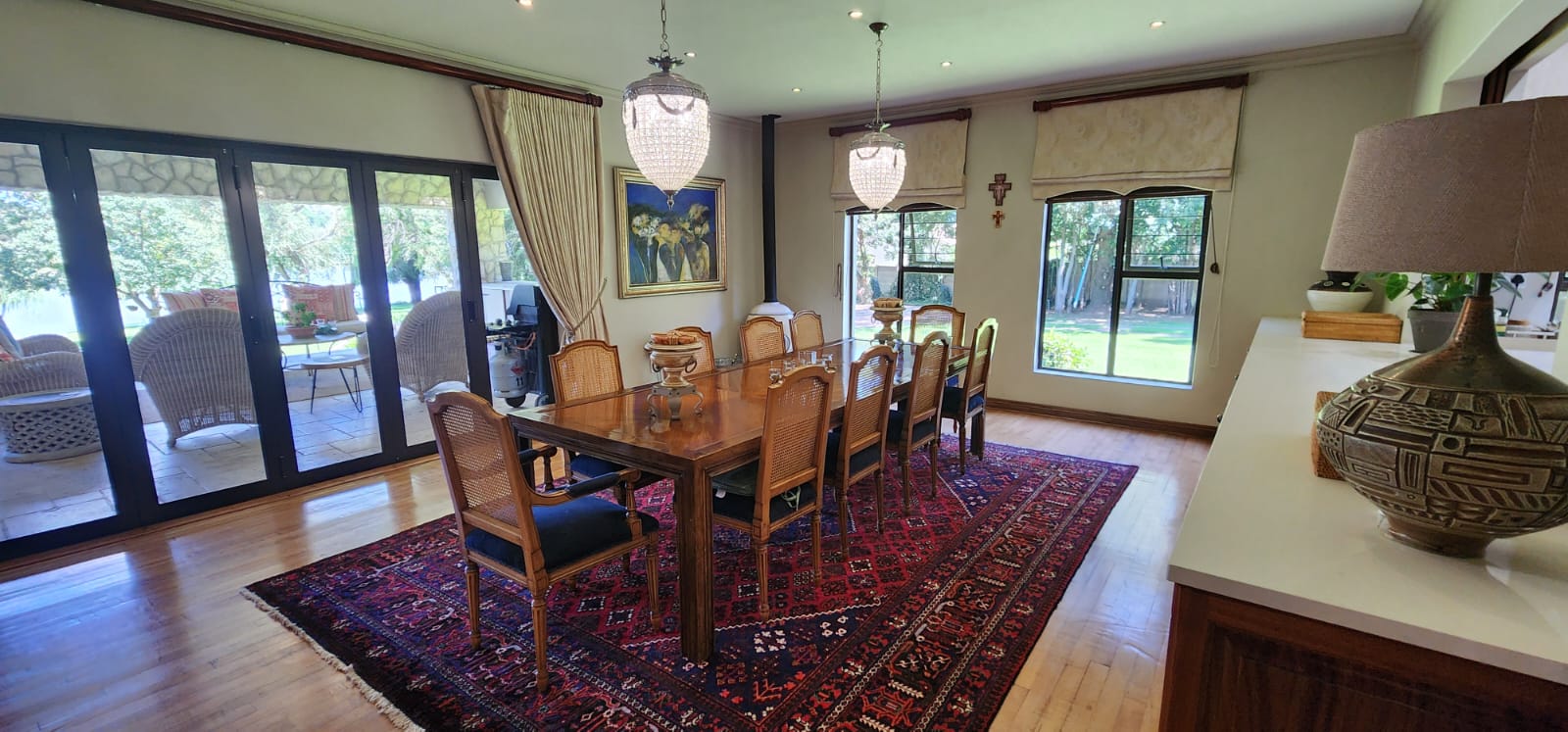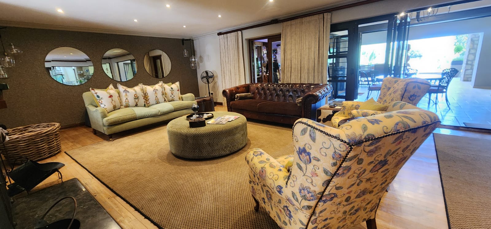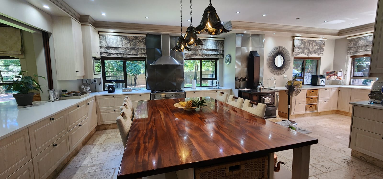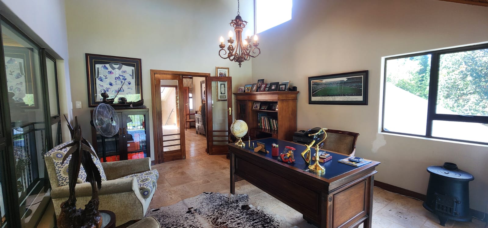 Enjoy cozy evenings in the lounge or host elegant dinners in the dining room, both embellished with three charming fireplaces and ceiling fans for year-round comfort.