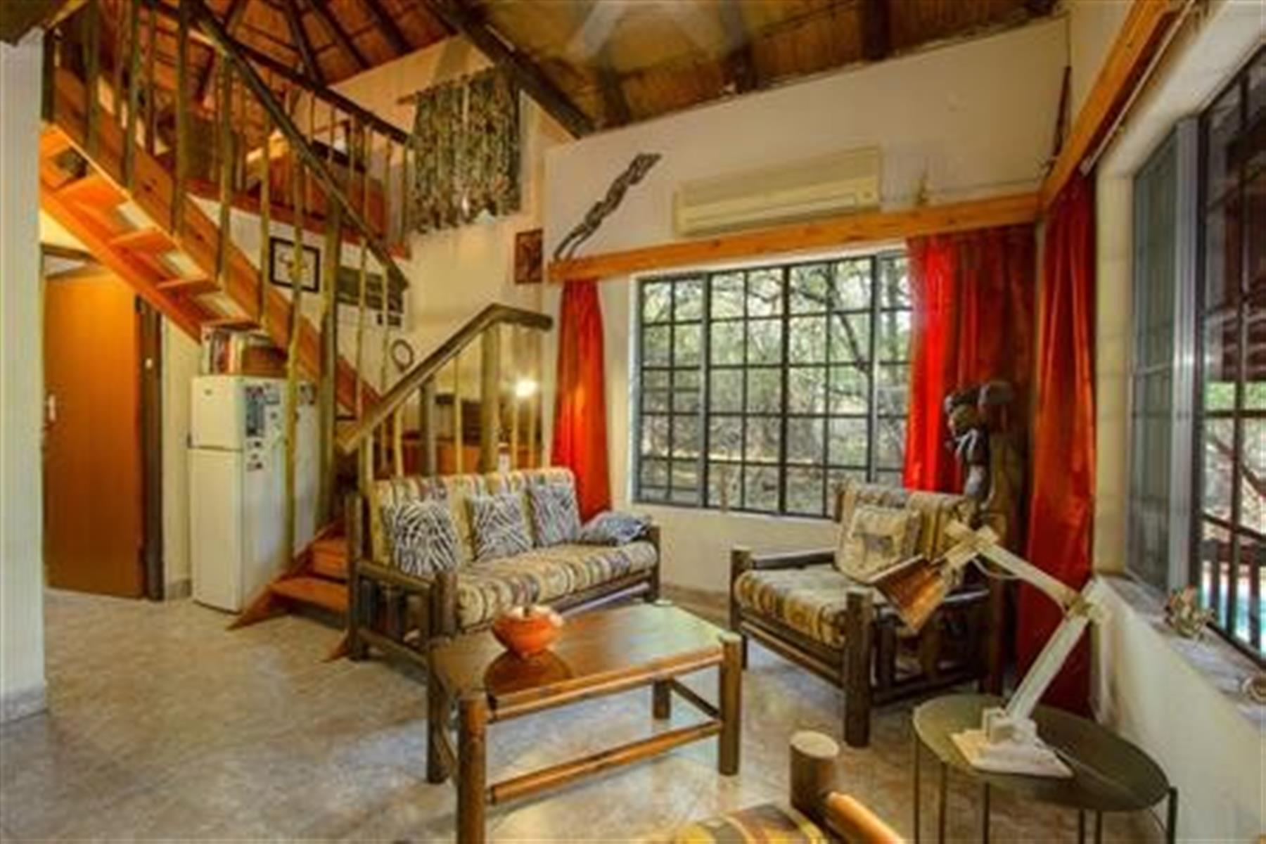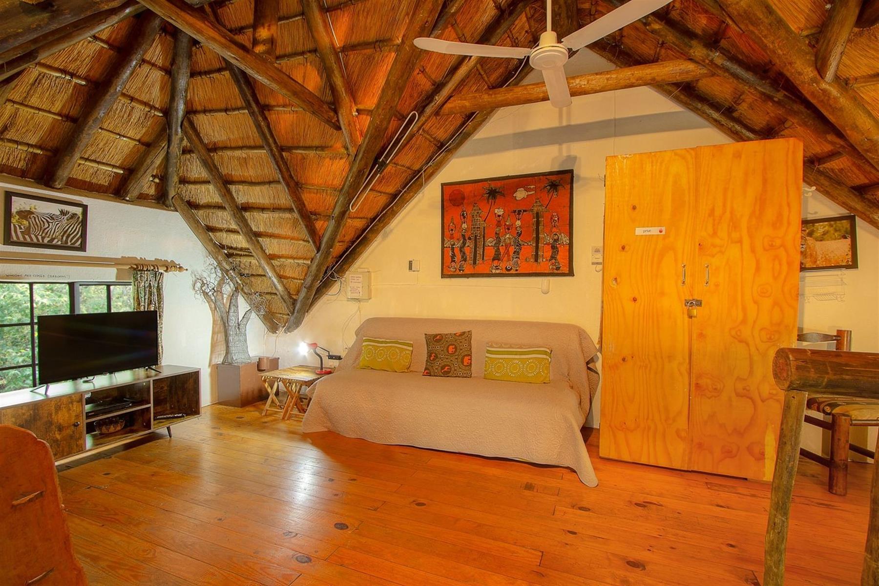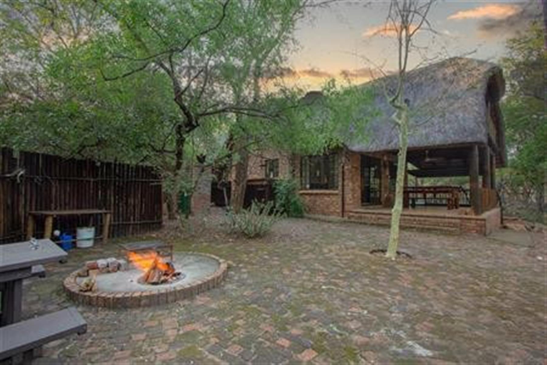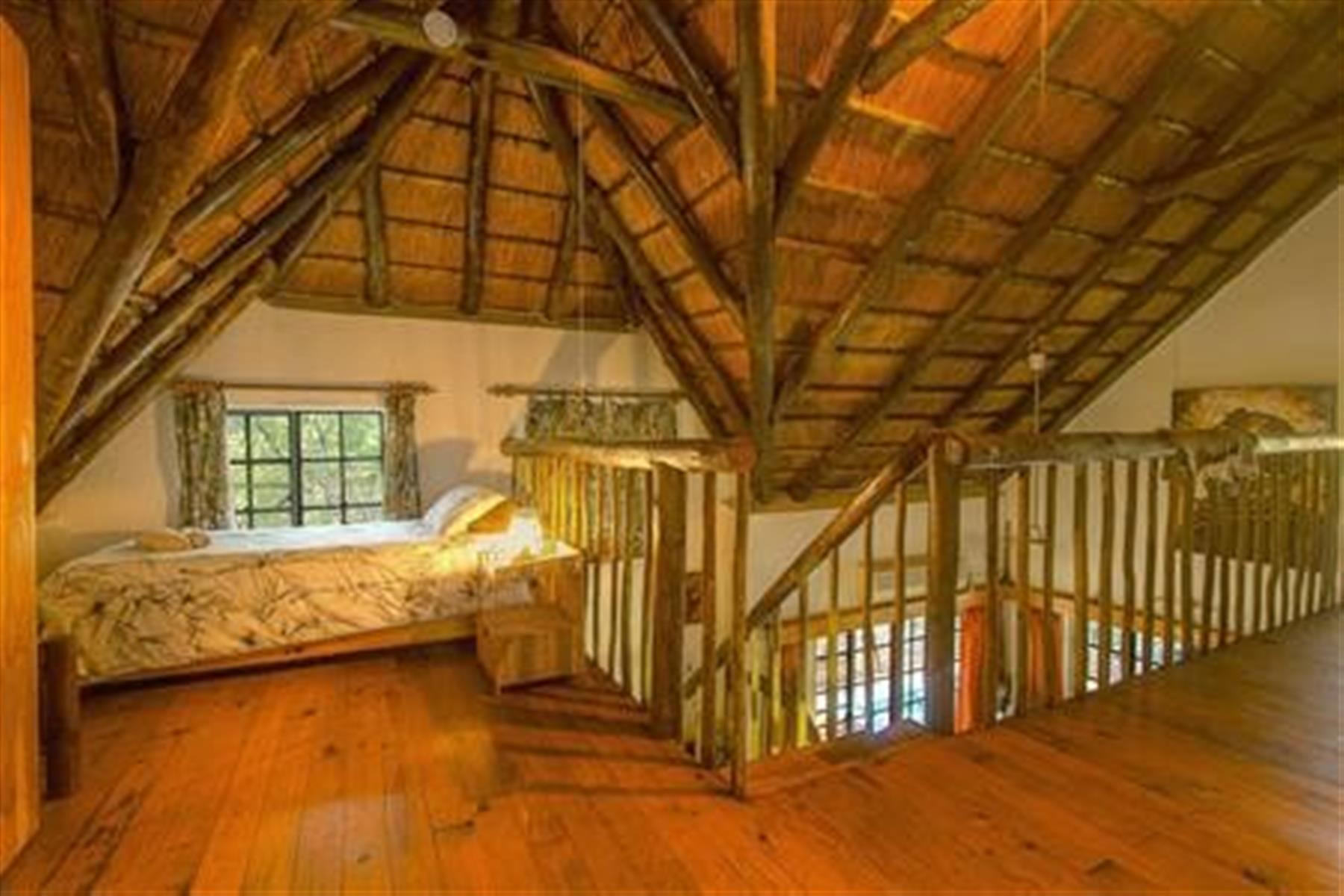 The home is detached and furnished in a classic, rustic style, featuring a traditional thatched roof ,that blends beautifully into the bush surroundings.