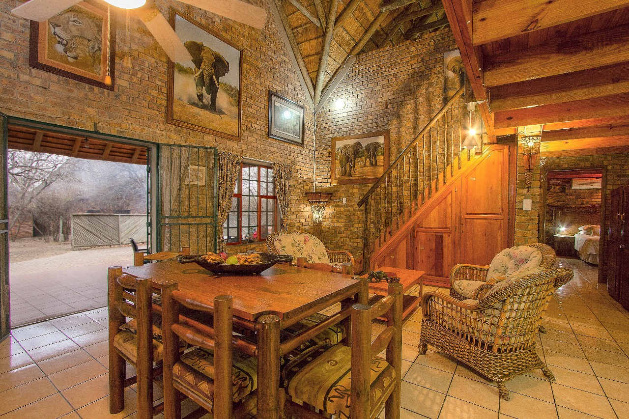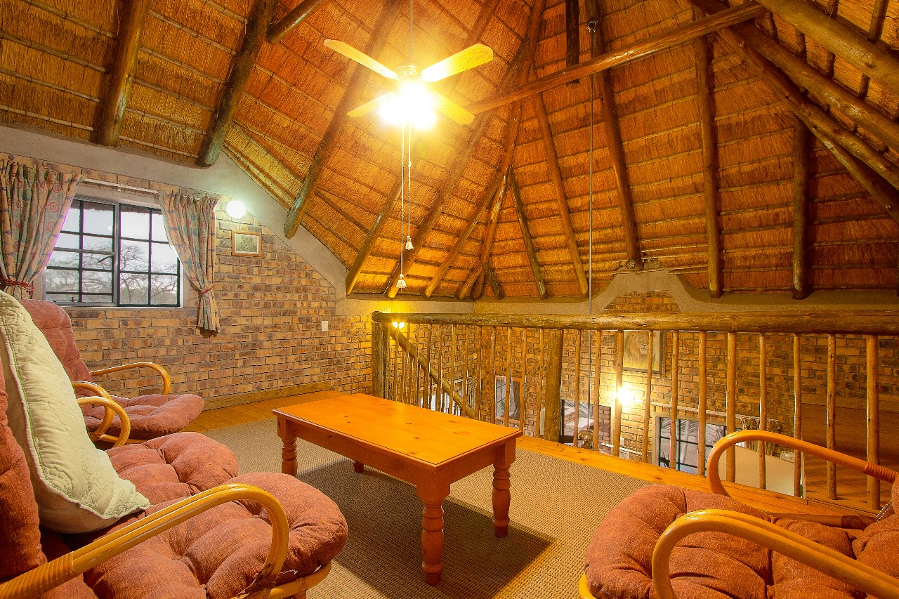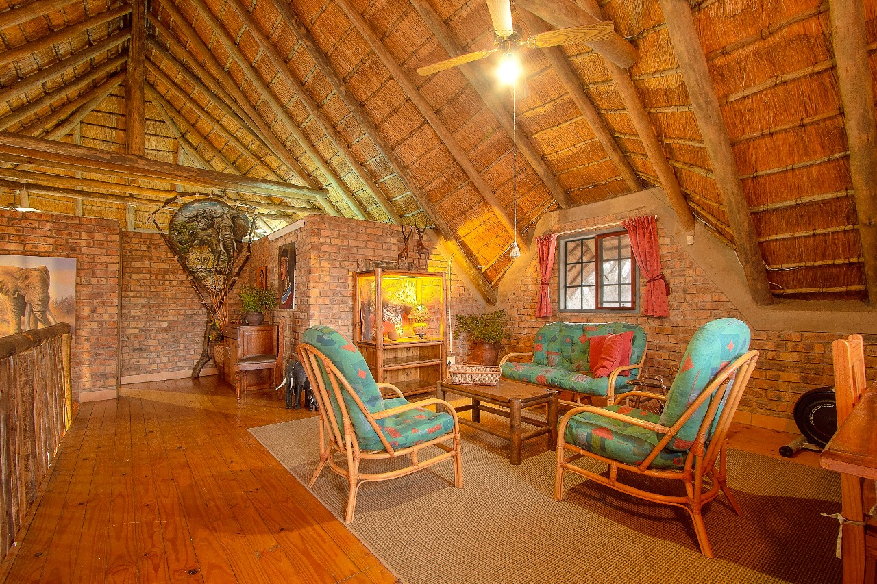 Rare find not to be missed. Suited for a big family or over seas investors. You will be delighted in the animal night sounds. Prime location near the river and wild life. House and a separate cottage, both thatch roofed. In the majestic double story main house you will find 4 bedrooms and 3 bathrooms. The main bedroom (on suite) has doors leading outside onto the veranda. Open plan double volume living areas. Spacious kitchen. Up stairs you will find another living area. Two of the four bedrooms are upstairs. the house is fitted with aircons.