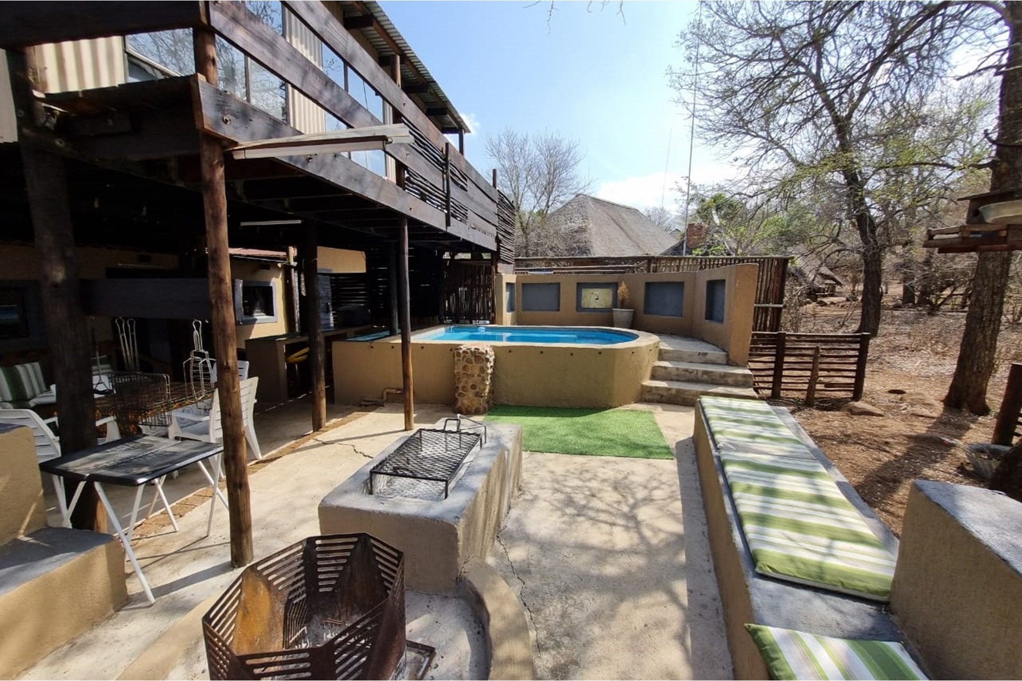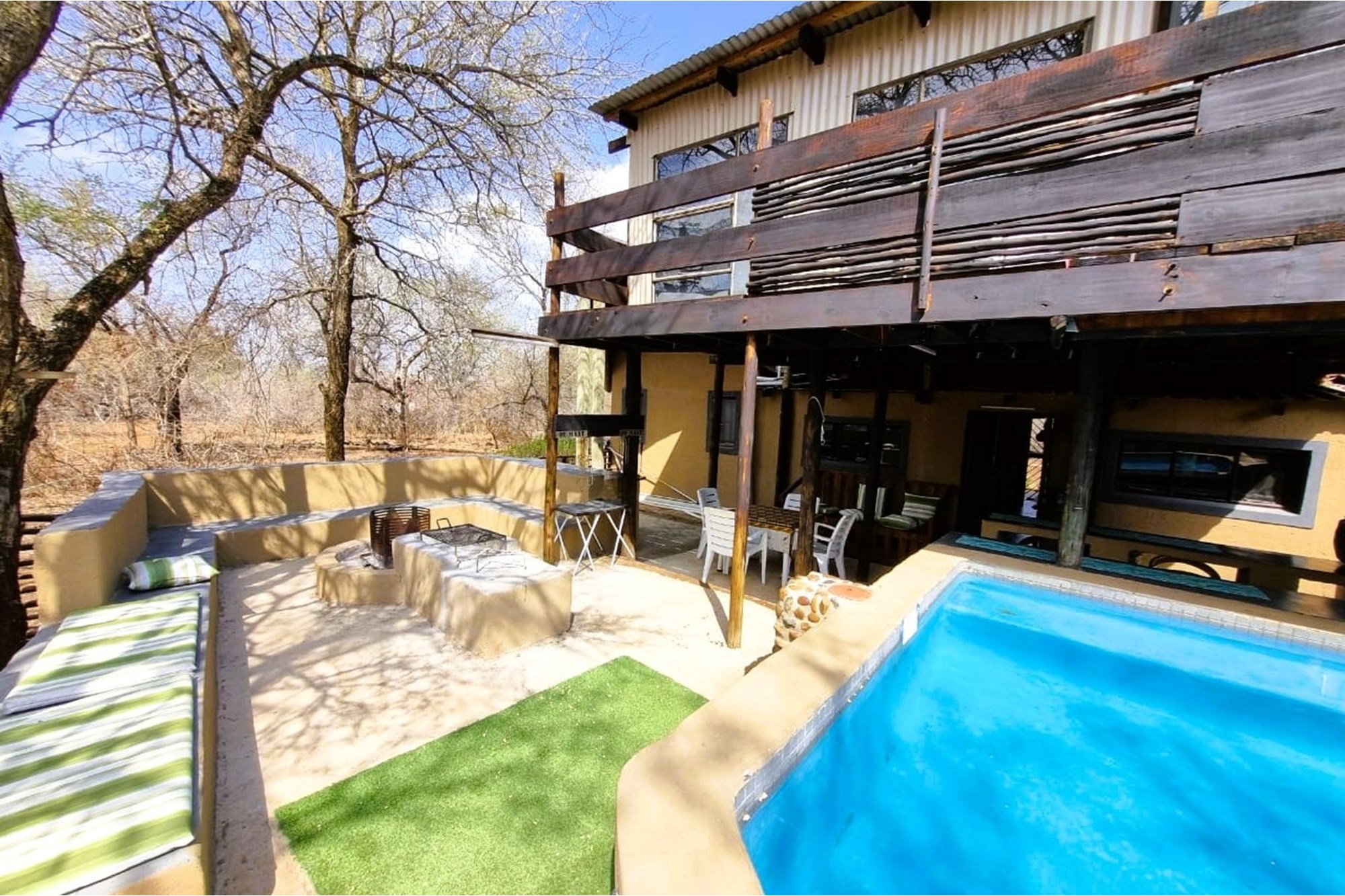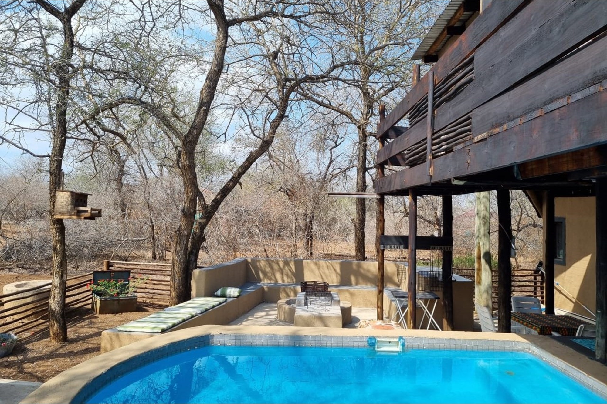 Sleeps up to 7 people comfortably with2 spacious bedrooms, 2 bathrooms, a separate toilet, plus an open area for additional beds.A modern open-plan kitchen with built-in cupboards, double sink and tiled flooring ensures effortless living. Stay connected and comfortable withair-conditioning and back-up power, keeping your WiFi and lights on even during outages. Step outside to the ultimate entertainment area — complete with a sparkling pool, braai facilities, built-in bar seating, dining space, and a shaded wooden deck where unforgettable memories are made, all set against the backdrop of breathtaking game views.