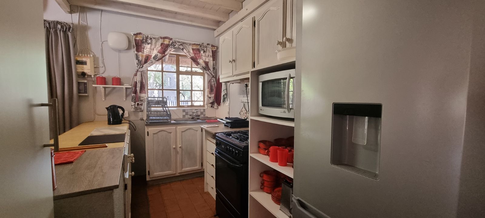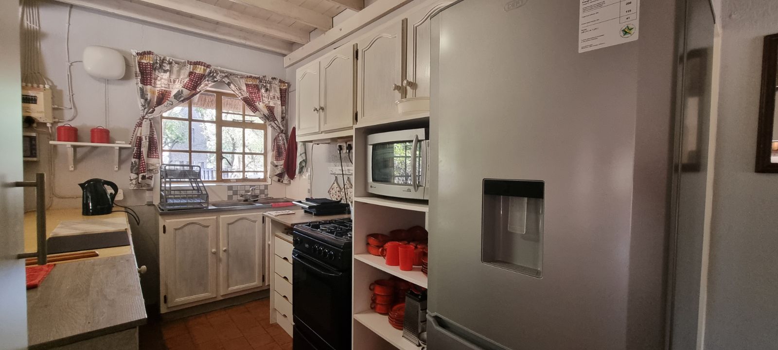 Inside, the spacious living room is filled with natural light thanks to its many cottage-style windows and two sliding doors. A small step leads to the dining area and compact yet functional kitchen, fitted with a gas stove for easy cooking.