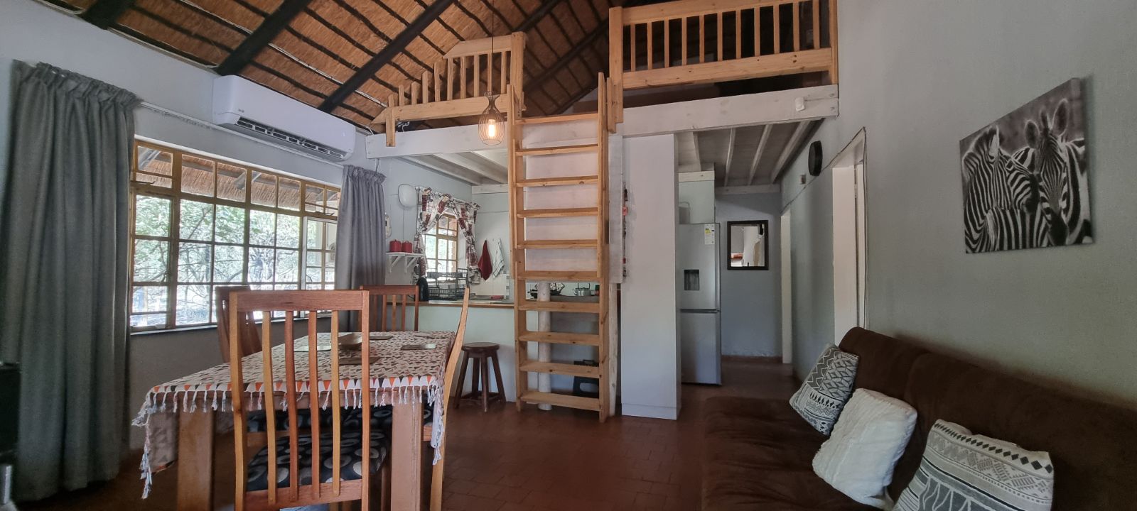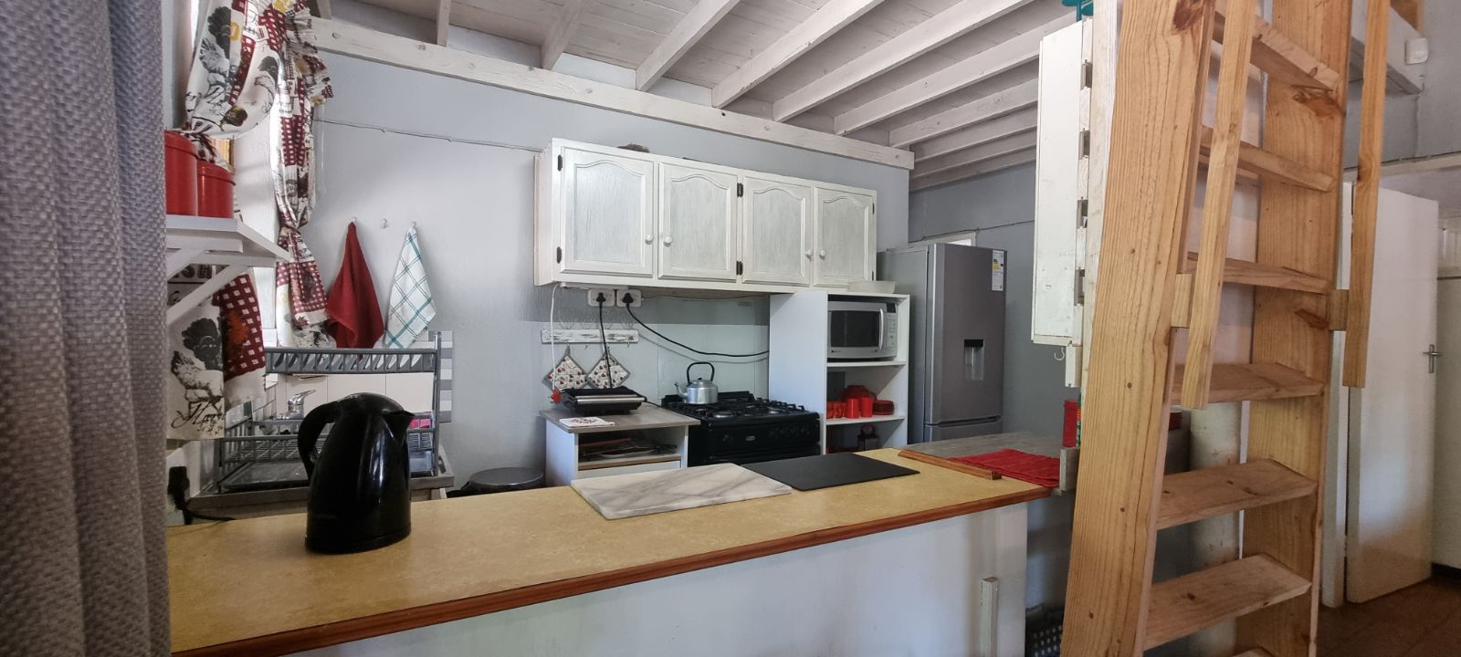 A quaint loft, accessed by a cat ladder, adds flexibility for storage or extra sleeping space. There’s also a separate storeroom for convenience.