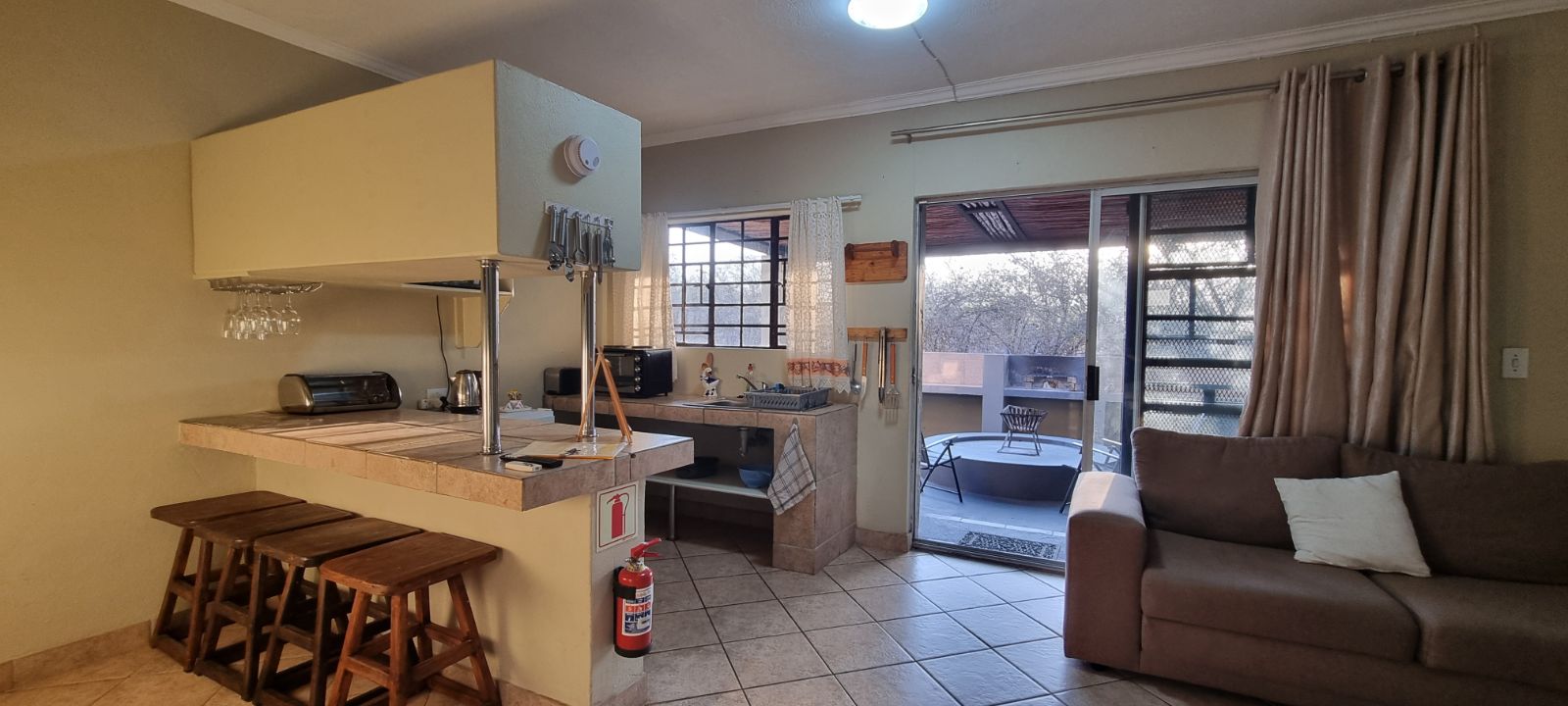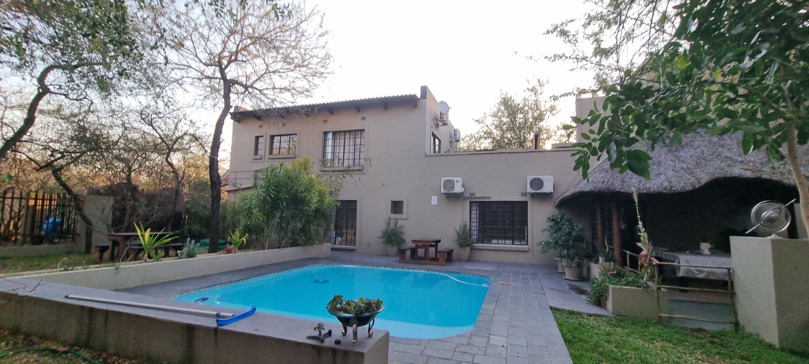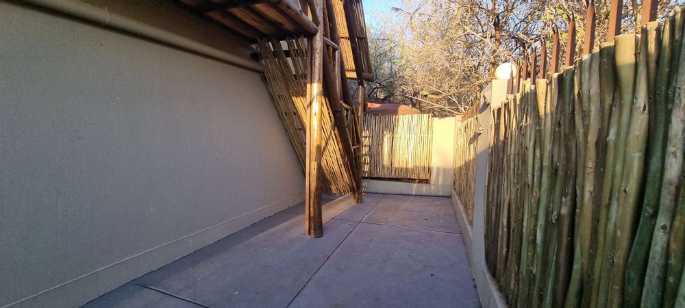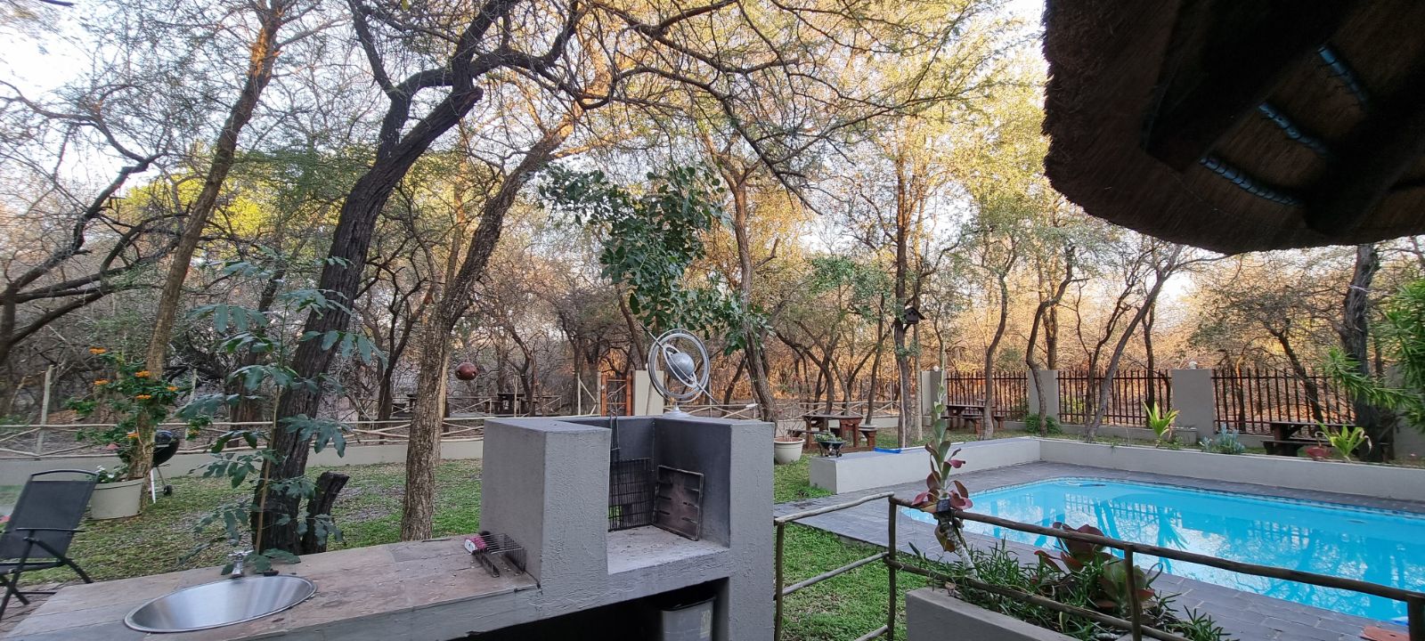 The grounds are inviting, with a sparkling pool and raised viewing deck that overlooks natural parkland where wildlife roams freely. Communal gardens and well-placed braai areas create welcoming social spaces for guests. Practical features such as undercover parking, two 4000-liter water tanks and strong security measures add further value and peace of mind.