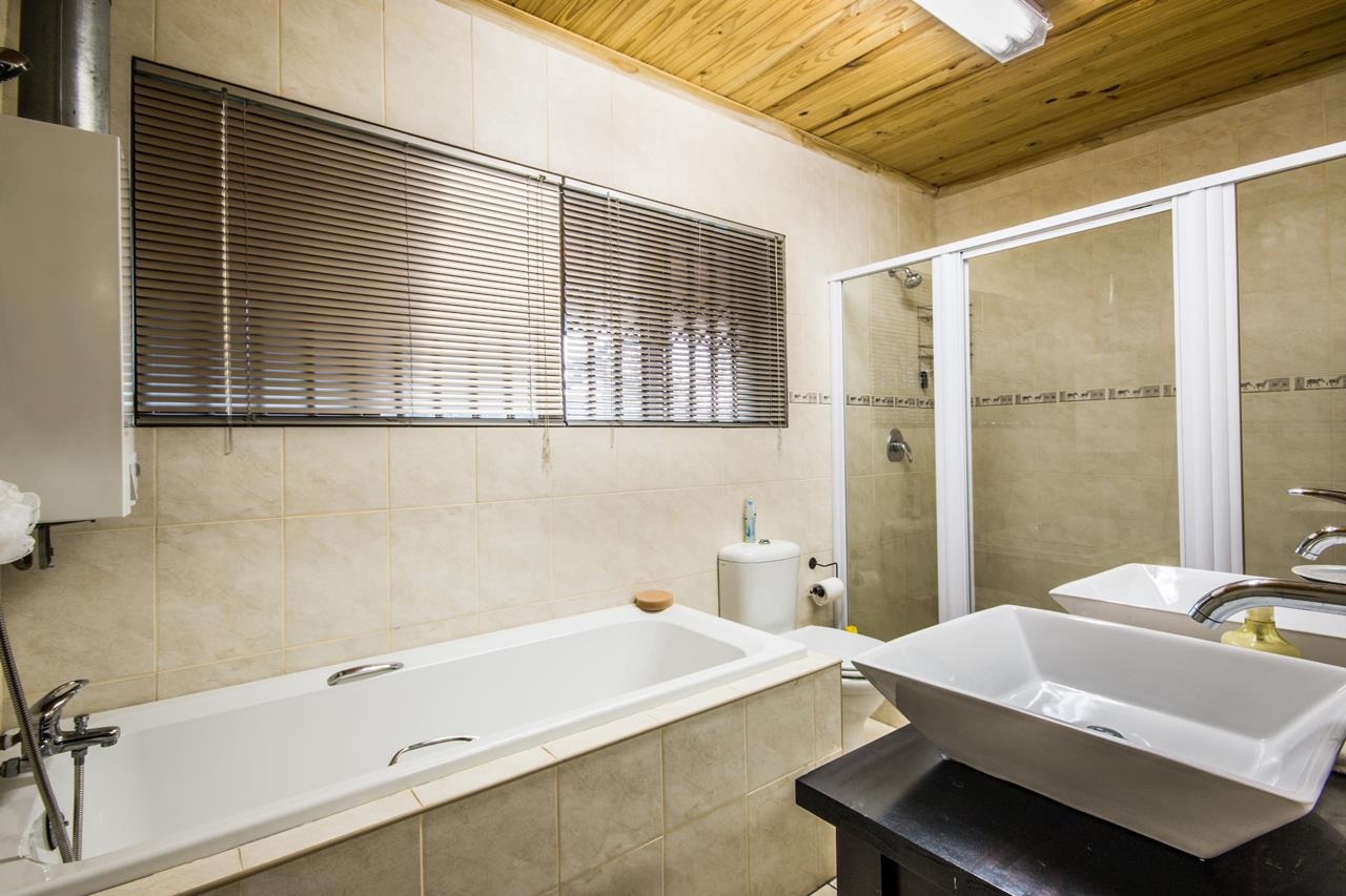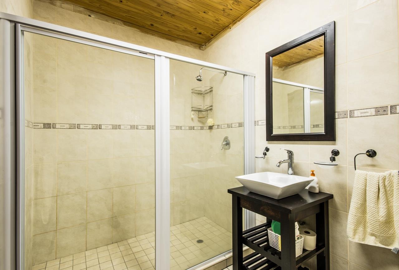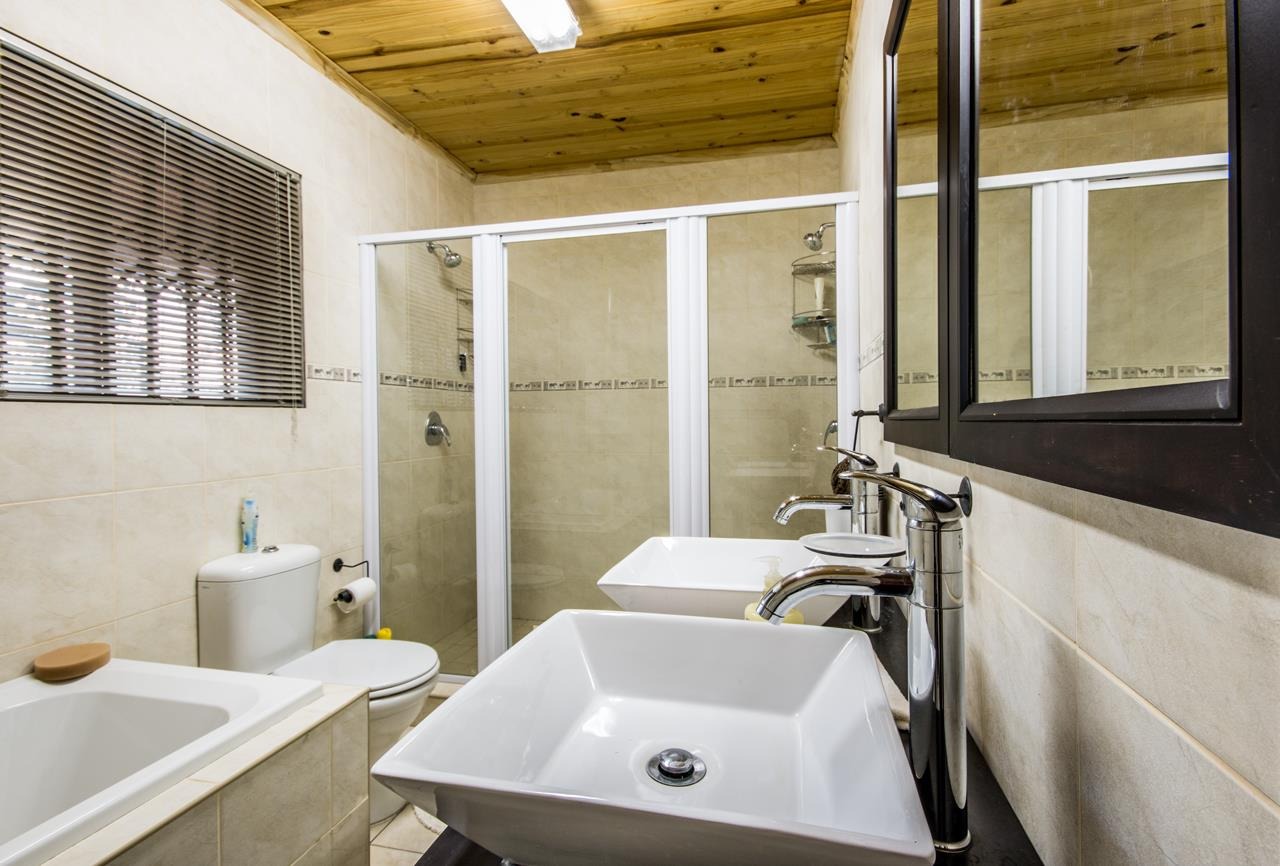 This property also includes two flatlets. The first, located at the back of the double garage, features a private veranda, a bedroom with built-in cupboards, an air-conditioner, a ceiling fan, and an en-suite bathroom with a shower, toilet, and basin. The second flatlet, situated above the garage, includes an open-plan area suitable for a kitchenette and lounge, a bedroom with built-in cupboards, an air-conditioner, a ceiling fan, and an en-suite bathroom with a bathtub, double shower, double basins, and a toilet.