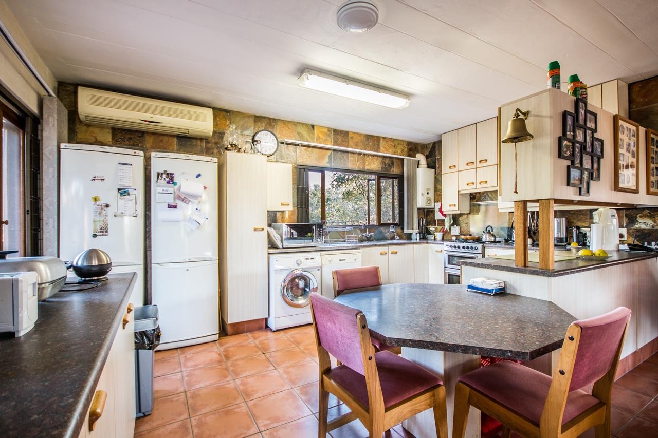 The wooden staircase leads to the second floor, where two spacious bedrooms await. The main bedroom features built-in cupboards, an air-conditioner, a ceiling fan, and an en-suite bathroom with double basins, a shower, a bathtub, and a toilet. The second bedroom includes built-in cupboards, an air-conditioner, a ceiling fan, and an en-suite bathroom with a shower, toilet, and basin. This room opens onto a viewing deck that offers stunning views of the surrounding bush.