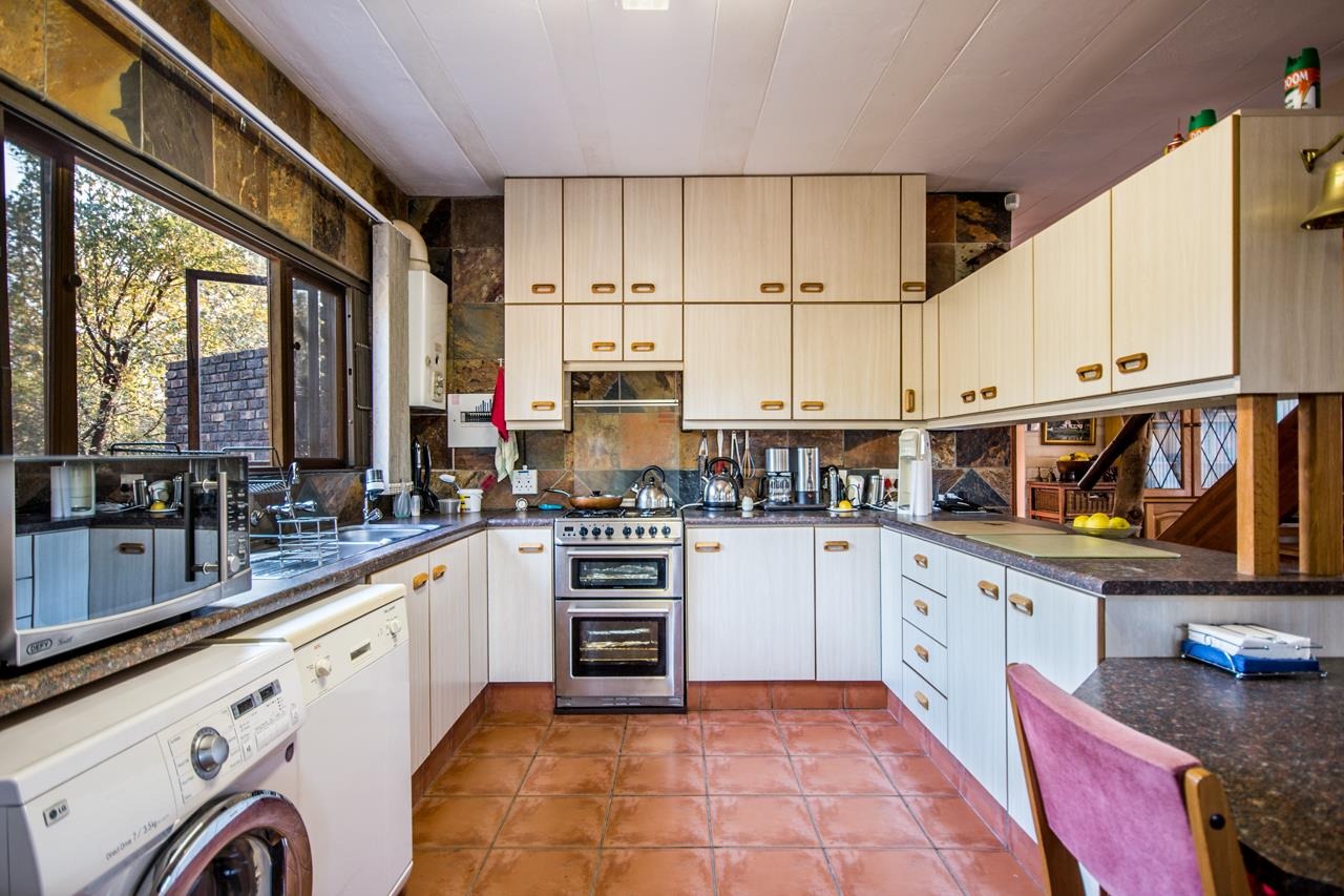 The ground floor welcomes you with a tiled veranda that leads into a spacious open-plan kitchen and lounge area via sliding doors. The kitchen is fitted with melamine countertops, built-in cabinets, a water purification system, a gas geyser, and a gas stove with an electric oven. The open-plan living area includes an air-conditioner and two ceiling fans, ensuring year-round comfort. The lounge also features additional plug points for a generator.