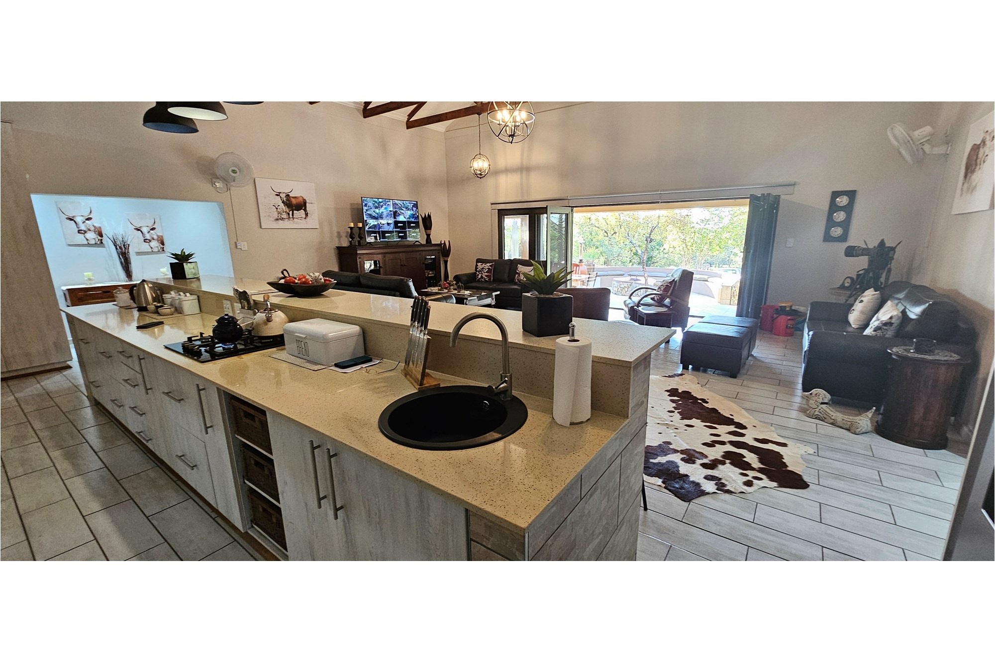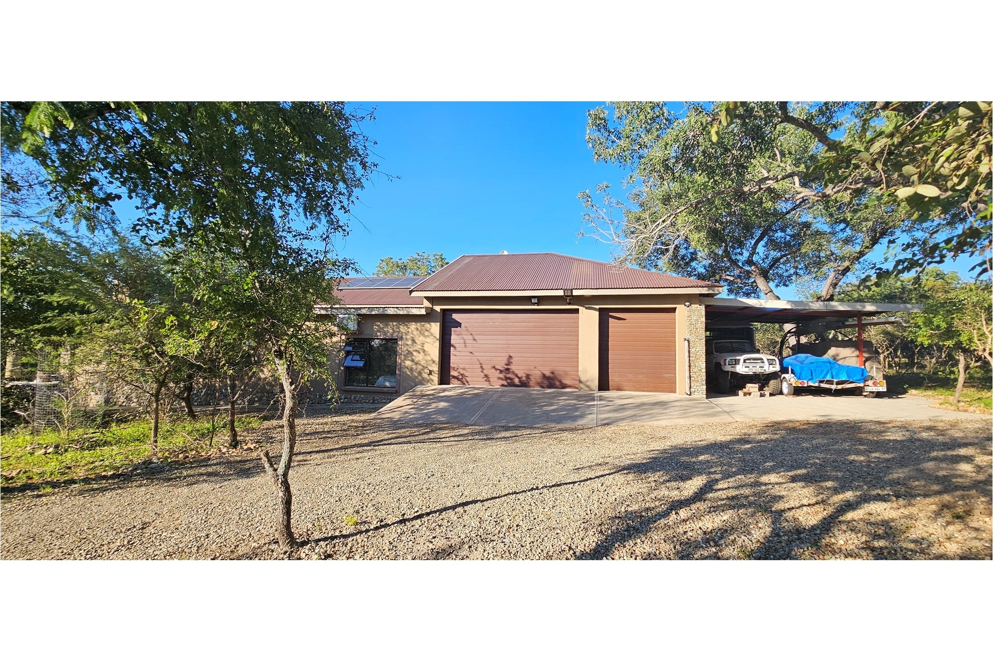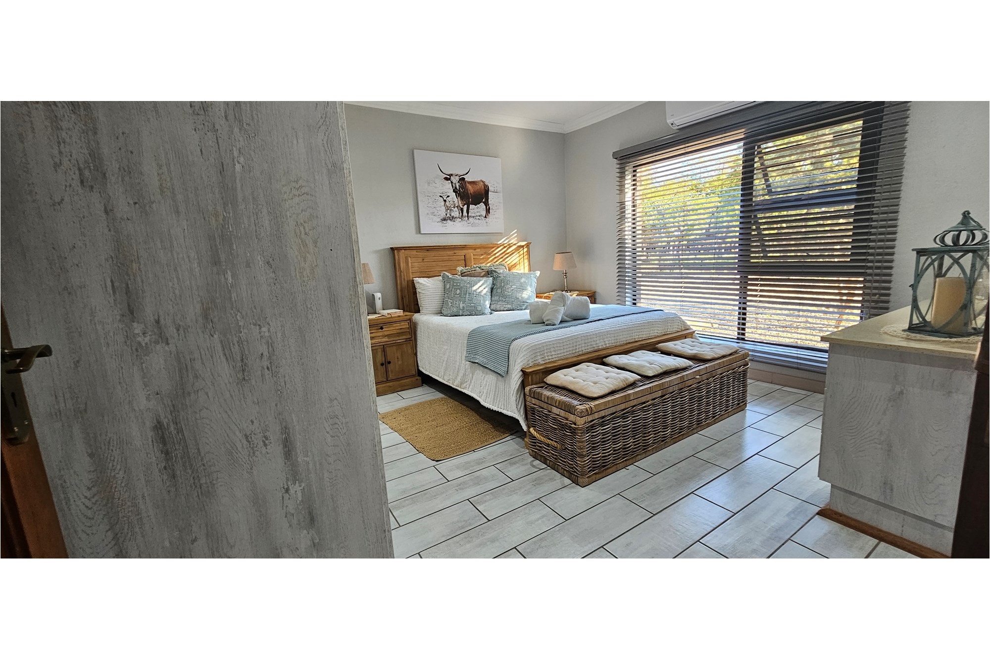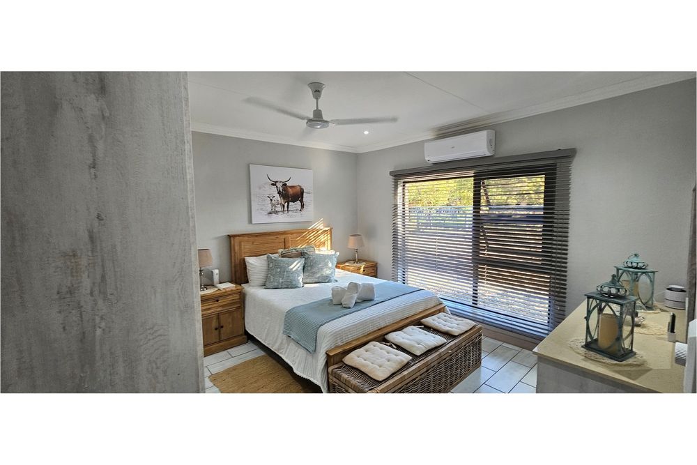 This gorgeous 3-bedroom, 3-bathroom home is new to the market and offers an exceptional blend of modern amenities and tranquil countryside living. Perfect for families and those who appreciate a peaceful, safe location, the property is thoughtfully designed with comfort and style in mind. As you step inside, you'll be greeted by an expansive open floor plan that seamlessly connects the living areas. The luxurious bedrooms all feature built-in closets, and an en-suite bathroom for added privacy and convenience. The home features air conditioning to keep you comfortable year-round. Outdoor enthusiasts will revel in the property's stunning outdoor spaces, which include a sparkling swimming pool, an inviting veranda, and covered parking. The property is supported by an efficient irrigation system and includes a water tank and booster for reliability. Additionally, the property comes with a spacious 2-car garage and for additional privacy, the adjacent stand is also for sale. Constructed with durable concrete and stone, this home not only promises longevity but also enhances the overall aesthetic appeal. Situated on a quiet road, this beautifully crafted home offers the perfect retreat for those seeking a serene lifestyle without compromising on modern conveniences. Discover unrivaled tranquility and style in this delightful Marloth Park residence. Don't miss your chance to call this remarkable property your new home!