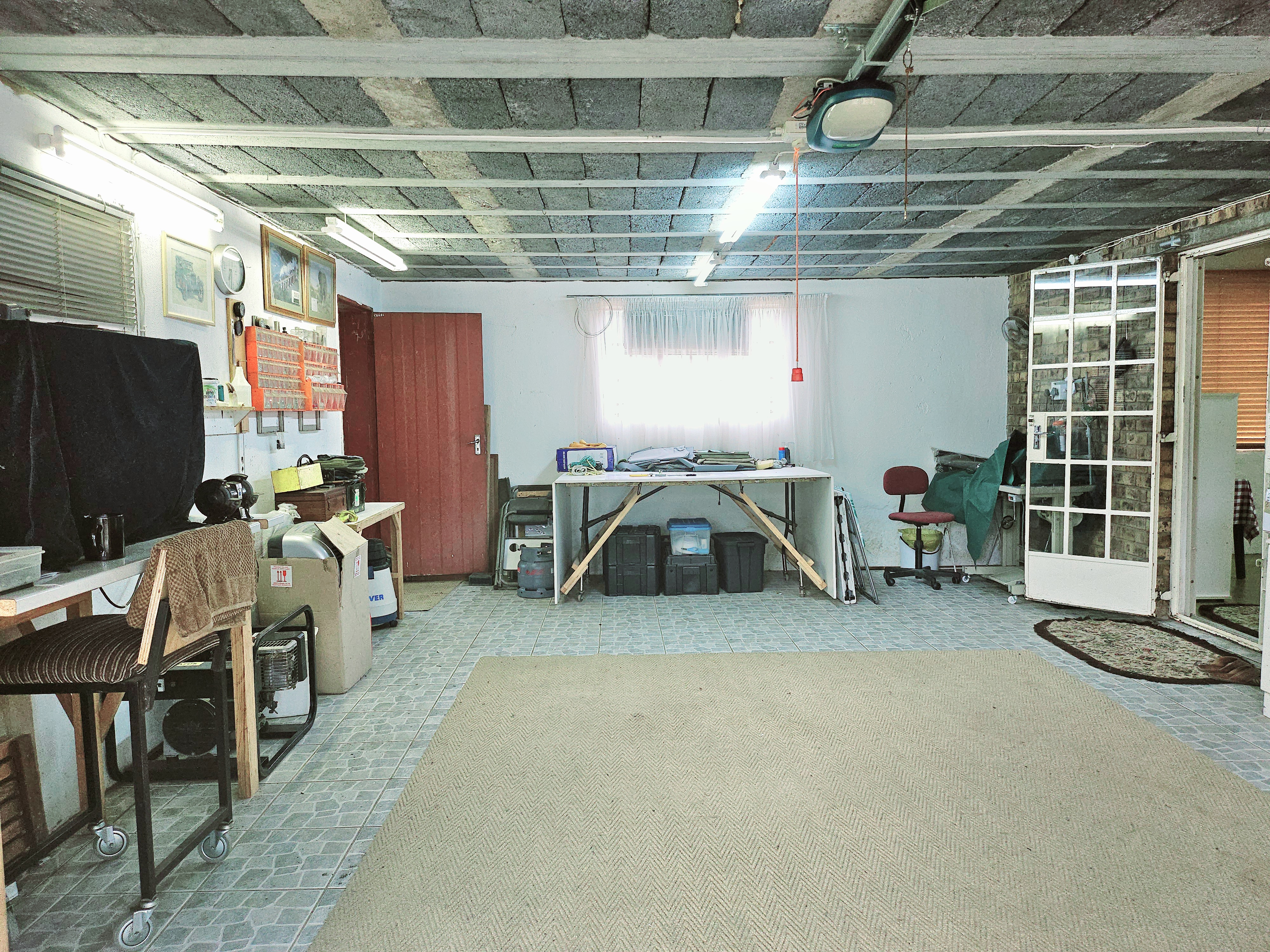 We start by walking into the double garage where it is tiled, ready to close off and make another family room, leaving the 3rd garage for your vehicle which has the pool pump. storage area as well as the workshop.
