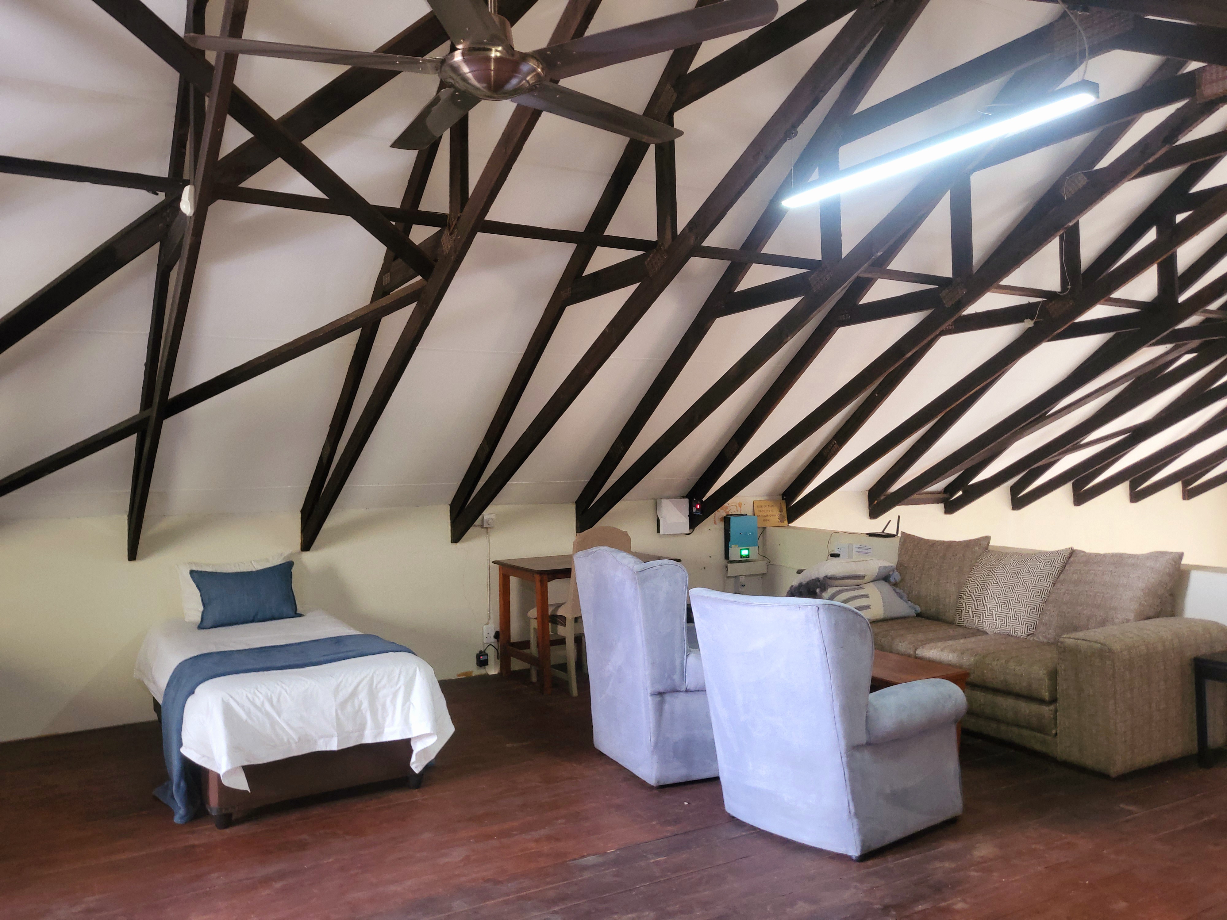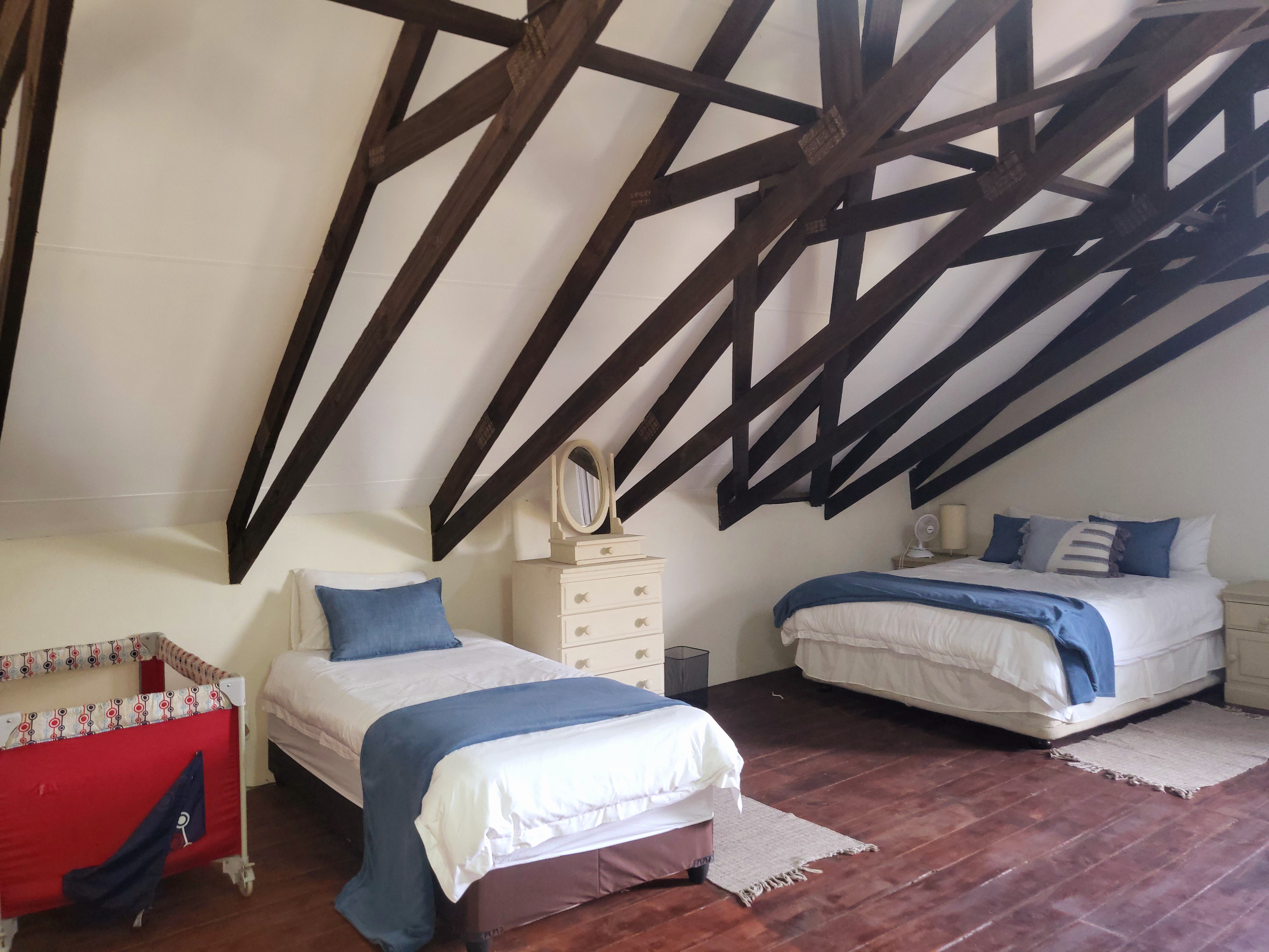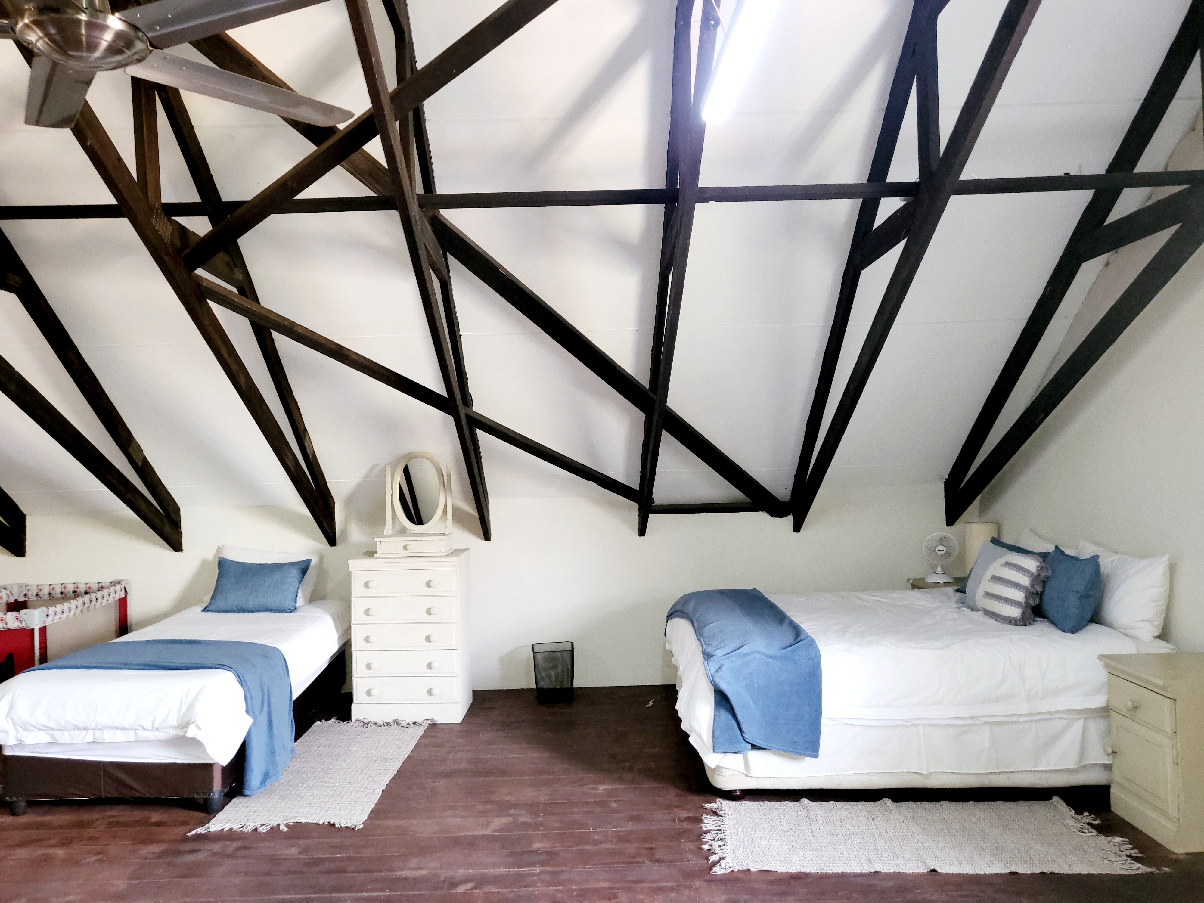 The loft itself is a true highlight, showcasing a striking white ceiling and dark wood trusses. It opens onto a deck, providing the perfect spot to unwind in the evenings or to enjoy the sunrise with your morning coffee.