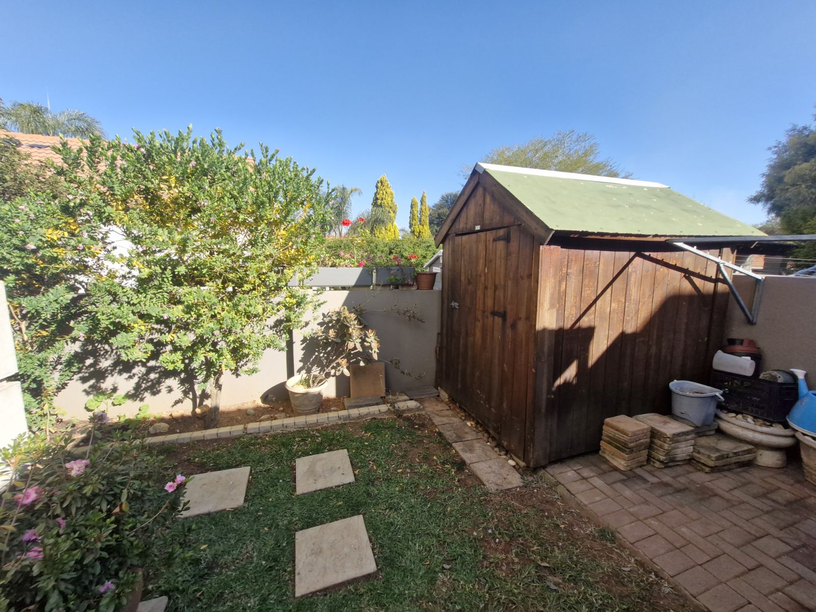 Lovely patio, wendy house with water feature.