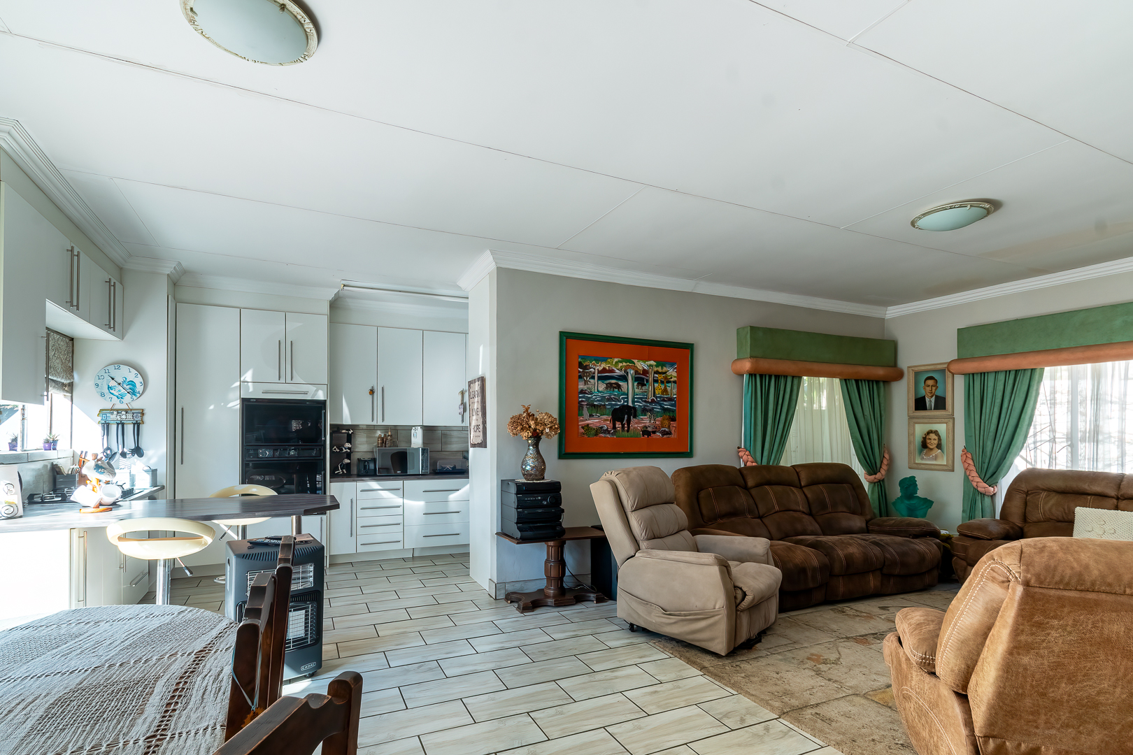 Main House features a open-plan lounge, dining and kitchen with gas stove.