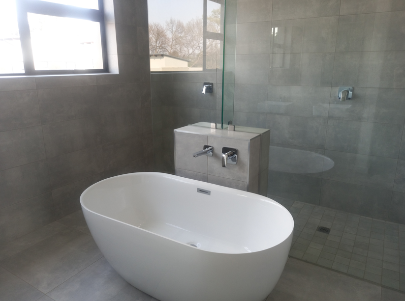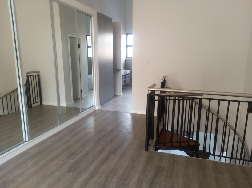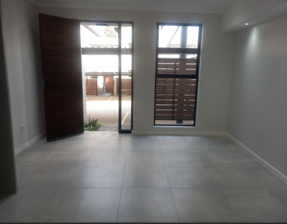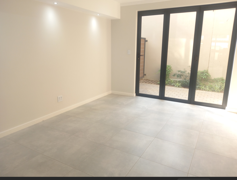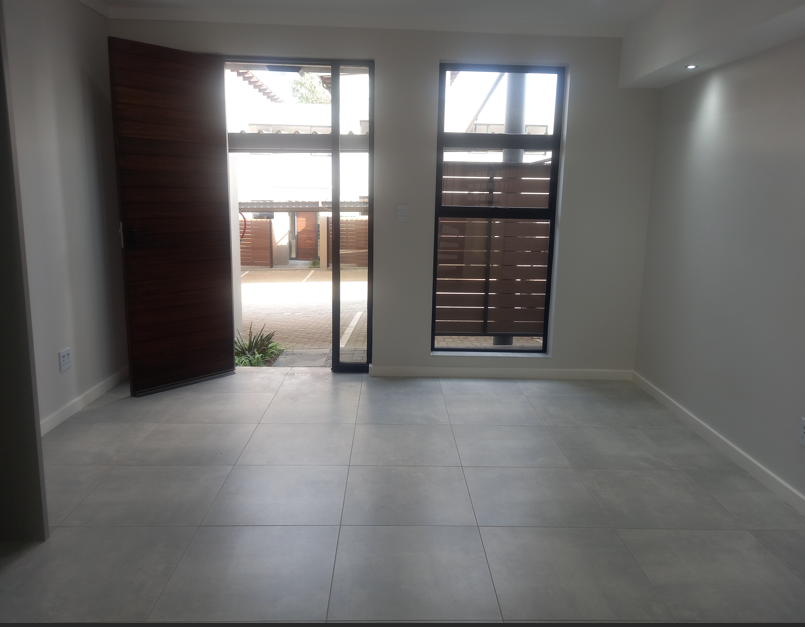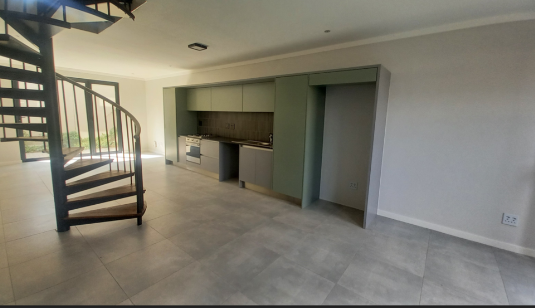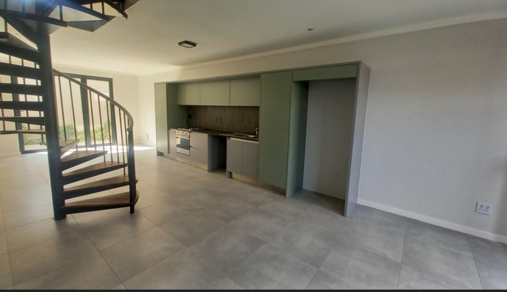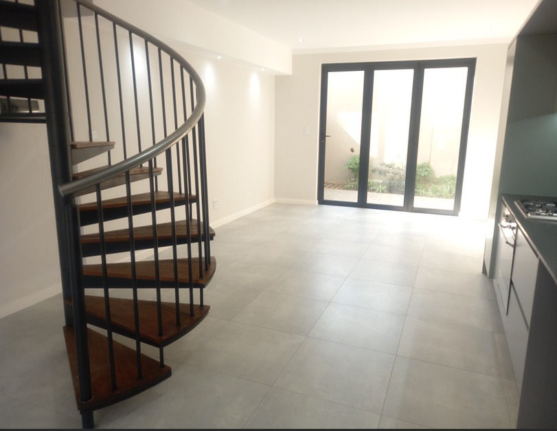 Only one bedroom duplex left for the busy executive.or a young couple. Modern contemporary finishes and fixtures throughout.. Open plan living room, dining room and kitchen. spiral wooden and steel staircase .Bedroom with high volume ceiling and vinyl flooring with en suite bathroom and built in cupboards with sliding doors. Built in braai and small pets allowed . Double Carports and space for visitors.