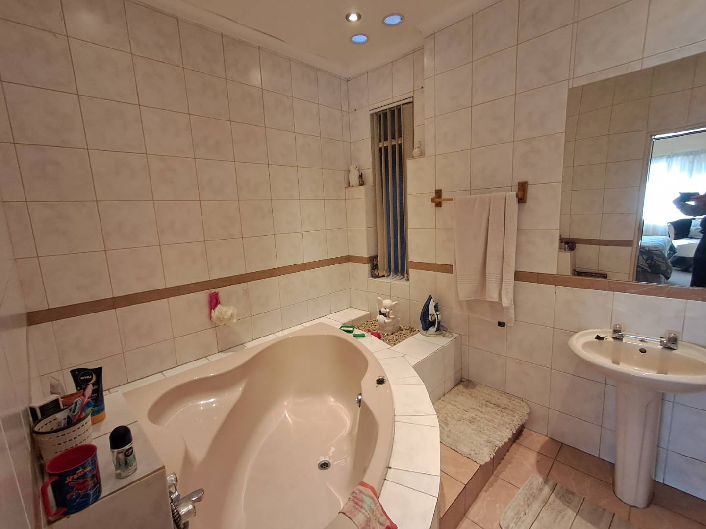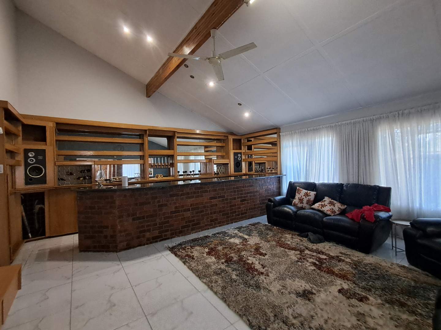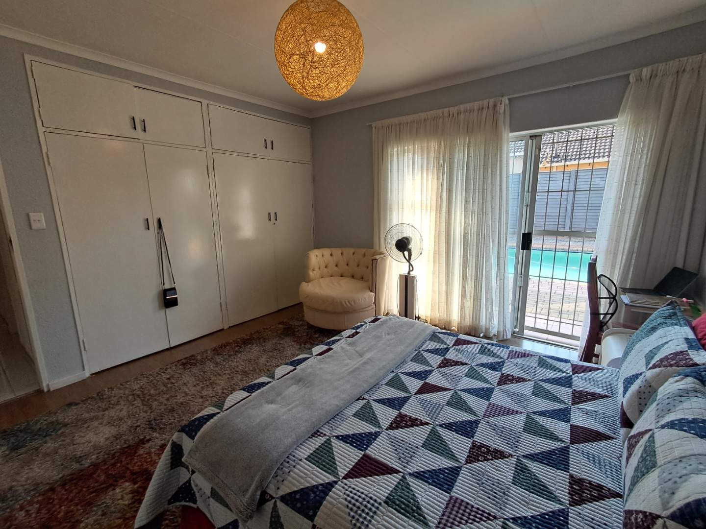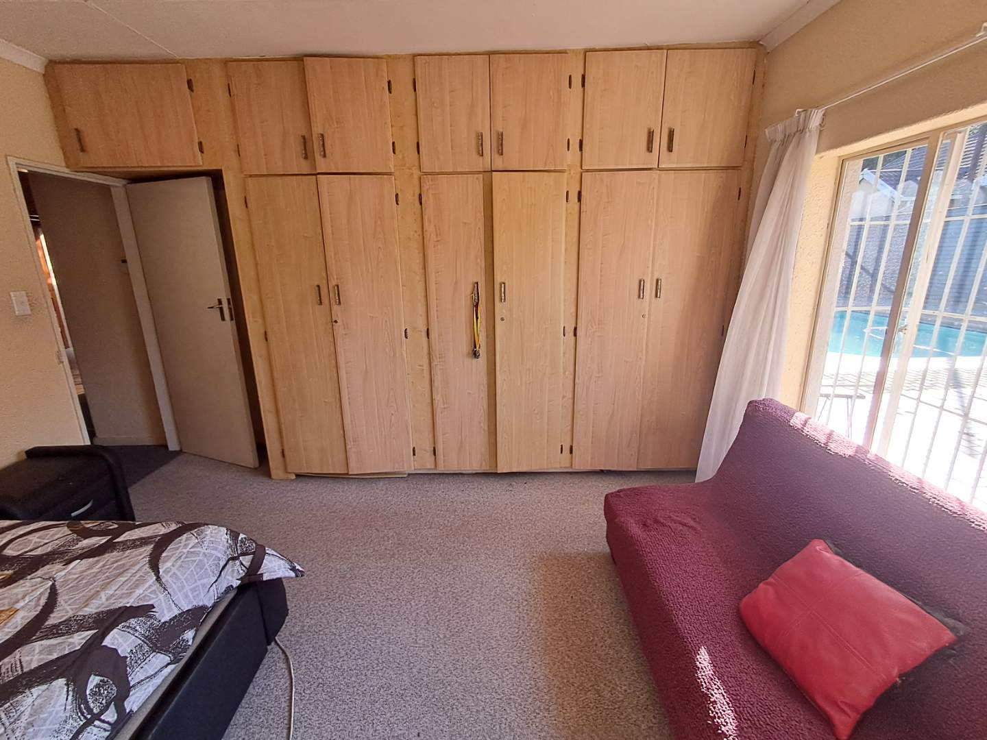 The pool area can be accessed from the entertainment area, master bedroom, or the attached cottage. This 2-bedroom cottage features a full bathroom, open-plan kitchen, lounge, and dining room. While the cottage is carpeted in the living areas, the kitchen and bathroom are tiled for practicality. Additionally, it includes a prepaid meter for convenience.