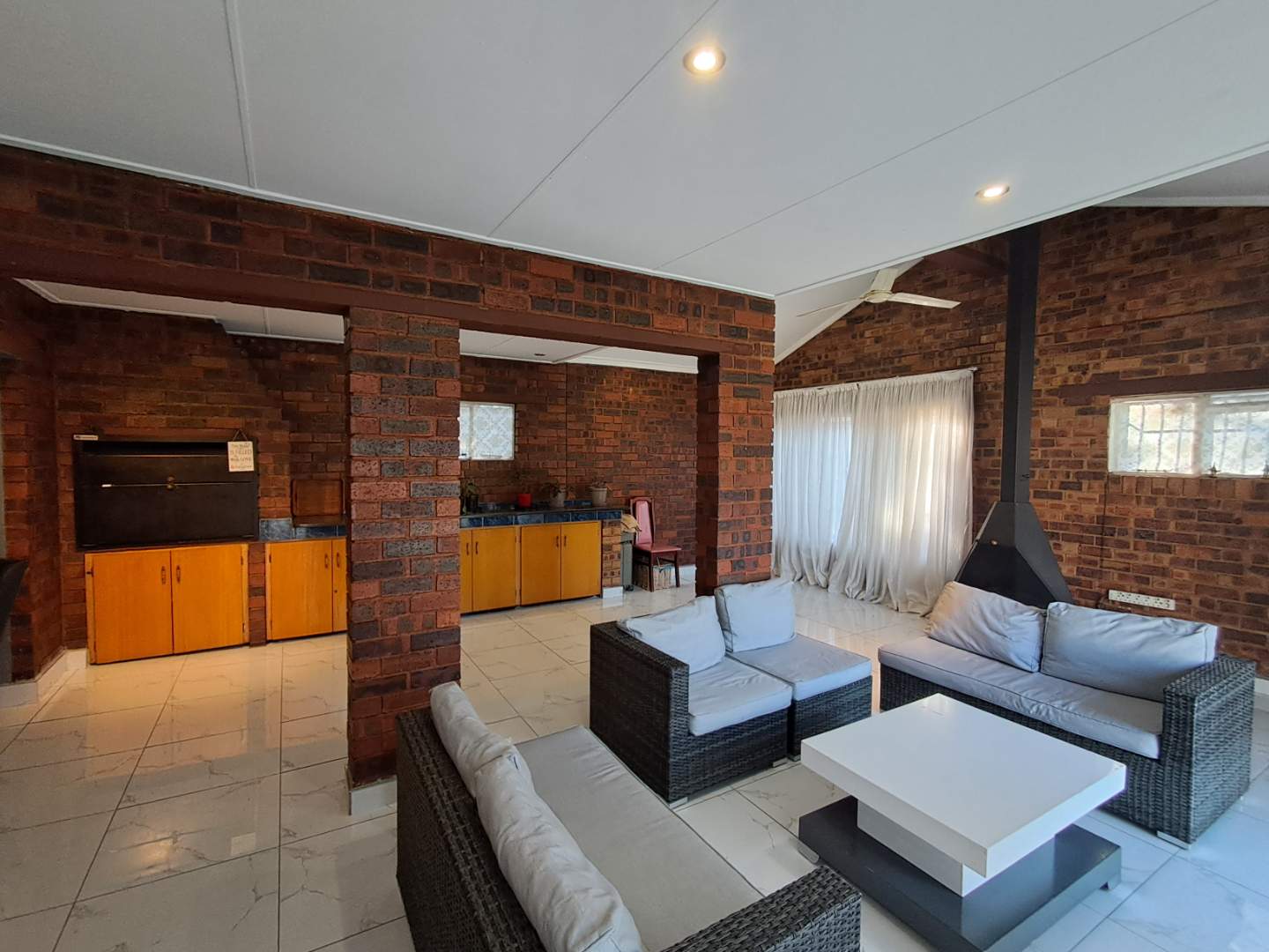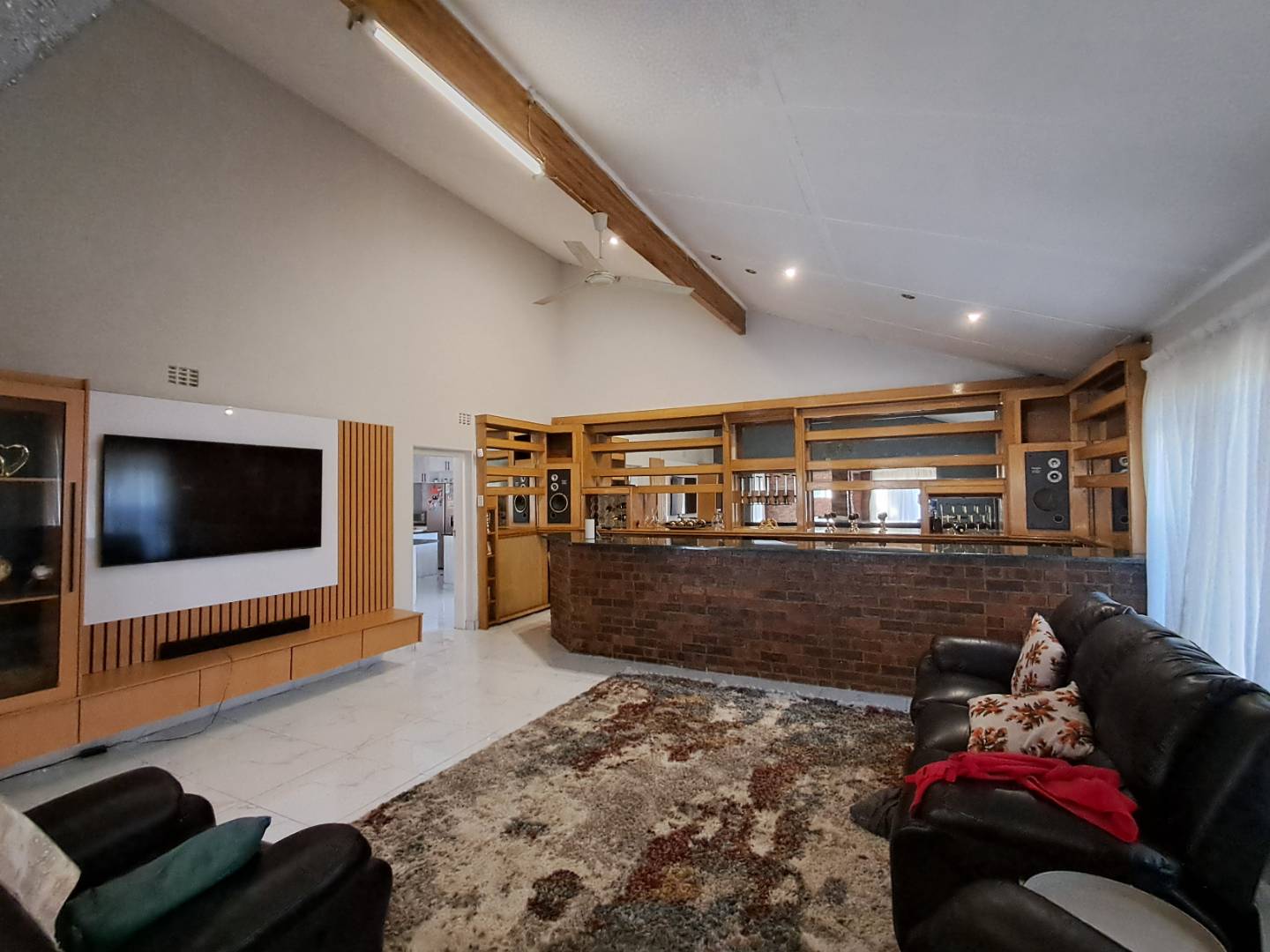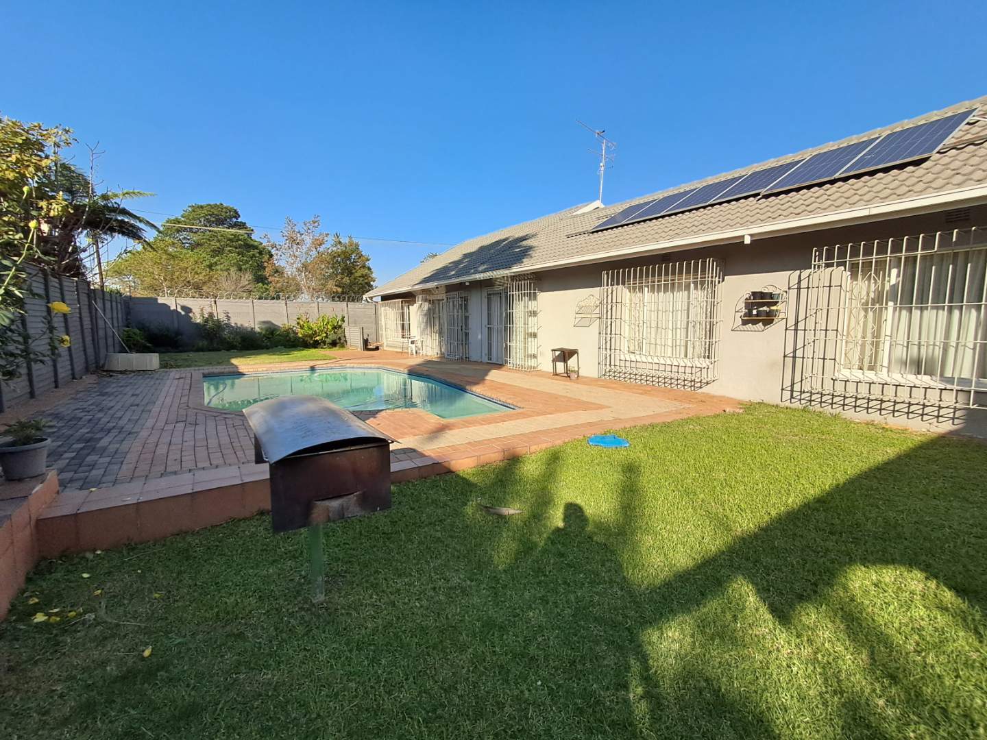 The entertainment area is designed for fun and relaxation, fully tiled with a built-in bar, built-in braai, and a cozy fireplace. Enjoy the convenience of a gas-powered geyser for cost-effective hot water supply. The property's main entrance and garage door are automated, ensuring security and ease of access.