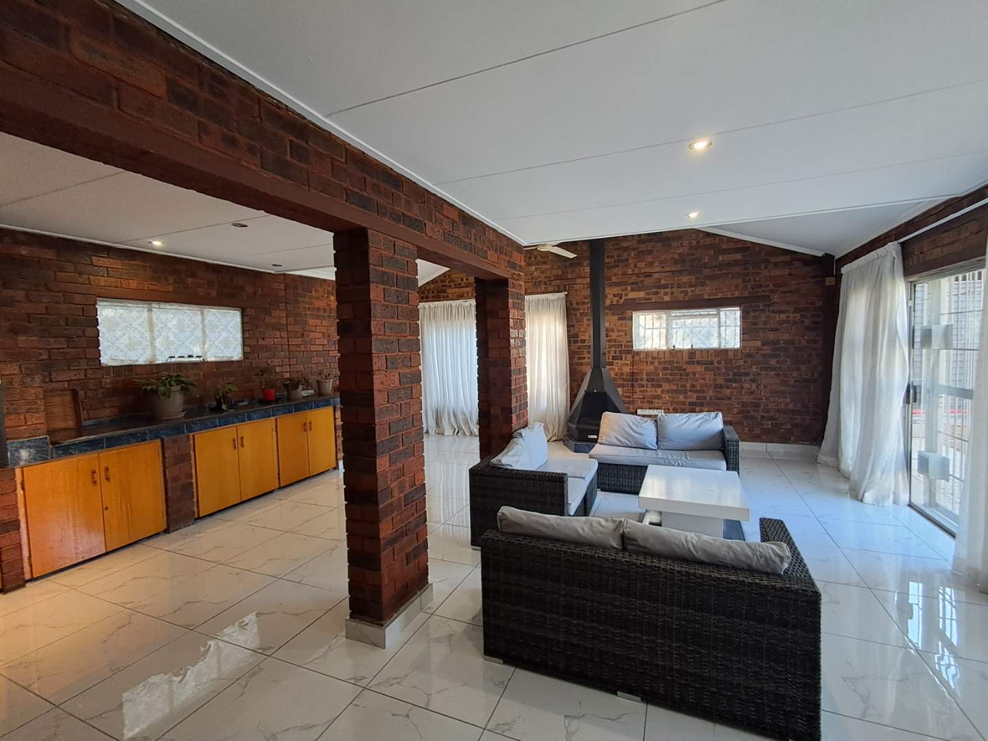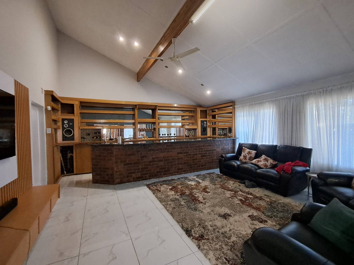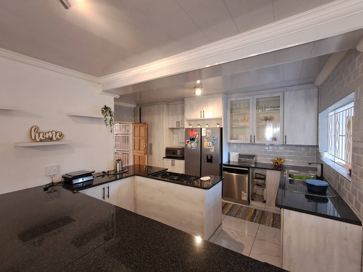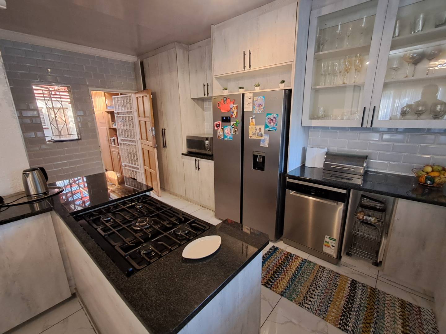 The entertainment area is designed for fun and relaxation, fully tiled with a built-in bar, built-in braai, and a cozy fireplace. Enjoy the convenience of a gas-powered geyser for cost-effective hot water supply. The property's main entrance and garage door are automated, ensuring security and ease of access.