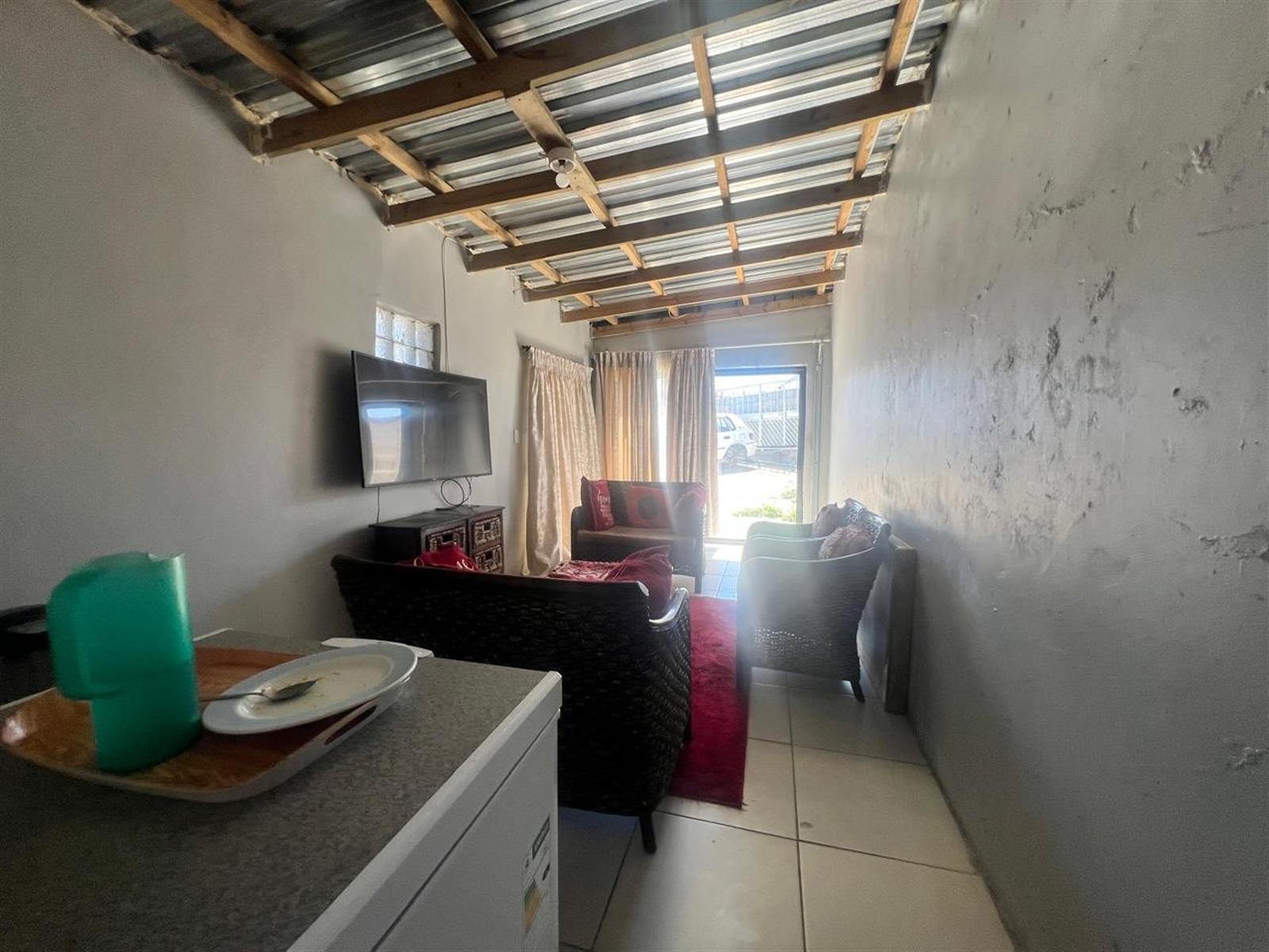 The kitchen is equipped with a fitted stove, under-counter oven, and an extractor fan. Adjacent to the kitchen is a courtyard, providing a private outdoor area for relaxation or outside braaing opportunities.