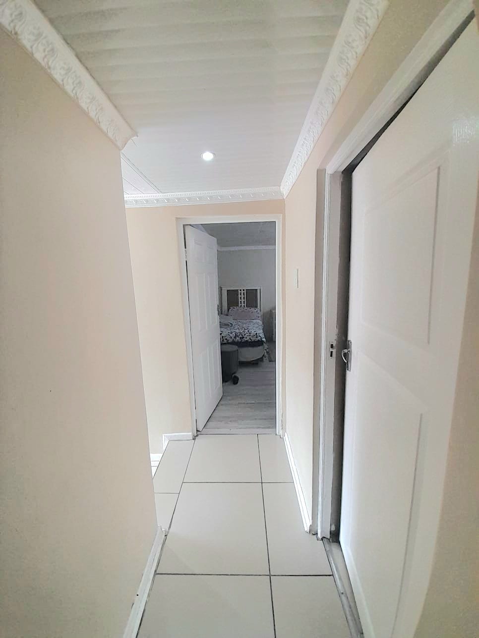 As you enter, you’re greeted by a tidy kitchen featuring a modern ceiling, a clean slate ready for you to add your personal touch and install the kitchen of your dreams. Moving forward along the passage, you’ll find a full bathroom equipped with a bathtub, followed by the first bedroom.