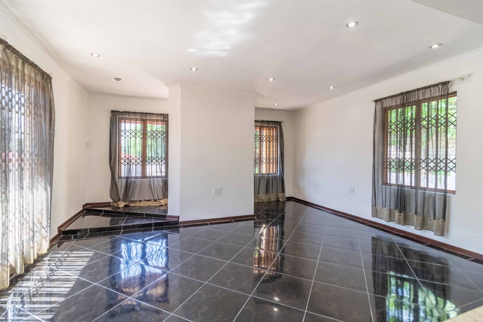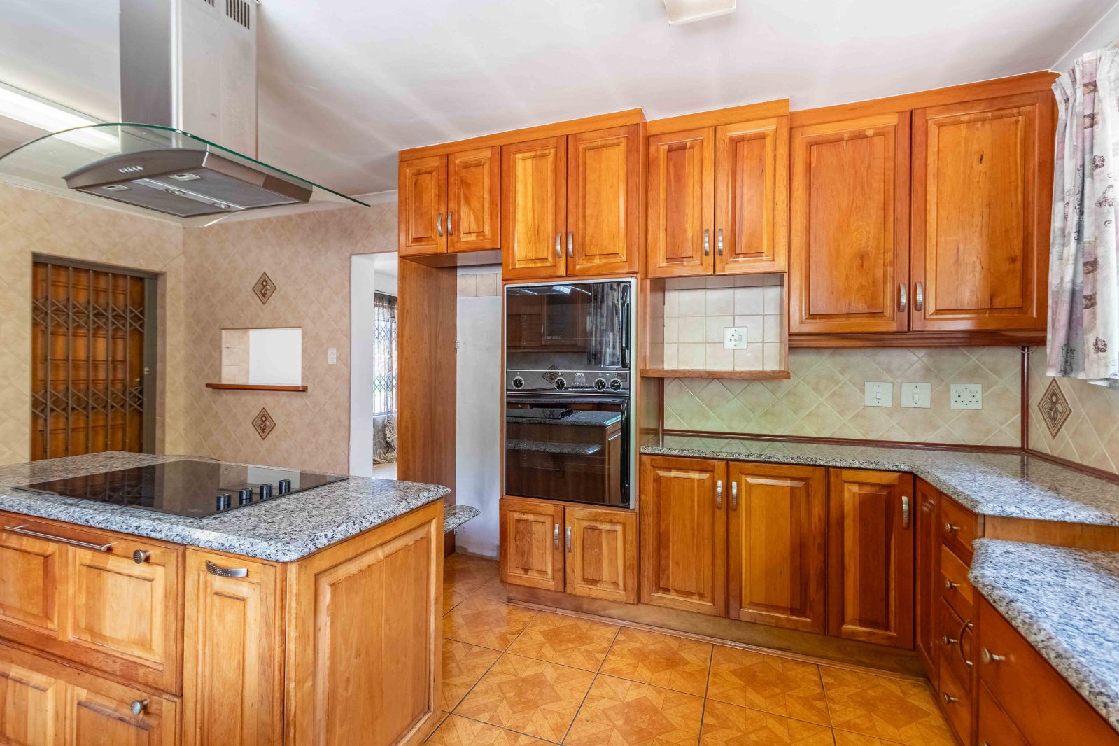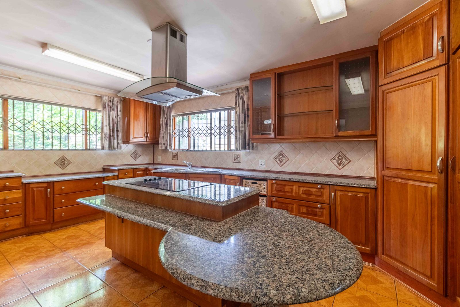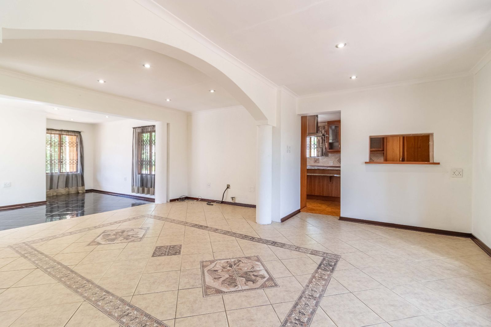 Step inside to discover a vast, open-plan living and dining area, elegantly tiled and designed for seamless entertaining. The heart of the home is a stunning, modern kitchen, featuring sleek granite countertops, high-end finishes, and a dedicated scullery for convenience.