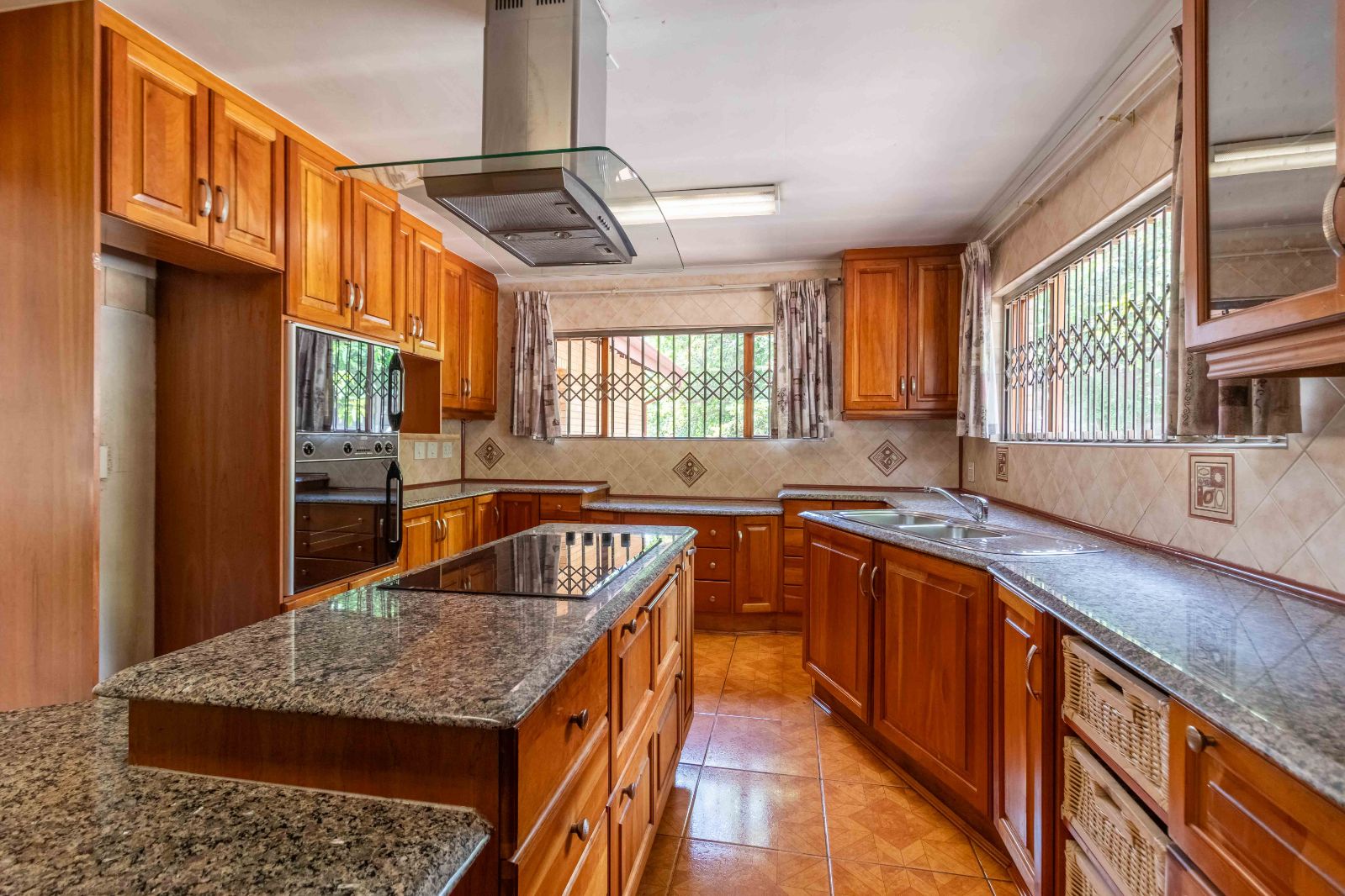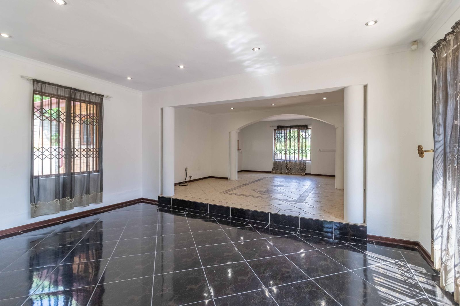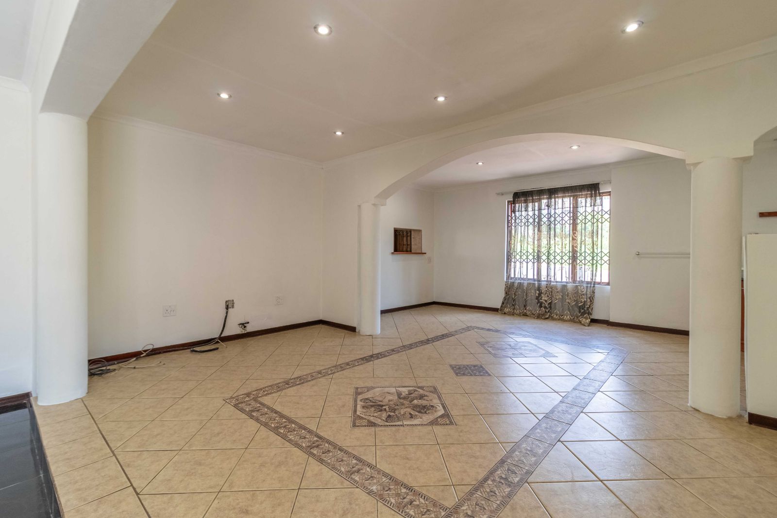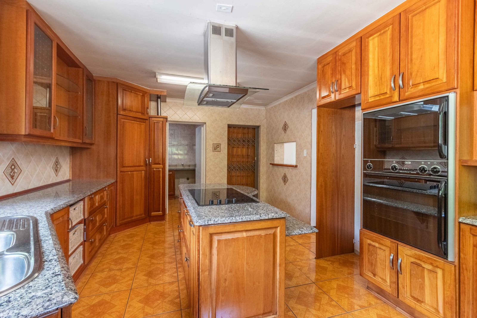 Step inside to discover a vast, open-plan living and dining area, elegantly tiled and designed for seamless entertaining. The heart of the home is a stunning, modern kitchen, featuring sleek granite countertops, high-end finishes, and a dedicated scullery for convenience.