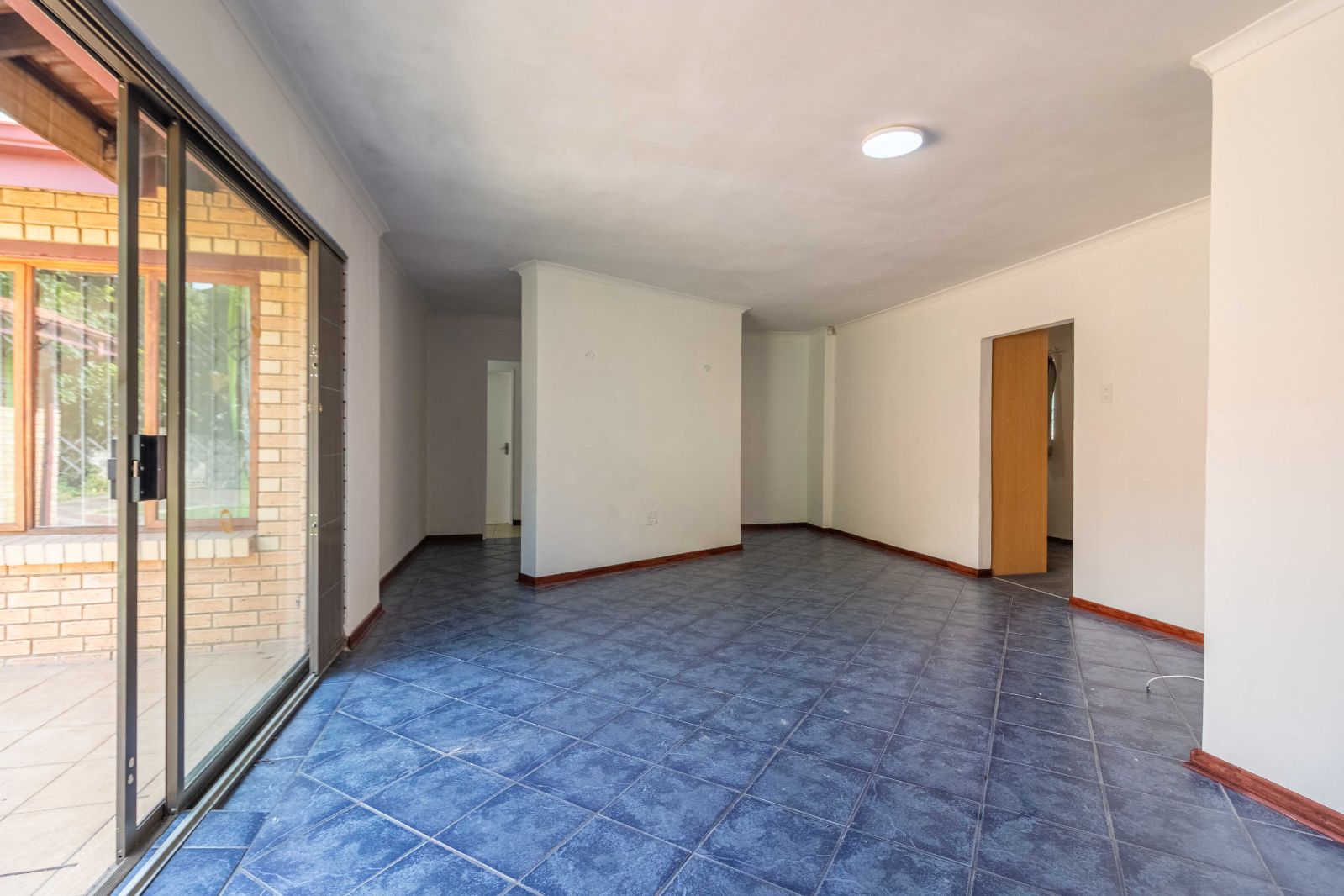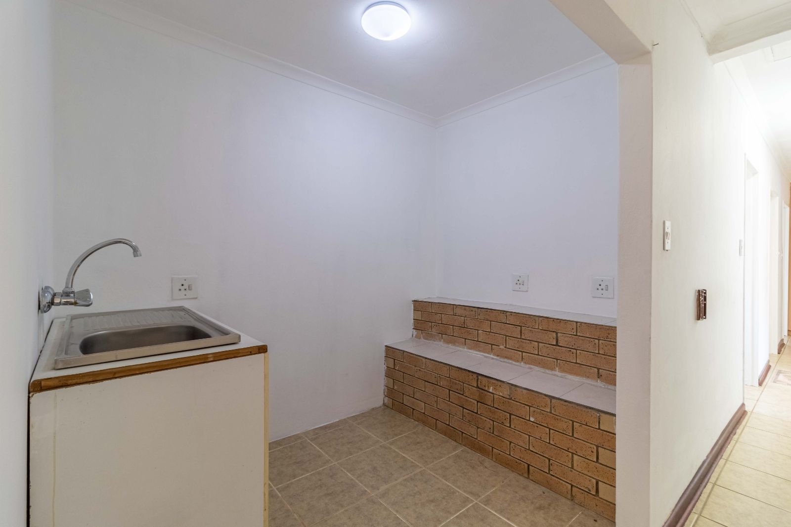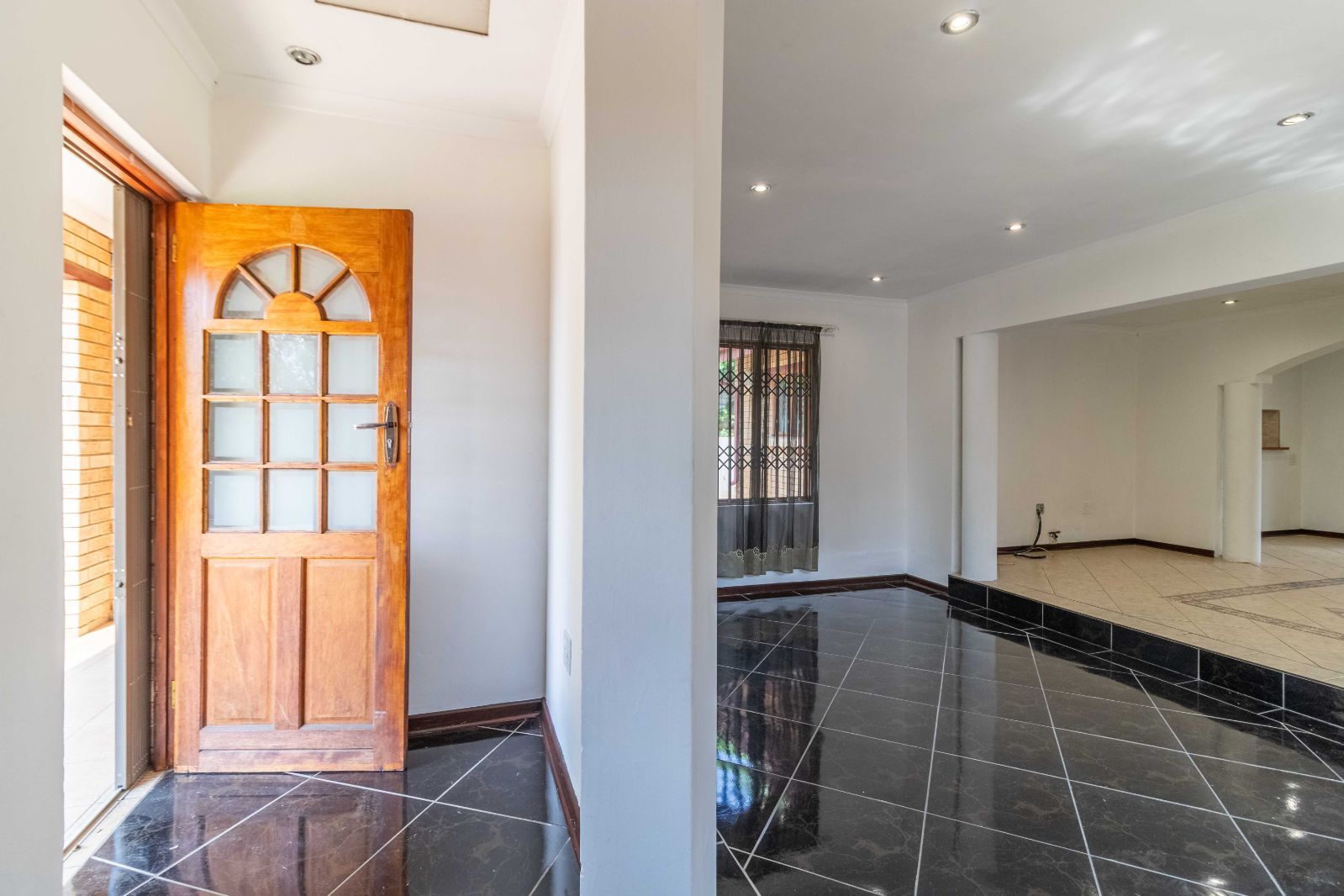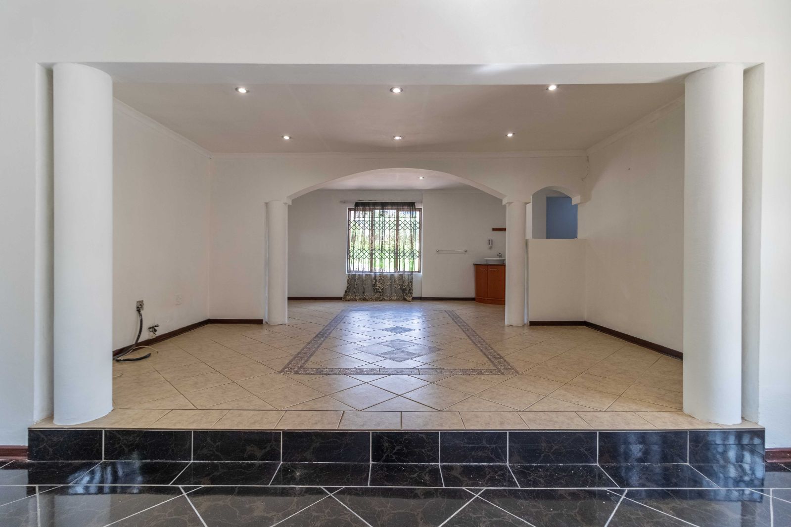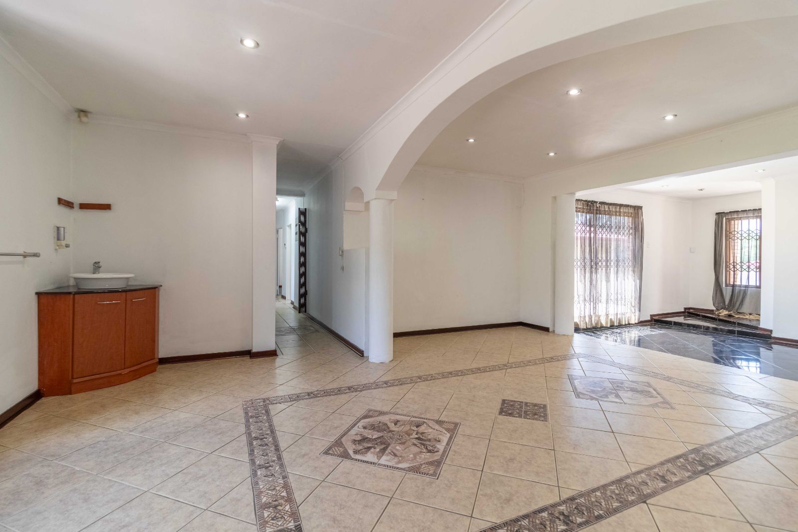 Step inside to discover a vast, open-plan living and dining area, elegantly tiled and designed for seamless entertaining. The heart of the home is a stunning, modern kitchen, featuring sleek granite countertops, high-end finishes, and a dedicated scullery for convenience.