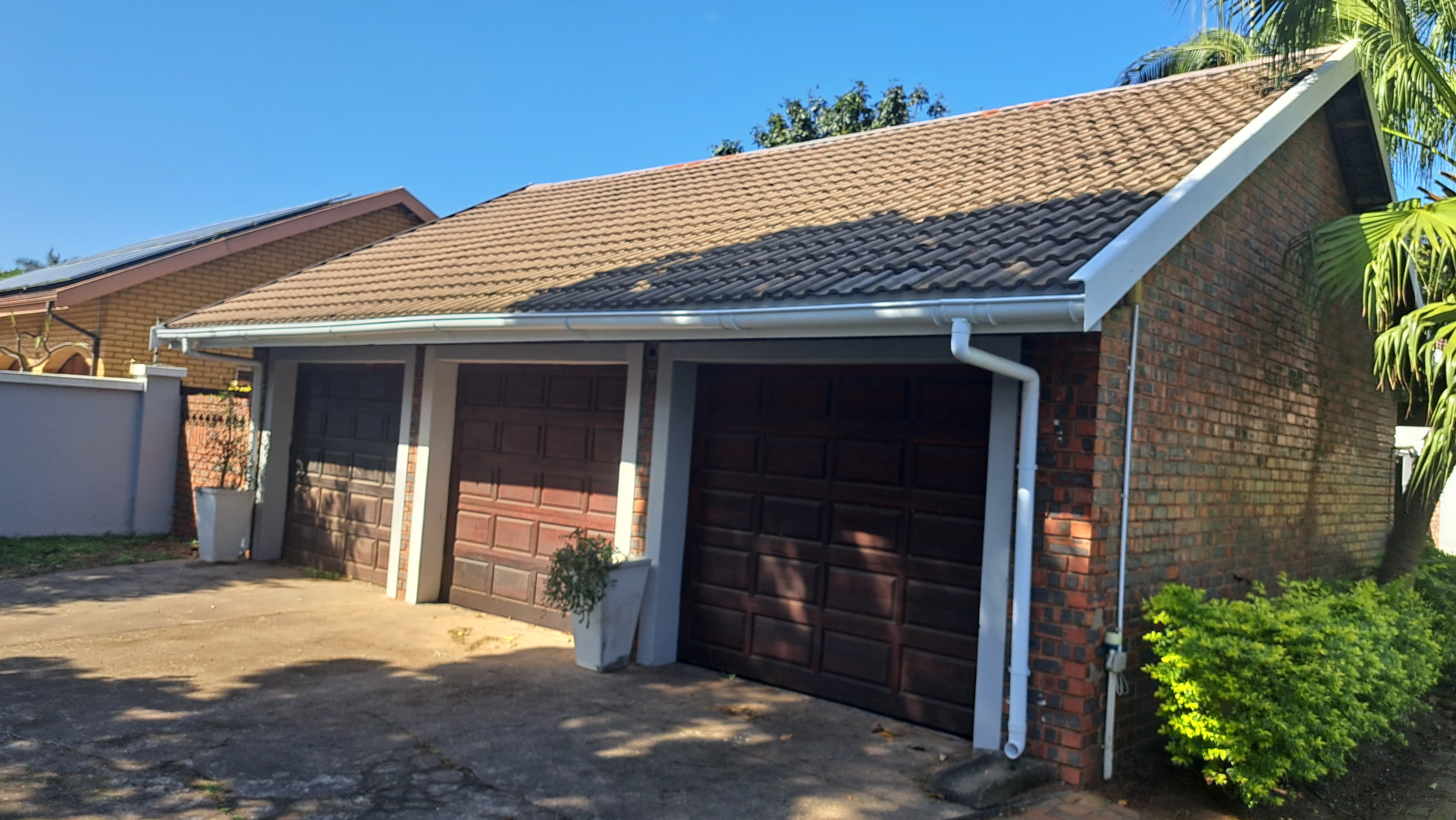 The main bedroom has a generous en-suite bathroom. Outside offers a manicured garden, easy-care pool, shaded patio, and a large storeroom. Additional features include three automated garages and a secure automated gate. Ideal for family living in a safe, well-located neighborhood.