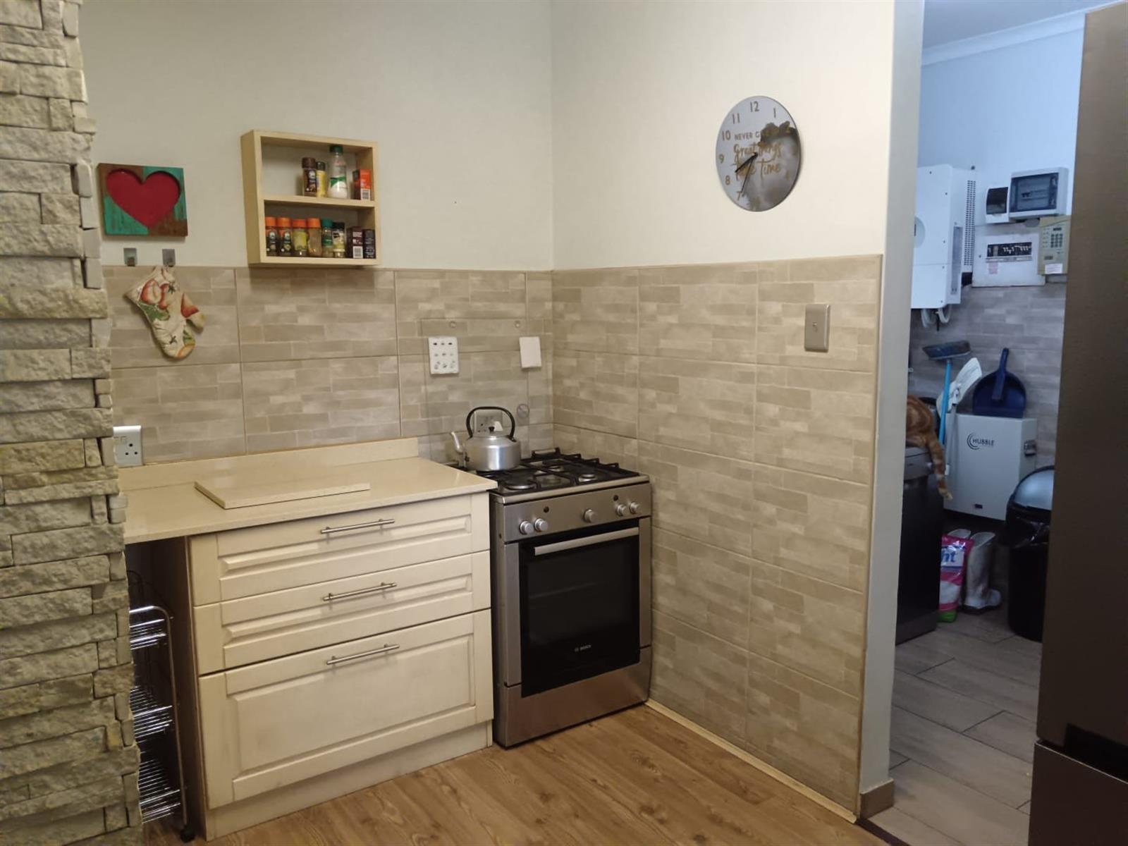 The home features a spacious open-plan layout with light-filled living and dining areas flowing seamlessly into the kitchen. The kitchen is both stylish and functional, fitted with ample cupboard space, a gas stove and oven — ideal for everyday living and load-shedding convenience.